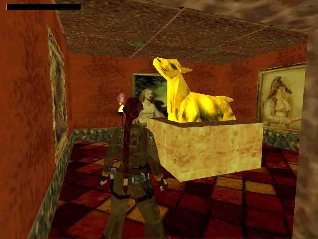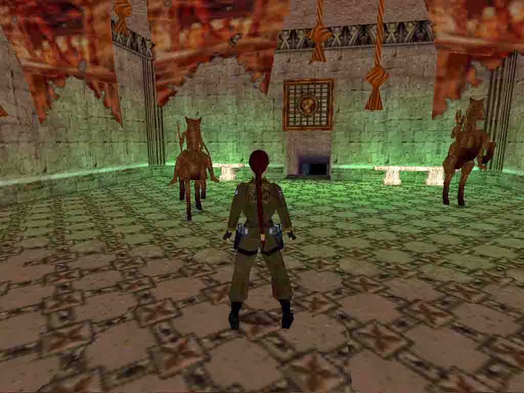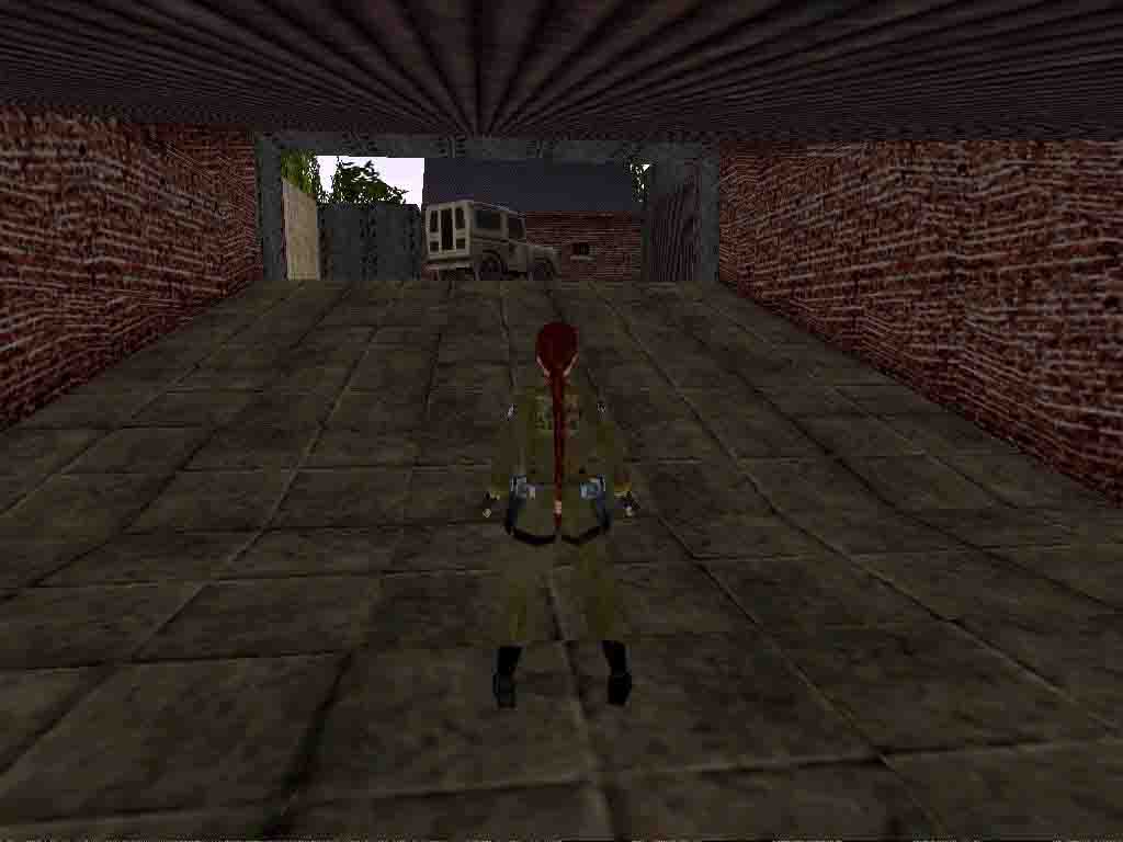 Climb up the ladder to the right, jump onto the rooftop, shimmy to the right until the line of the door and jump back. Find the Uzi and a lever above which opens the gate below. Jump into the water and pull the underwater lever. Swimming out 2 rats attack Lara. Climb up to the right and pull down the wall switch. Swimming behind the boxes find the Africanroom Key. Outside, where you climbed up you can swim through the small gap and find the secret #1: another Uzi. Use the Key outside and the Shotgun inside. Find the Egyptroom Key by the left side of the house, in the end of a crawlspace. Using it the big door opens inside. Pull once the statues toward the middle of the room and notice their places on the platform. Find the Knightroom Key in the sarcophagus. Open that room too. The iron soldier drops a Horseman's Gem which opens the trapdoor. Get through the moving walls above but find the ammo to the left and the lever at the third wall. Pull this lever. Going on to the gate in front of Lara 2 horsemen come alive. The best way is running back to the stairs where you came from and jumping on the stairs kill one of them. The other gets stuck into the wall. Stand in front of him from his hatchet and you can kill him without any lost of energy. Use what they have dropped and you have the Music Scroll. Return to the first room and use it. A doors opens in the main room. Pull down the lever inside and get the torch. Light it in the African room and light tea-lights with it on the floor. Another door opens there. Find the lever on the statue inside which opens the large gate outside. Collect the Amber Piece 1. and going toward the jeep the lever ends.
