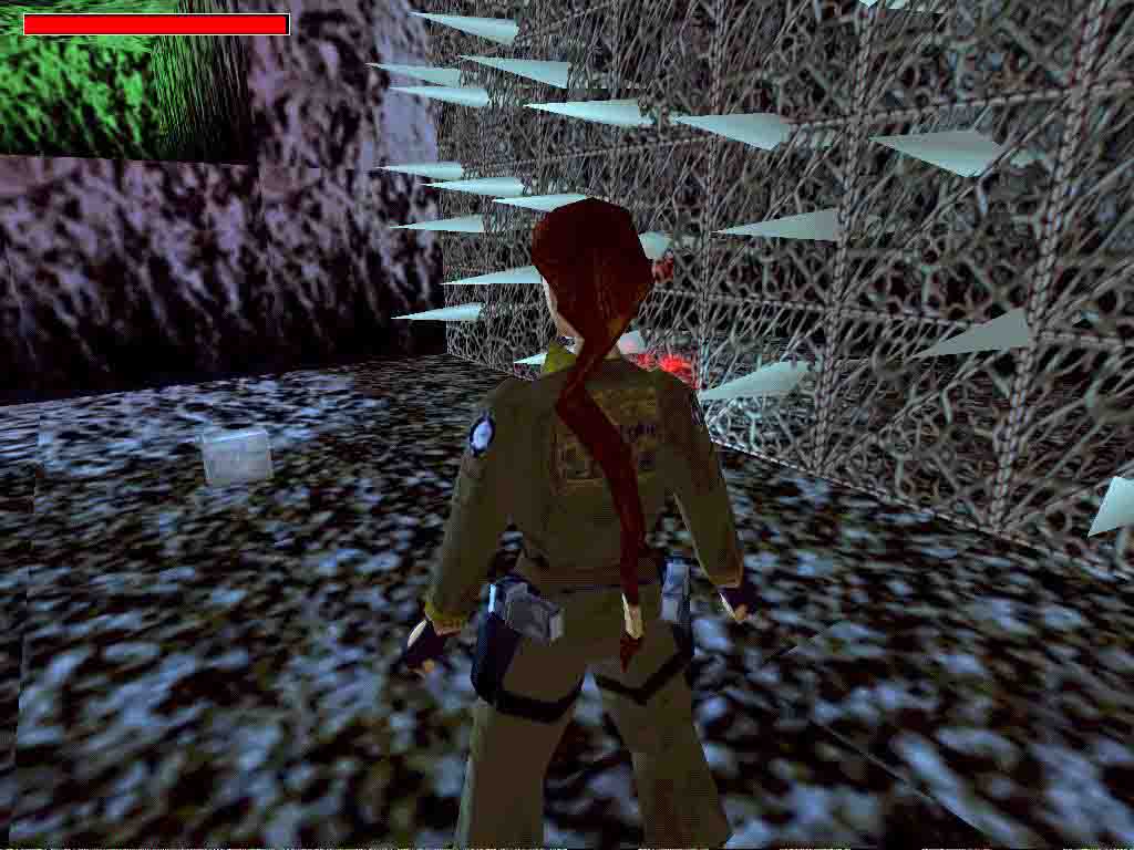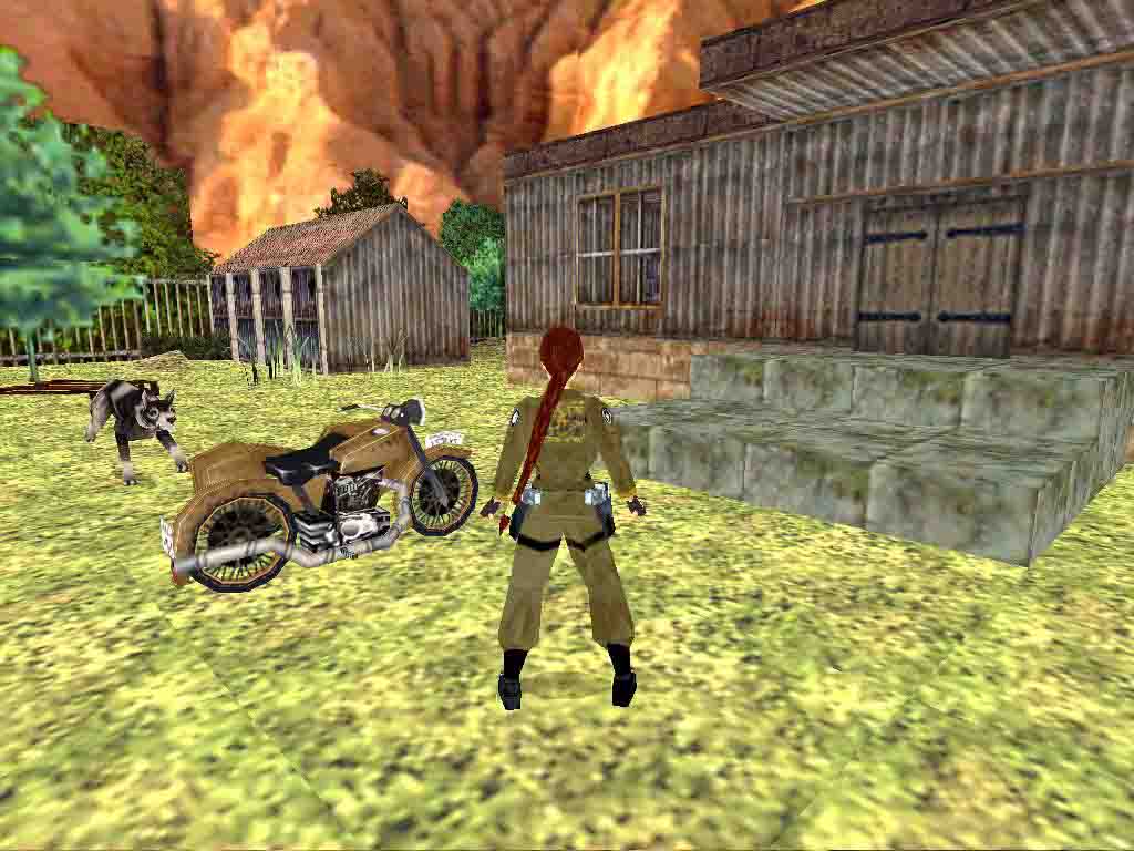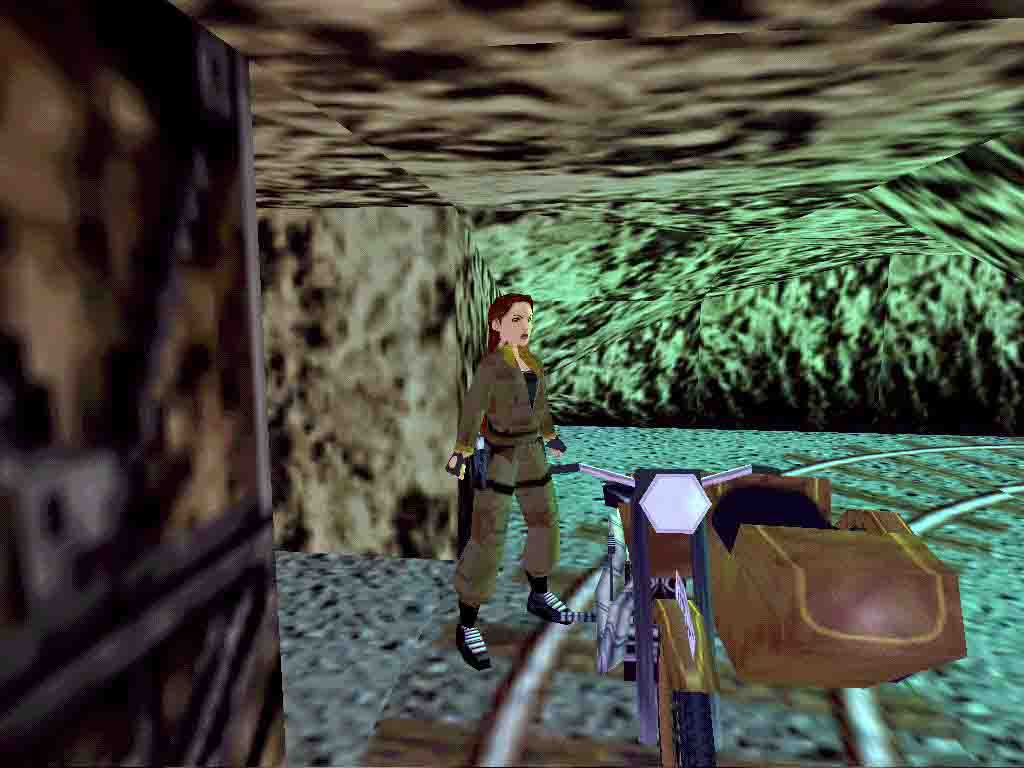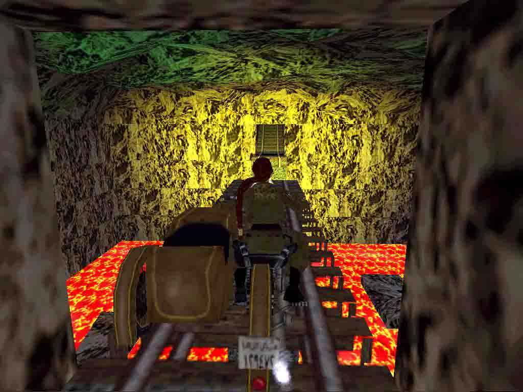 Kill the dog and get behind the big house. Certainly you can pop in the smaller building meantime. Force the door open with the Crowbar and find the Mine Key behind the door in the middle. Use the Key next to the rails. Take care of the 2 dogs. Ride in and down the slope, over the bridge and get off the bike in front of the door with lock. Return to the junction and head to the right. In the mine jump onto the small hill, completely next to the wall. Jump ahead once and you are in the water. Find another Mine Key there. Climb up the ladder and save your game under the large slope. Slide down, jump, get the large medipack, jump into the passage before the spiked walls would horn Lara. You will have time to kill the bat inside. But it's not necessary to get the medipack now, you can return for it after getting done with the rolling stone. In the next junction jump backward on the slope and run back on the way you came so you will avoid it. In the next room the spiked wall comes from above. Pop in one of the alcoves and wait there safely. Pull the levers. Getting along you return to the place where you have left your bike. Use your Key and the level ends.