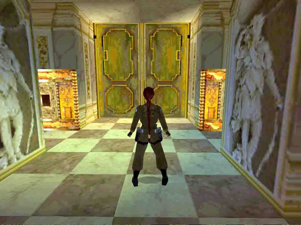 You are in the library now. Pull the lever to the left and go along. Climb into the crawlspace and pull down the wall switch on the other side. Climb into the gap and find the lever. If you succeeded in time you can return the way you came anyway you must choose the crawlspace. Another soldier welcomes Lara. Notice the 2 moveable boxes. There's a lever behind the right-hand box and a door behind the left one. Continue your way and the first level finishes.