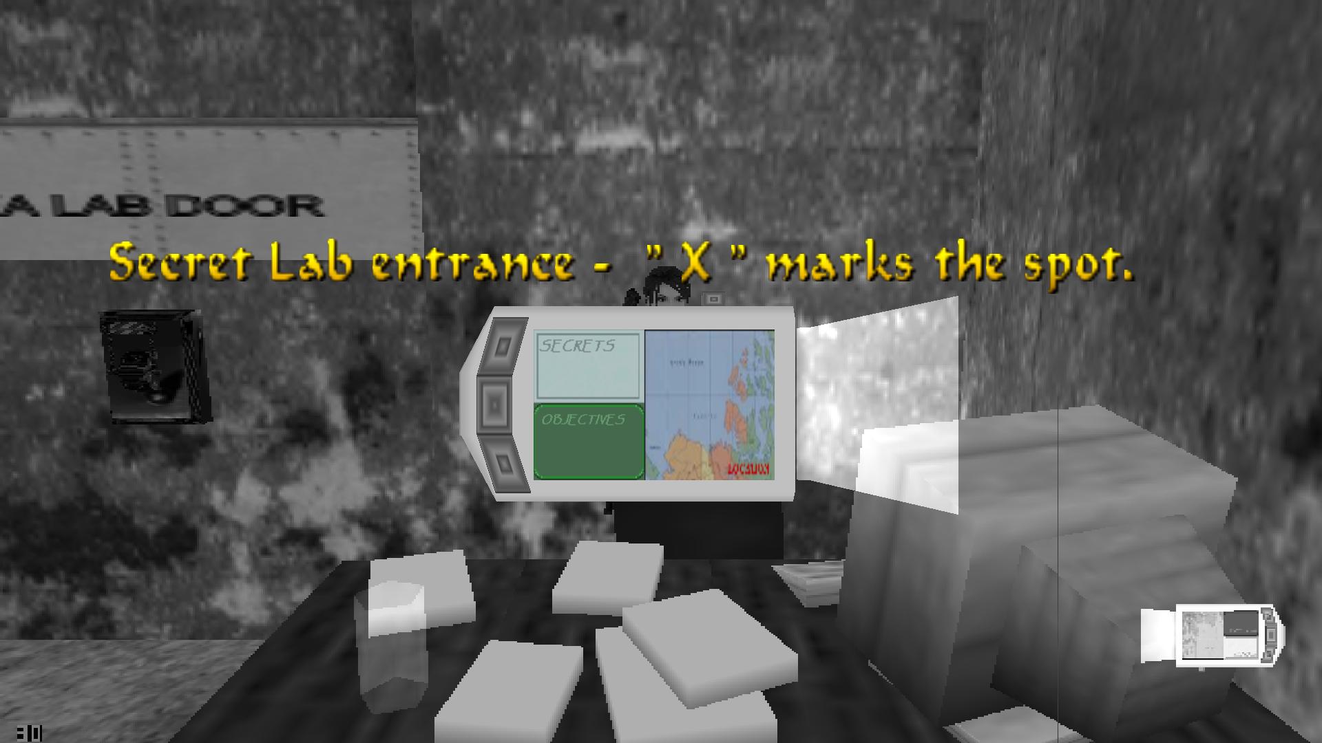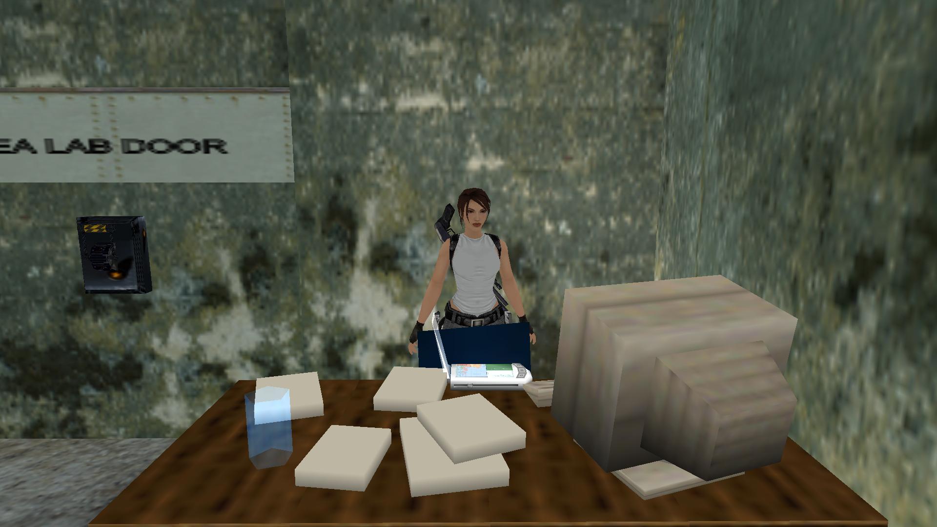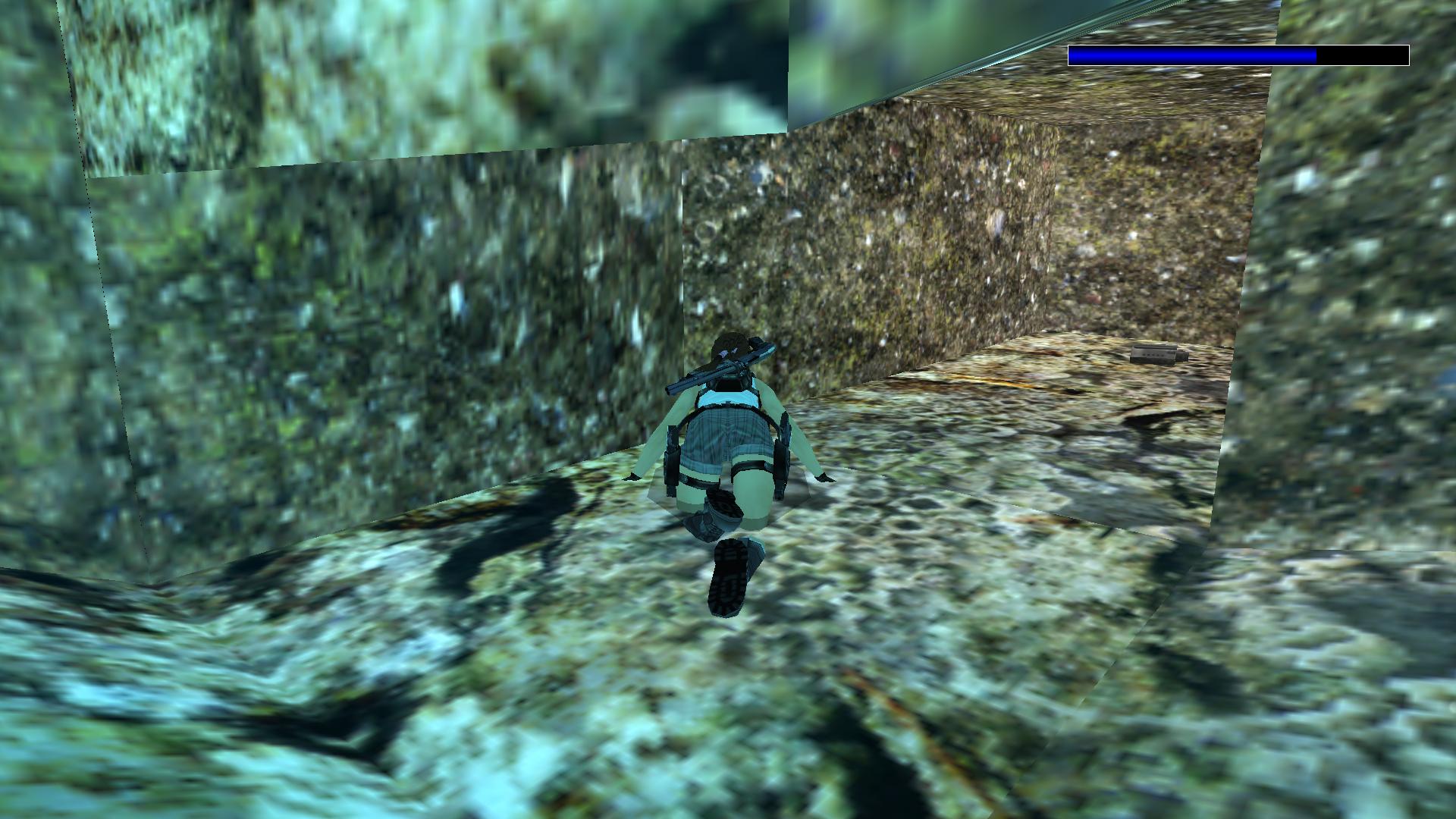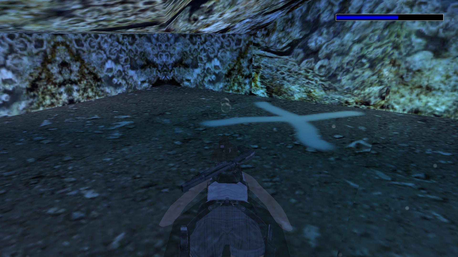 Ugrás a tóba, és az épület alatt ismét találsz jobbra egy rést, amin beúszva látsz egy X-el jelölt rejtekhelyet. Ott ússz le a mélybe, ott nyitottad ki az egyik ajtót. Beértél a laboratóriumba.