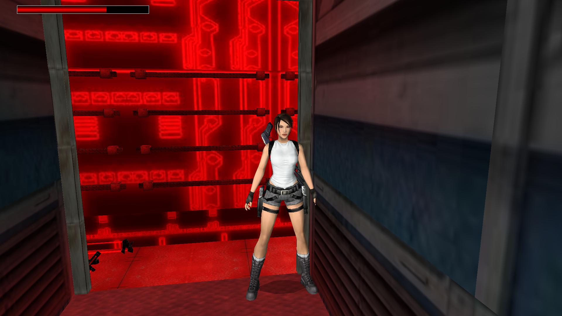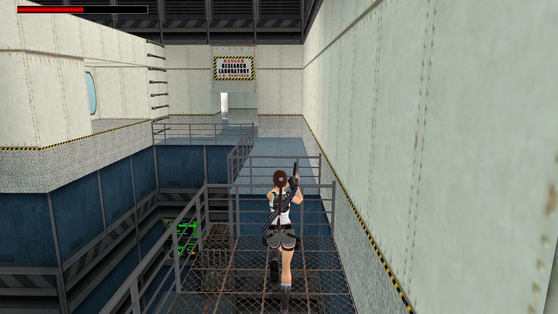 Mássz ki a vízből jobbra, lődd le a fegyvereseket, Az egyik asztalon lőszert, egy másikon nagymedipackot találsz, utána újabb két fegyverest kell megölnöd, majd bemenve ahonnan jöttek, a polcról leemelhetsz újabb lőszercsomagot. A bejárat mellett mássz fel, és nyomd meg a fali kapcsolót. Perdülj meg, és futás a terem túloldalára, be jobbra a kinyílt folyosóra. Felugorva juss fel a felső folyosóra.