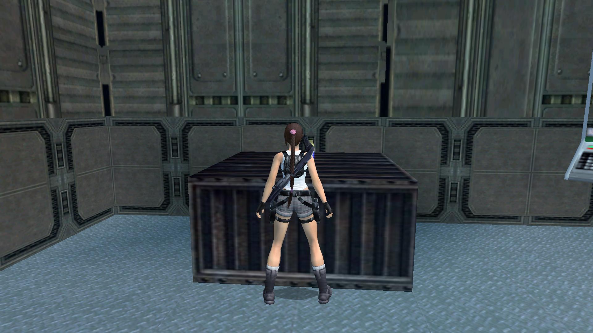 Menj át ez előtted kinyíló ajtón át a másik terembe, lődd le a fegyverest, és nyomd meg a fali gombot. Menj ki, a ládákon át juss fel a felső raktárba, mássz át a mozgatható láda túloldalára, és menj ki a szabadba.