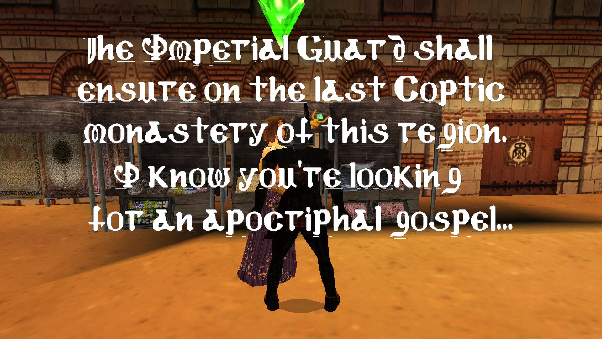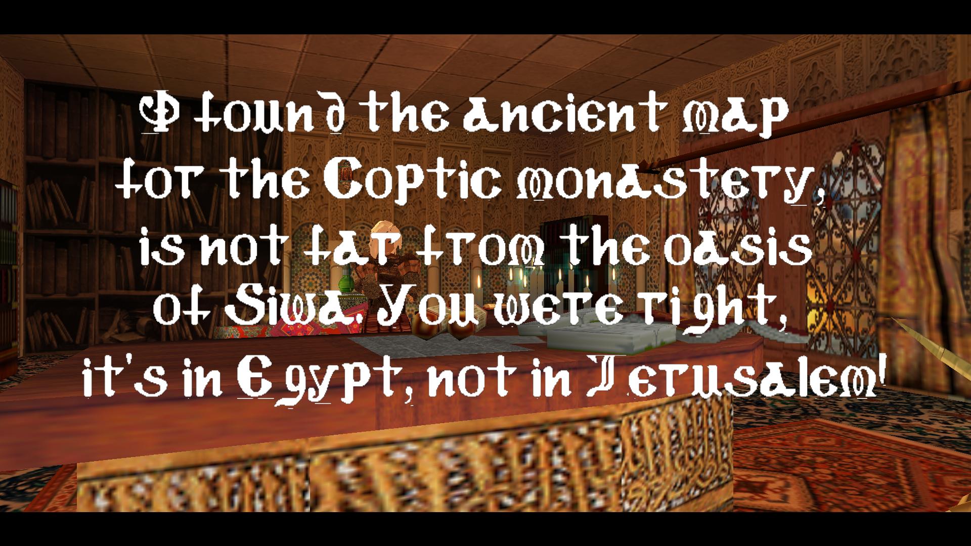 Irány vissza a falikaros terembe, és balra a beugróban használd a kulcsodat. Húzd ki a ketrecet a kinyílt ajtónál, lökd le a megölt lovaghoz, húzd, told ki ott a homokos terembe, rá a mintás padlólapra. Visszamászva a falikaros terembe, jobbra egy újabb ajtó nyílt ki. Menj át rajta, és felveszed a földről a Tekercset, a Lost Coptic Script-et.