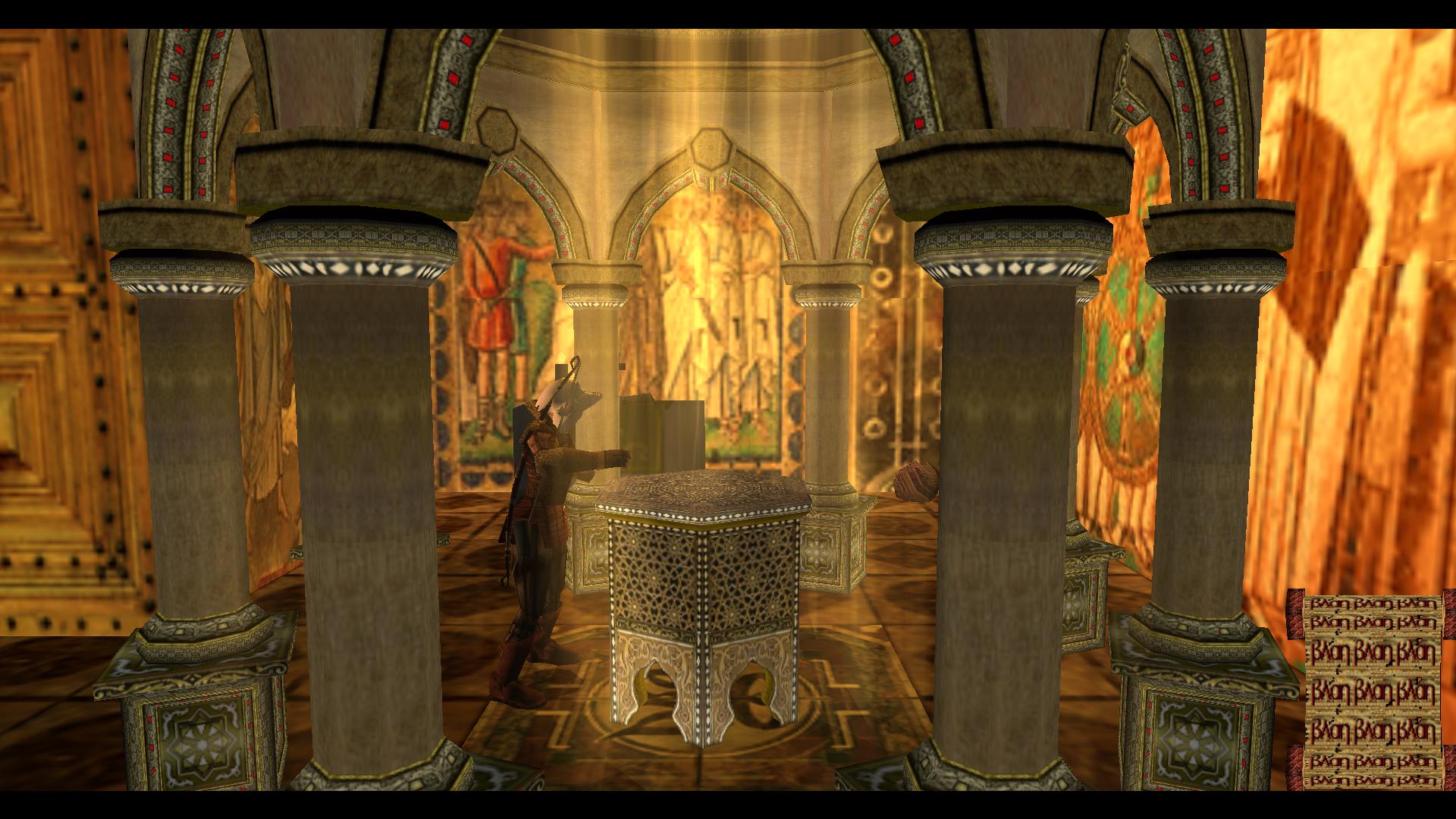 Menj ki, be balra, a folyosóra, és abban a teremben ahol a második ikont találtad, ott tedd az egyik hengert a fali foglalatba a lépcső alján jobbra. A zenehallgatás után menj fel a lépcsőn, és vedd fel az elmozdult jobb oldali kripta mögötti üregből a kék kis üvegcsét, a Myth-t.