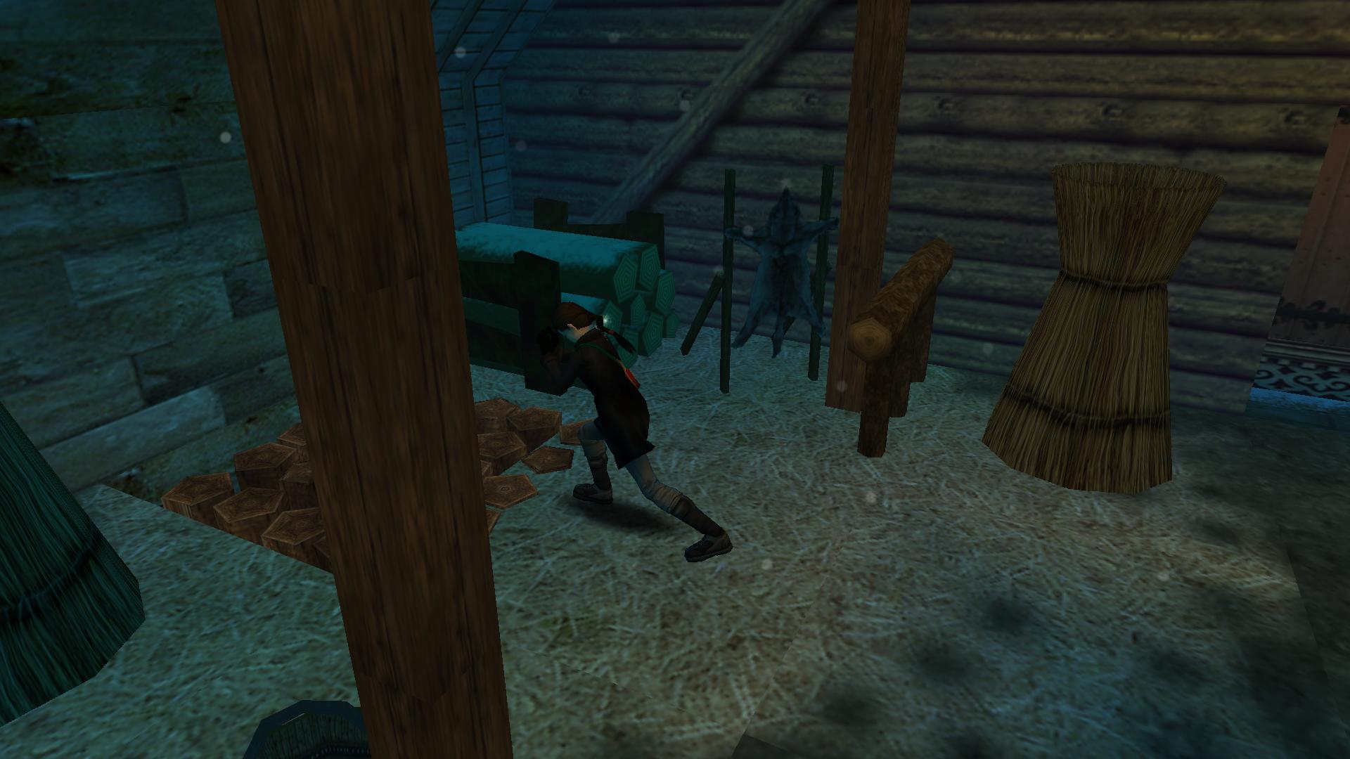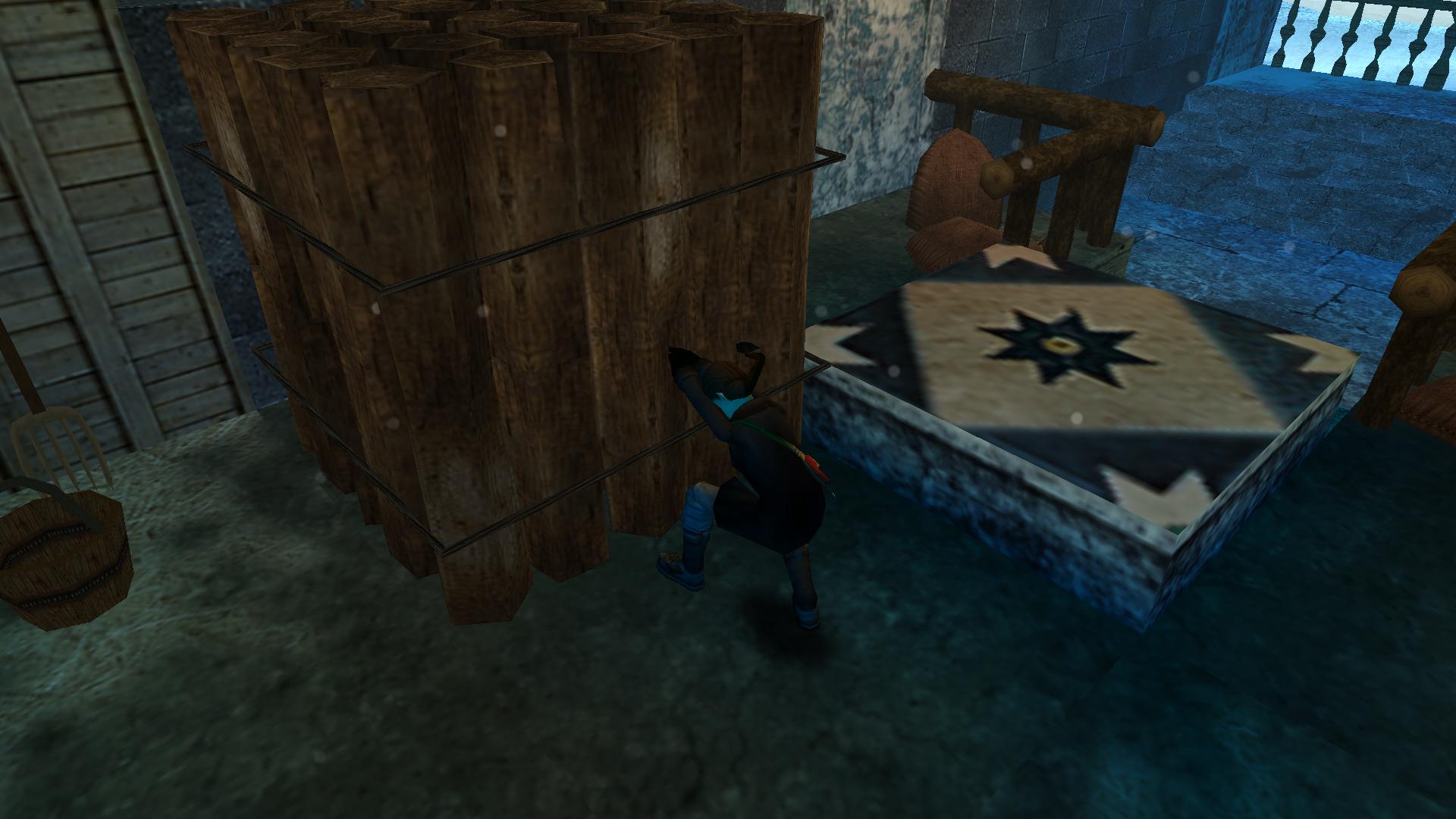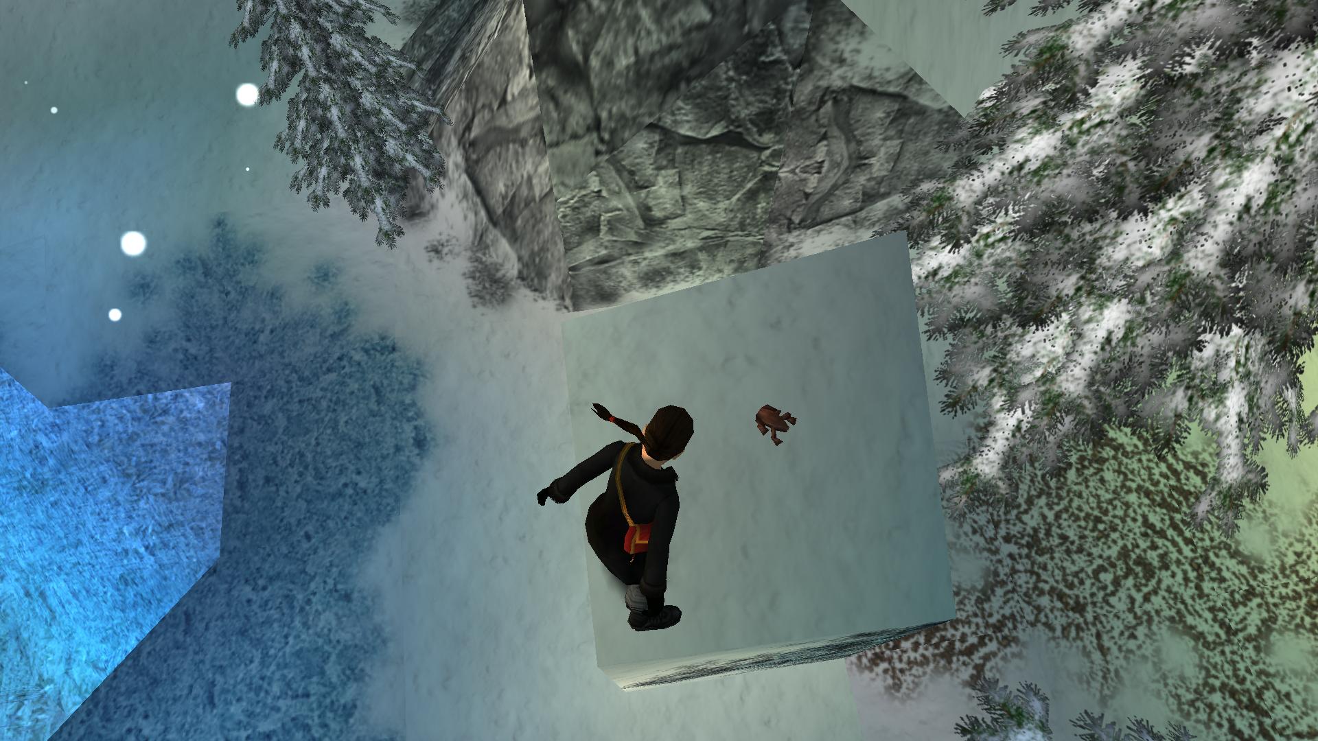 Menj ki a házból, balra, hátra menj mögé, és a sziklafalban levő folyosón, tolj párat a farakáson, ameddig csak lehet. menj ki, menj balra, be ott is a folyosóra, ugrás át a túloldalra, és a fagyos nagyteremben menj balra, az előbb tologatott farakáshoz. Húzd be a terembe, de csak épp addig, hogy felmászva a tetejére be tudj ugrani oldalt a kis oszlopra, ahol megtalálod a doboz gyufát, ami a világító fáklya a pályán. Megfordulva ugrás a másik oszlopokra, falra, menj végig, és a túloldalon is ugrás az oszlopra. Ott fordulj jobbra, ugrás a beugróba, és rántsd le a fali kart.