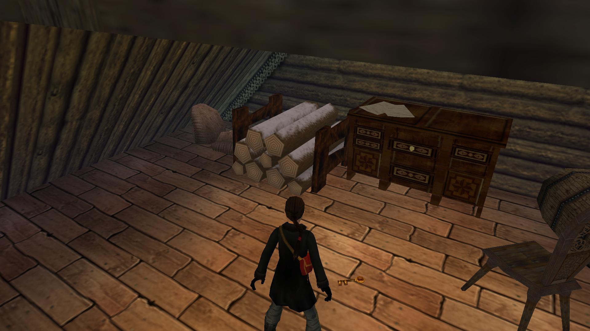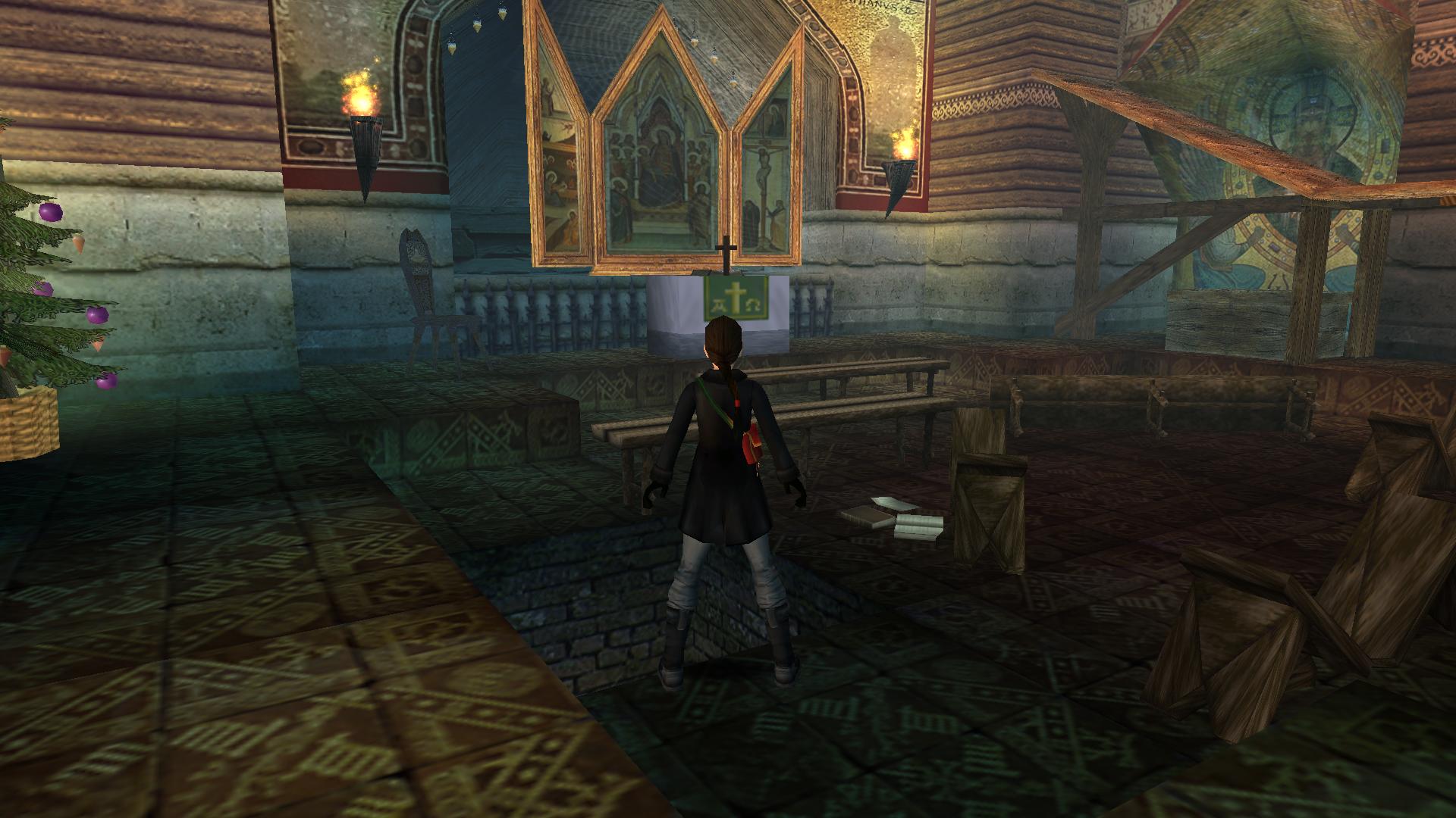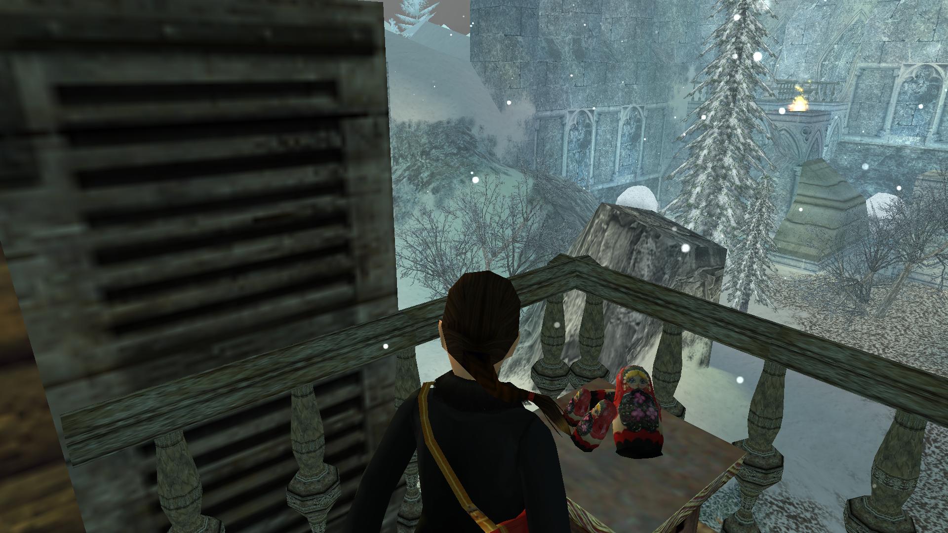 Mindjárt kombinálhatod a Matryoshki babával. Menj és tedd az oltár mögötti rejtett kis asztalkára. Menj fel a kis deszkaemelvényen, kapd el a magasban levőt, mássz fel, és ugrás a csillár alatti kötélre. Ereszkedj le a végére, célozd be a fali kart, és belengetve, ugorva rántsd le azt. Jobbra kis karácsonyfa mögötti folyosónál kinyílik a rács előtted, és bemenve a kis emelvényen megtalálod a széklábat, ami a fáklya a pályán.