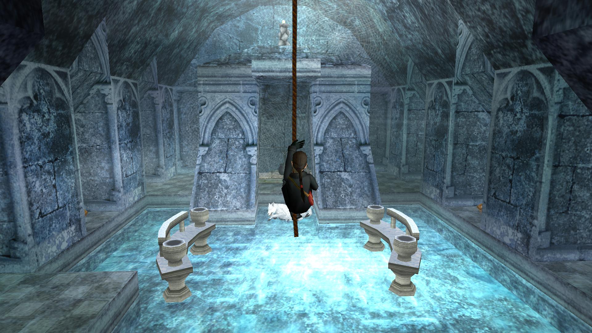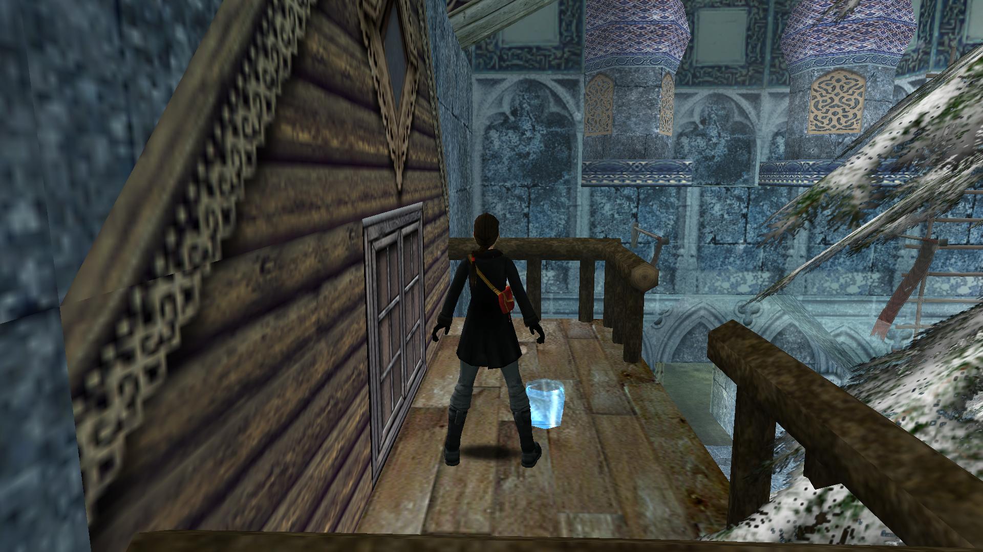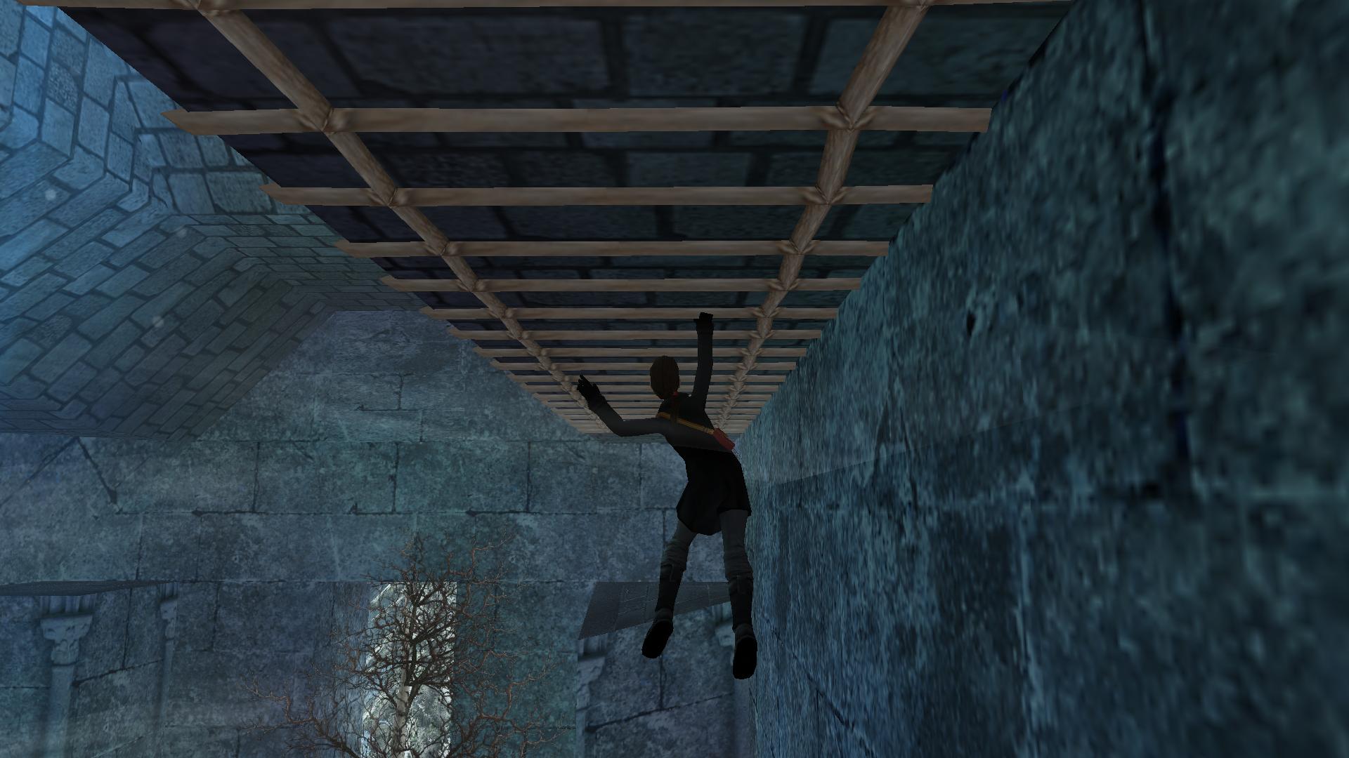 Mindjárt kombinálhatod a Matryoshki babával. Menj és tedd az oltár mögötti rejtett kis asztalkára. Menj fel a kis deszkaemelvényen, kapd el a magasban levőt, mássz fel, és ugrás a csillár alatti kötélre. Ereszkedj le a végére, célozd be a fali kart, és belengetve, ugorva rántsd le azt. Jobbra kis karácsonyfa mögötti folyosónál kinyílik a rács előtted, és bemenve a kis emelvényen megtalálod a széklábat, ami a fáklya a pályán.