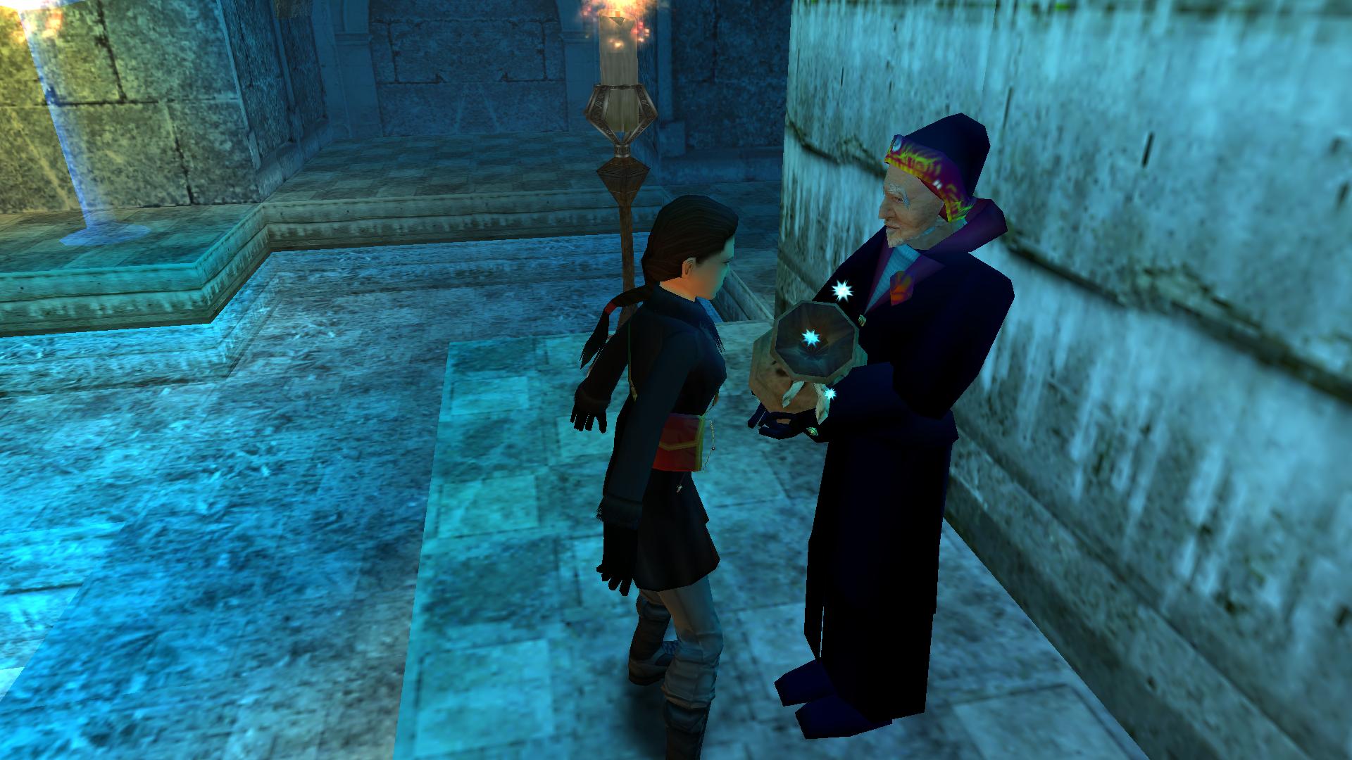 A teremben gyújtsd meg a négy gyertyát, és a két égőt, és eldobhatod a fáklyát. Add az öregember kezébe a Magic Dust-ot. És a varázslat elkezdődik. A tó úrnője kiszabadul. :)