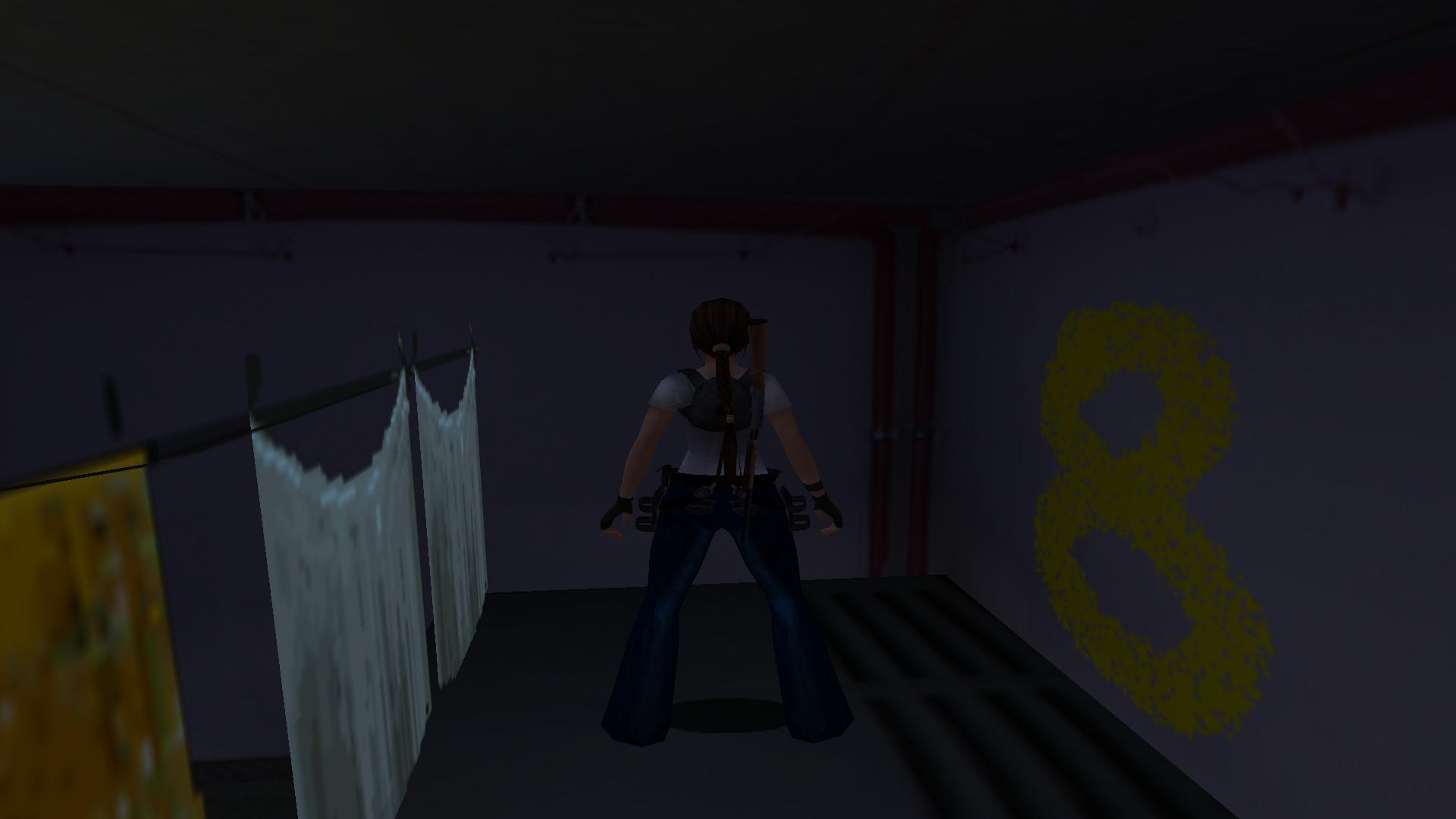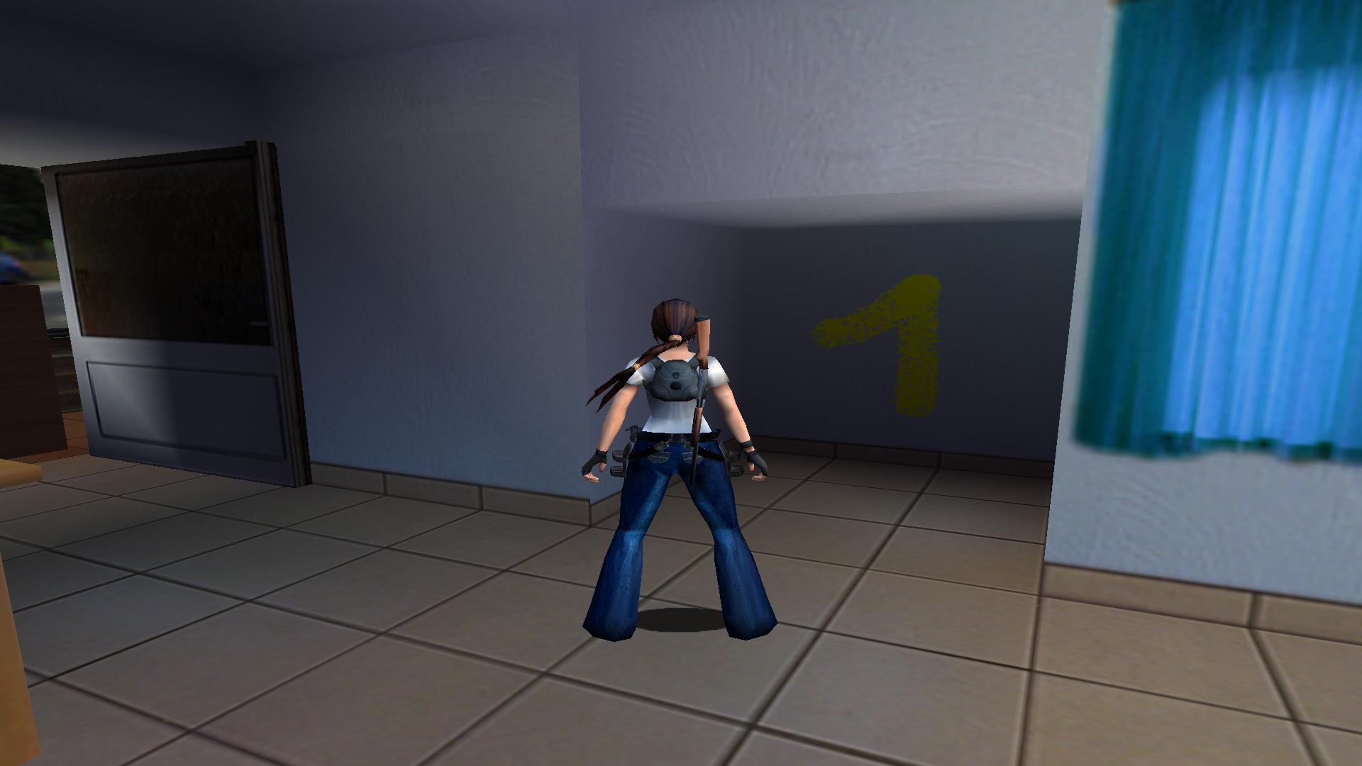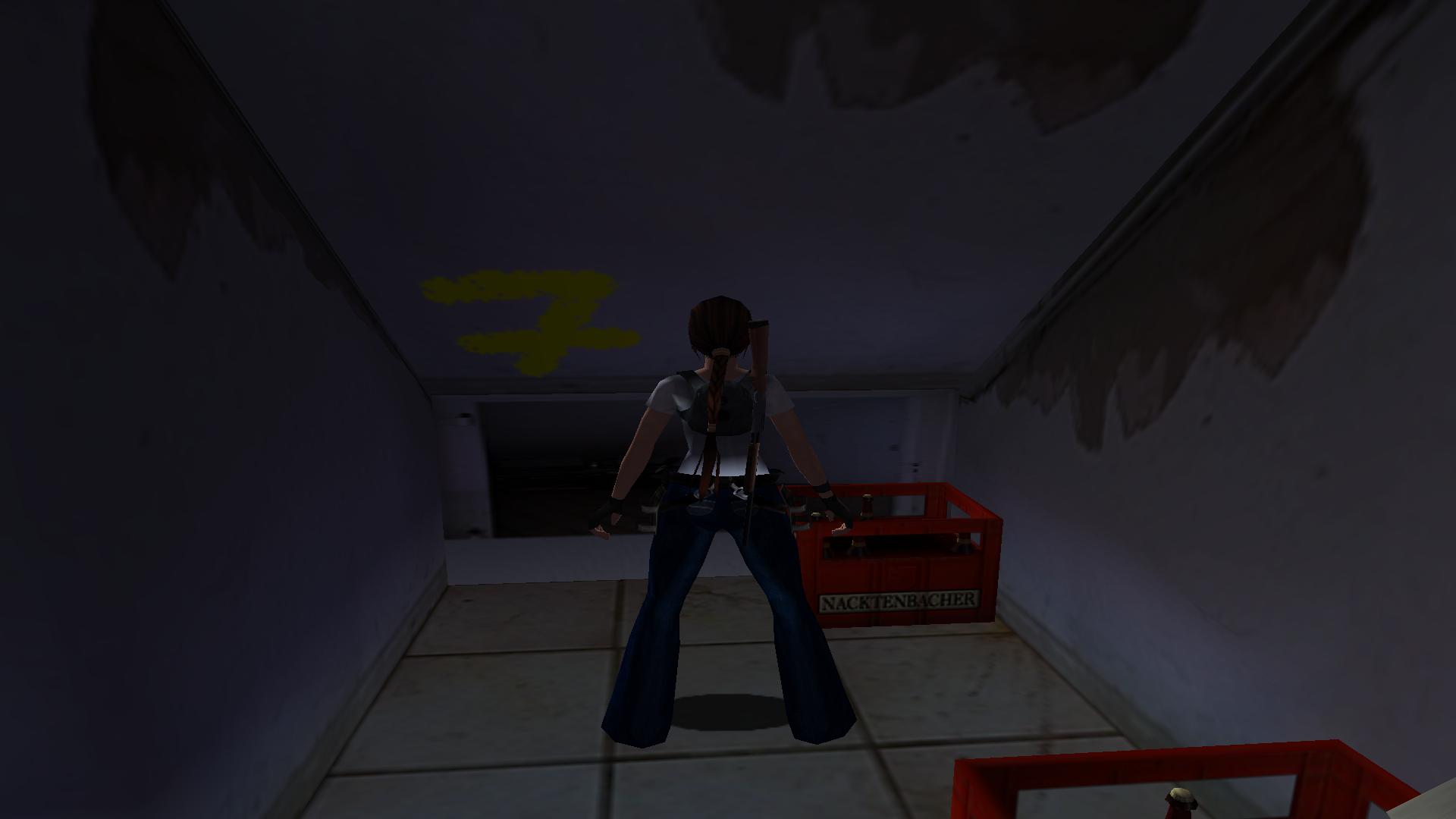 Menj ki, balra, le a ház mellett a lépcsőn, és nyomd meg a ház túloldalán a fali gombot. Menj visszafelé a ház körül, és nyomd meg a másik kettő gombot is, és fent a felső ház mögött, ahol a kukákat lőtted szét, felnyílik egy csapóajtó. Ugrás le a lyukba, rúgd be a kis ablakot, és mássz le a mosodába. A száradó ruhák mögé felmászva felveheted a fáklyacsomagot, és megnézheted a falon a következő számot. 8.