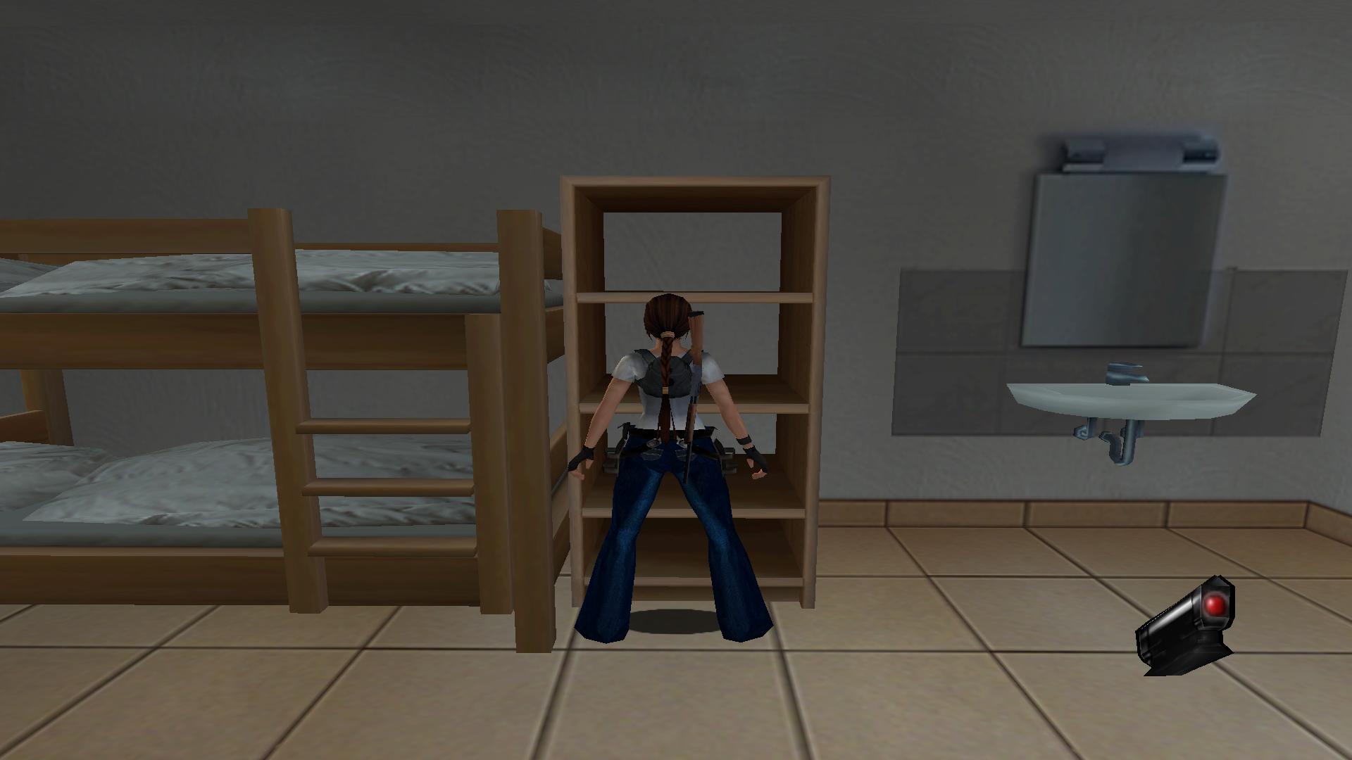 Ússz ki innen, balra, szemben ússz be a kis szobába, a felnyílt rácsnál mássz ki, fel a kúszójáratba, és balra, beérsz egy raktárba. Vedd fel balra a kis láda tetejéről a Steak-et.