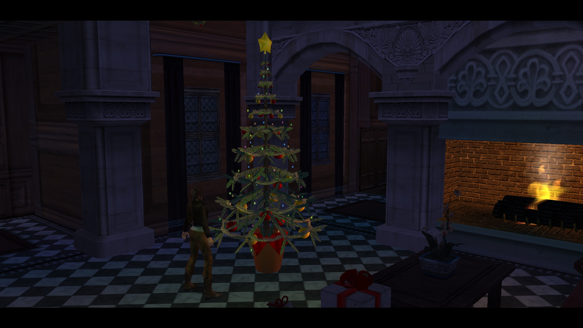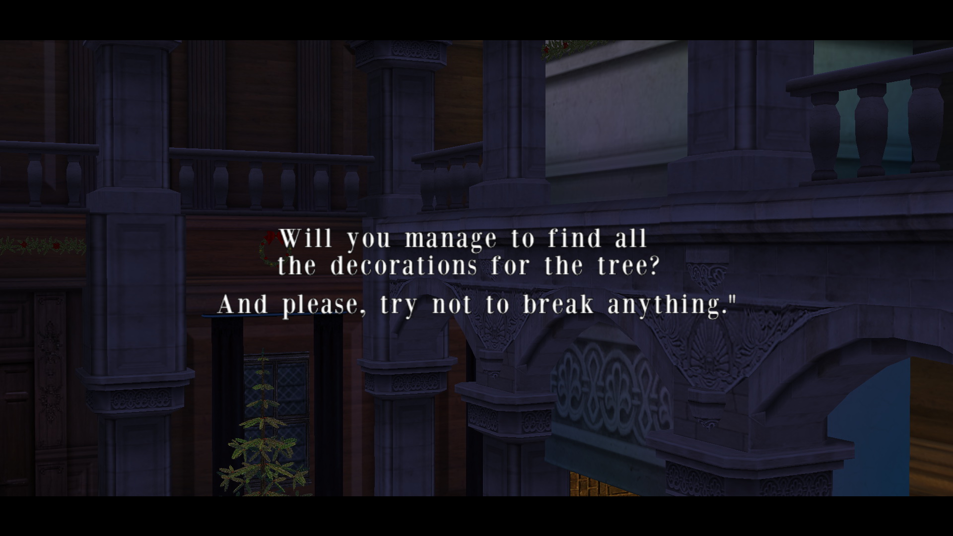 Menj ki a lépcsőházba, és a karácsonyfa mind a négy oldalához odaállva rakd fel a kellékeket, és ezzel vége is ennek a kalandnak.