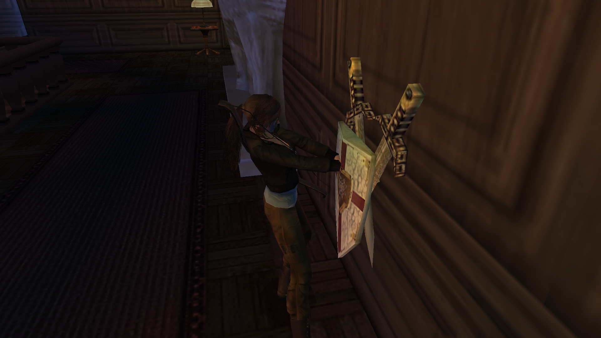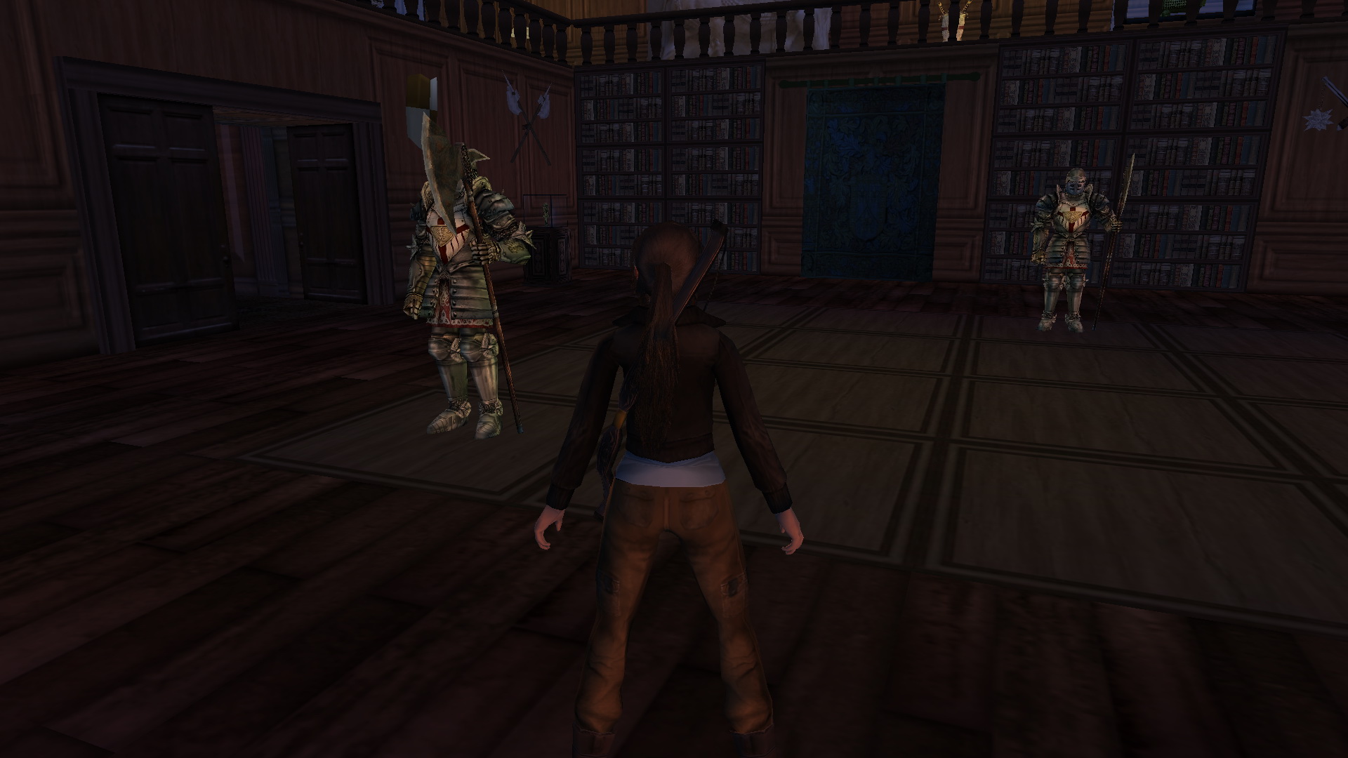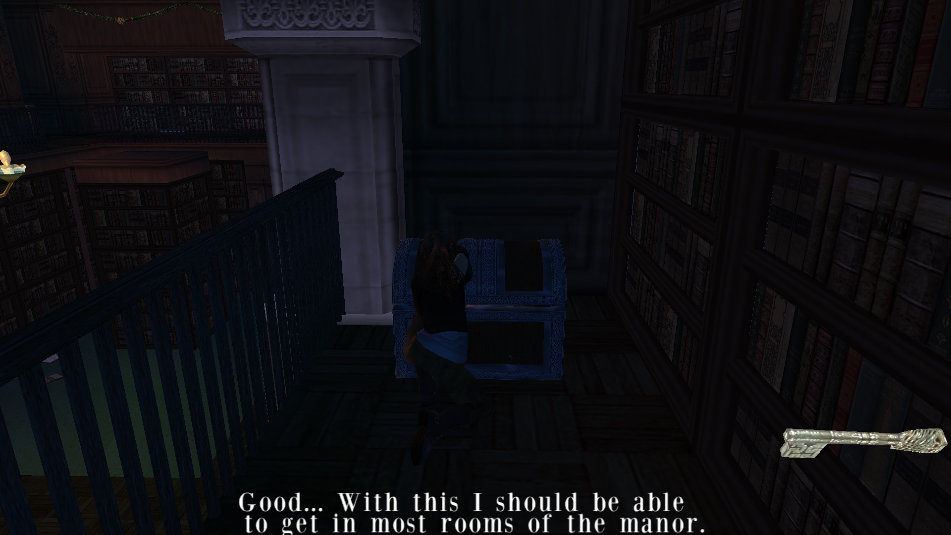 Irány vissza az alagsorba, keresd meg, és nyisd ki a kulcsoddal az ajtót. Bent tekerd meg a kereket, és a nagy medence az uszodában feltelik vízzel. Menj tovább az alagsorban, ismét juss el a kis könyvtárba, és tedd a lemezjátszóba a CD-t. Menj ki az előszobába, húzd, told a most már mozgatható páncélt, be a szobába, a lemezjátszó melletti padlólapra. Mássz fel ismét az emeletre, és a megnyílt könyvespolc mögött felveheted a kis emelvényről a Bow-t, az Íjat.