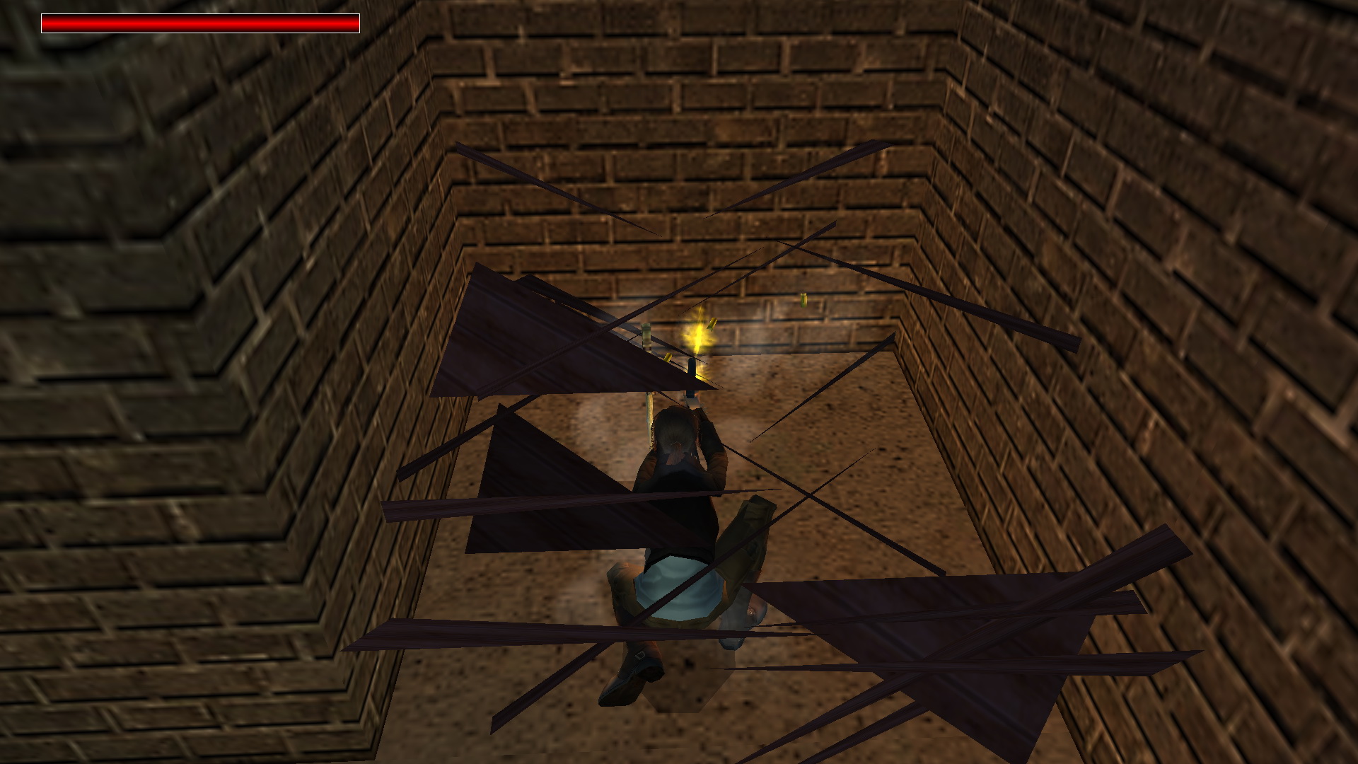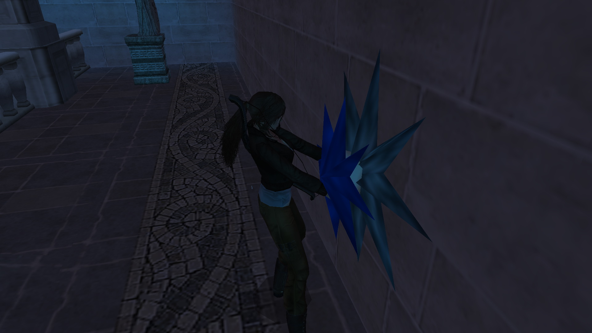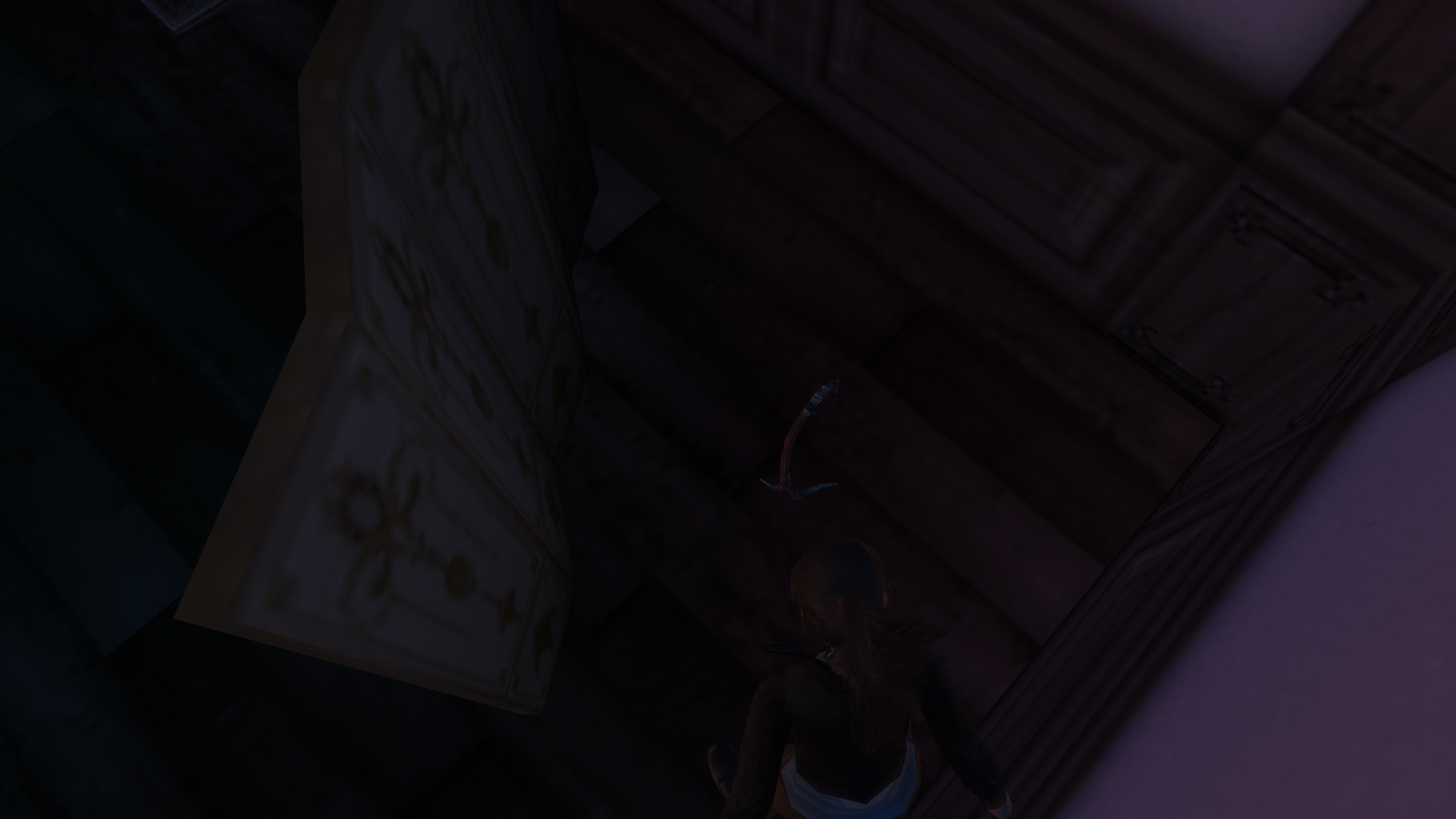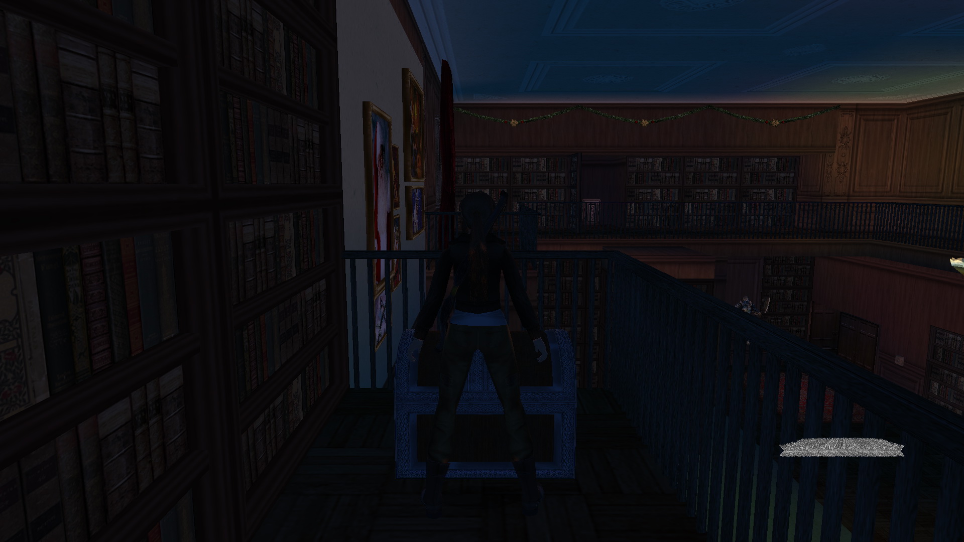 Jobbra kapaszkodj fel a kis oszlopra, bújj át a kúszórésen, a túloldalon kapaszkodj le, majd egy ugrással elkapod a felső tömböt. Fordulj meg, és a rúdon át eljutsz a sarokban levő oszlopra. Ott balra fordulj, nekifutásból kapd el a rést a másik oszlopon, csimpizz át a túloldalára, és nekifutásból eljutsz a következő platformra, ahol megnyomhatod az első gombot. Juss le a földszintre, és ismét a kúszórésen át kell hogy feljuss a felsőbb tömbre. Most azonban ott még feljebb kapaszkodj, kapaszkodj fel a fali repedésbe, csimpizz balra, egészen a túloldalra, és a lefelé gombot megnyomva, Lara megfordul, és átugrik a másik sarokban levő platformra. Kapaszkodj fl a plafonra, csimpzz át a túloldalra, és megnyomhatod a második gombot. Juss le, és most az ablak altti oszlop résébe kapaszkodj fel, feljebb ugorva fent is vagy rajta, majd balra ugrás az oszlopra, csimopizz át a túloldalára, és hátraugorva megnyomhatod a harmadik gombot is. Irány le, és megint a kúszórésen át juss fel a magasba, ismét kapaszkodj a fali résbe, és jobbra csimpizz el addig, amíg csak megszűnik a rés. Legalábbis úgy látod. No ott ugorj hátra, és akkor a felemelkedett platformon landolsz, és felveheted a 2. Karácsonyfadíszt, a Light-t.