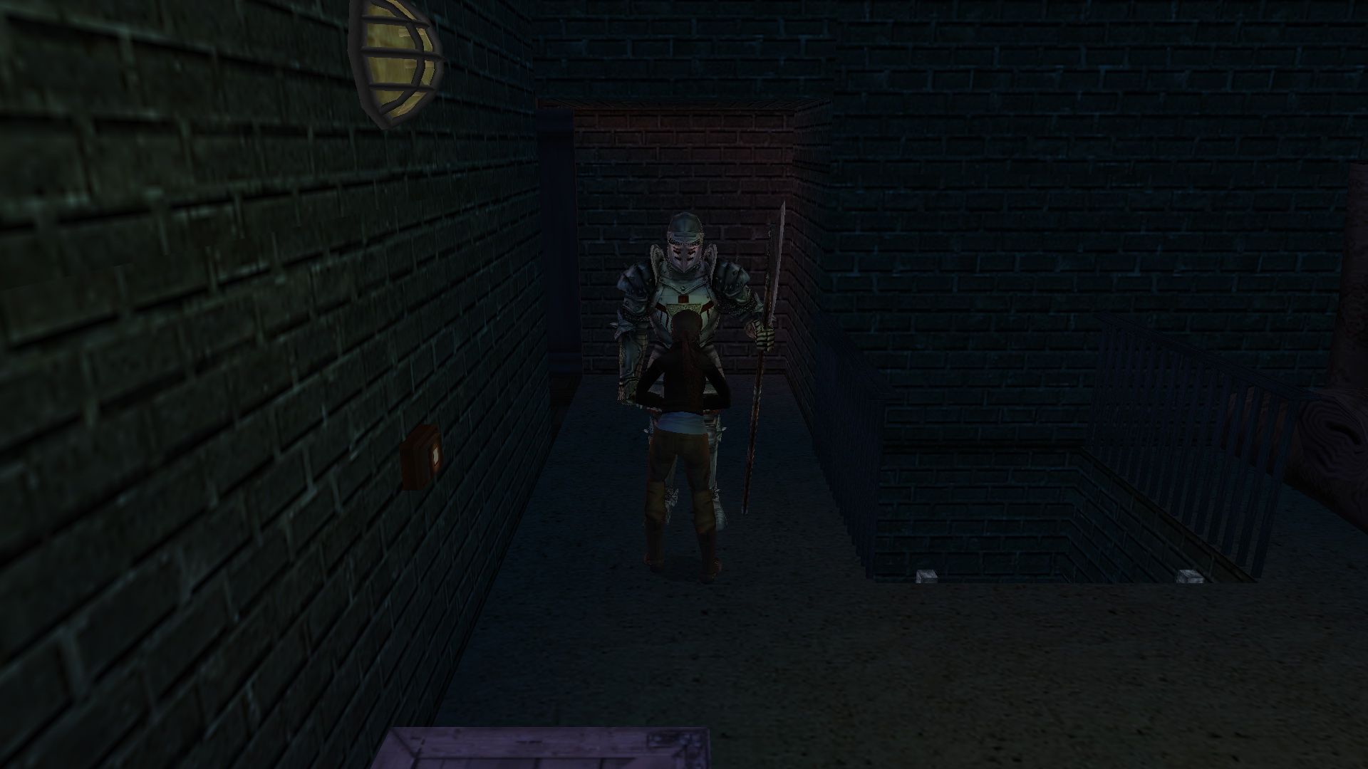 Kimenve menj jobbra, és a széles oszlopon fent látsz egy kis pajzsot. No az egy kapcsoló, felugorva rántsd le. Menj most az emeleten, a lépcsőnél a másik irányba, ott nyitottál ki egy kis ajtót, ami levezet a földszintre. A fali gombbal nyisd is ki az ajtót, de ne menj ki, inkább menj le balra, az alagsorba.