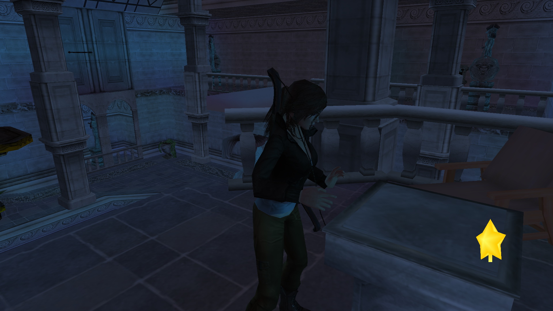 Húzd meg a kapcsolót, gyorsan fordulj balra, rohanj a medence fölé, ugrás a vízbe, és gyorsan ússz be a lassan bezáruló rácson, és húzd meg a plafonkart. Ismét juss fel a karzatra, most jobbra menj, és nekifutásból ugorj a fali karra, de a kapaszkodást csak az utolsó pillanatban nyomd meg. ha sikerült, ugrás tovább a halszoborra, majd a következő rúdon át a túloldalra. tedd a kék csillagot a foglalatába, és menj ki az magasugródeszkára. A középső platform lejjebb ment, így nekifutásból el tudod kapni, majd jobbra átugorva a másik karzatra, felveheted a 4. Karácsonyfadíszt, a Golden Star-t.