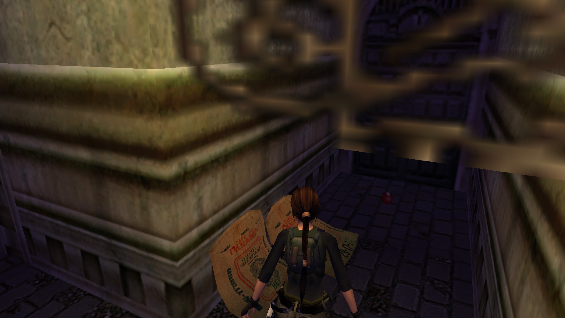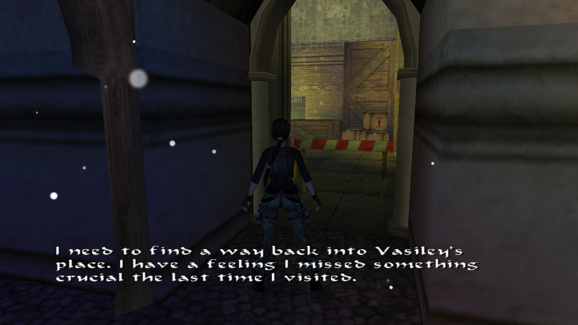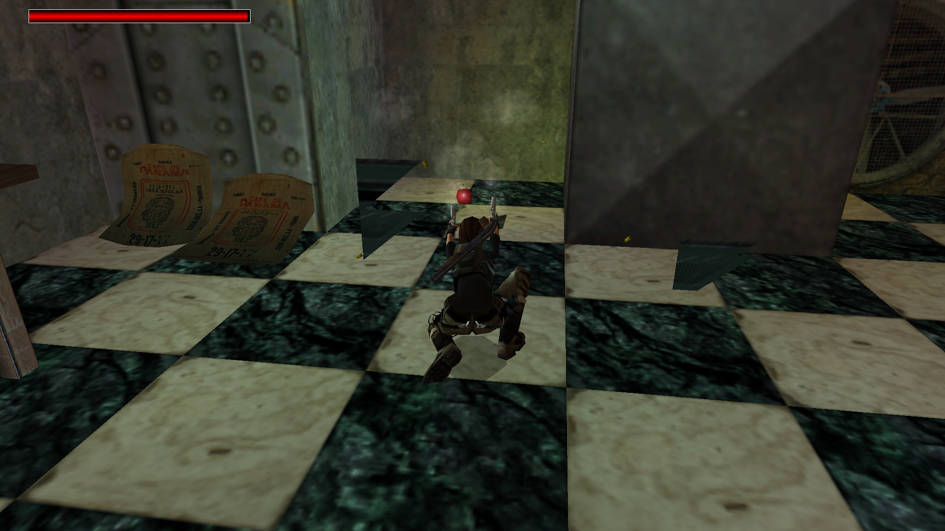 Menj le a lépcsőn, és szemben, a tér bal sarkában menj be a folyosóra, ugord át a kerítést, és egy raktárba érkeztél. Balra egy láda mögött vedd fel a csokit, ami a medipack a pályán.