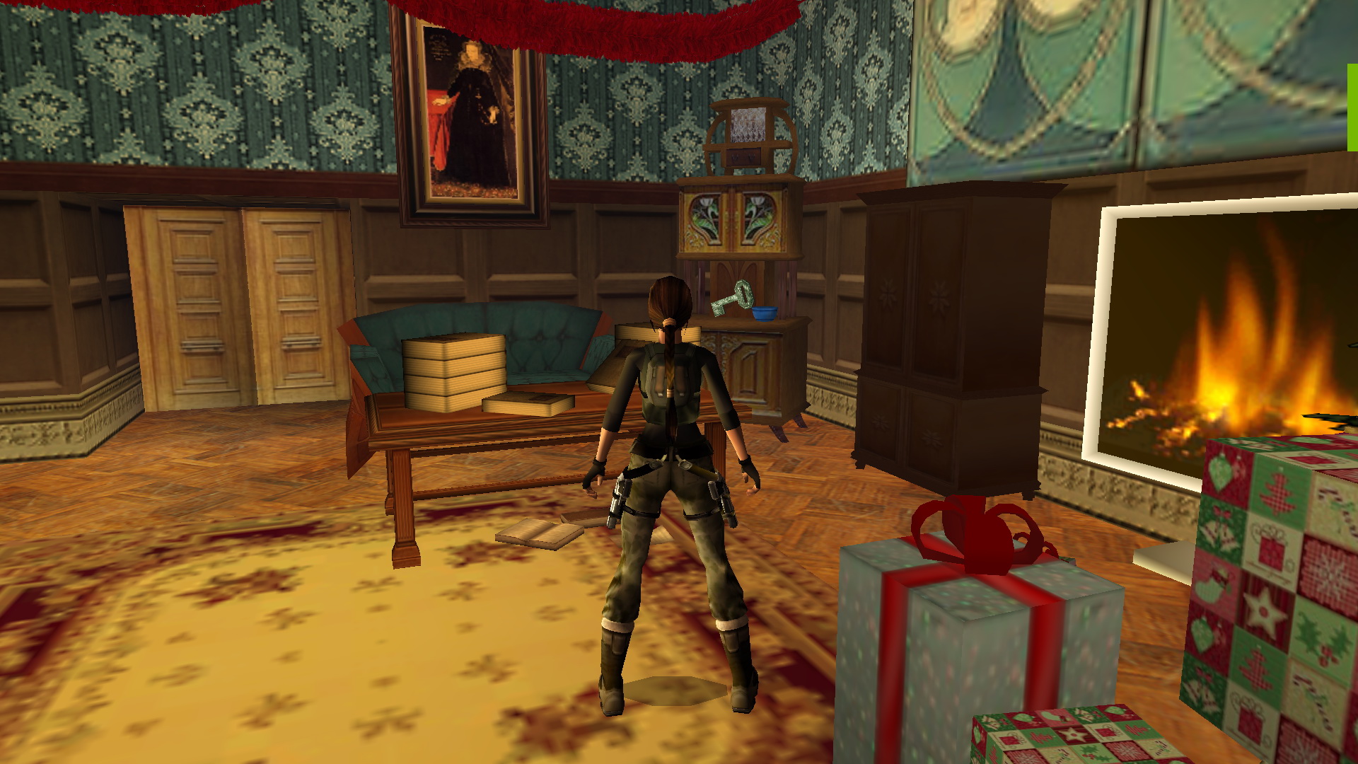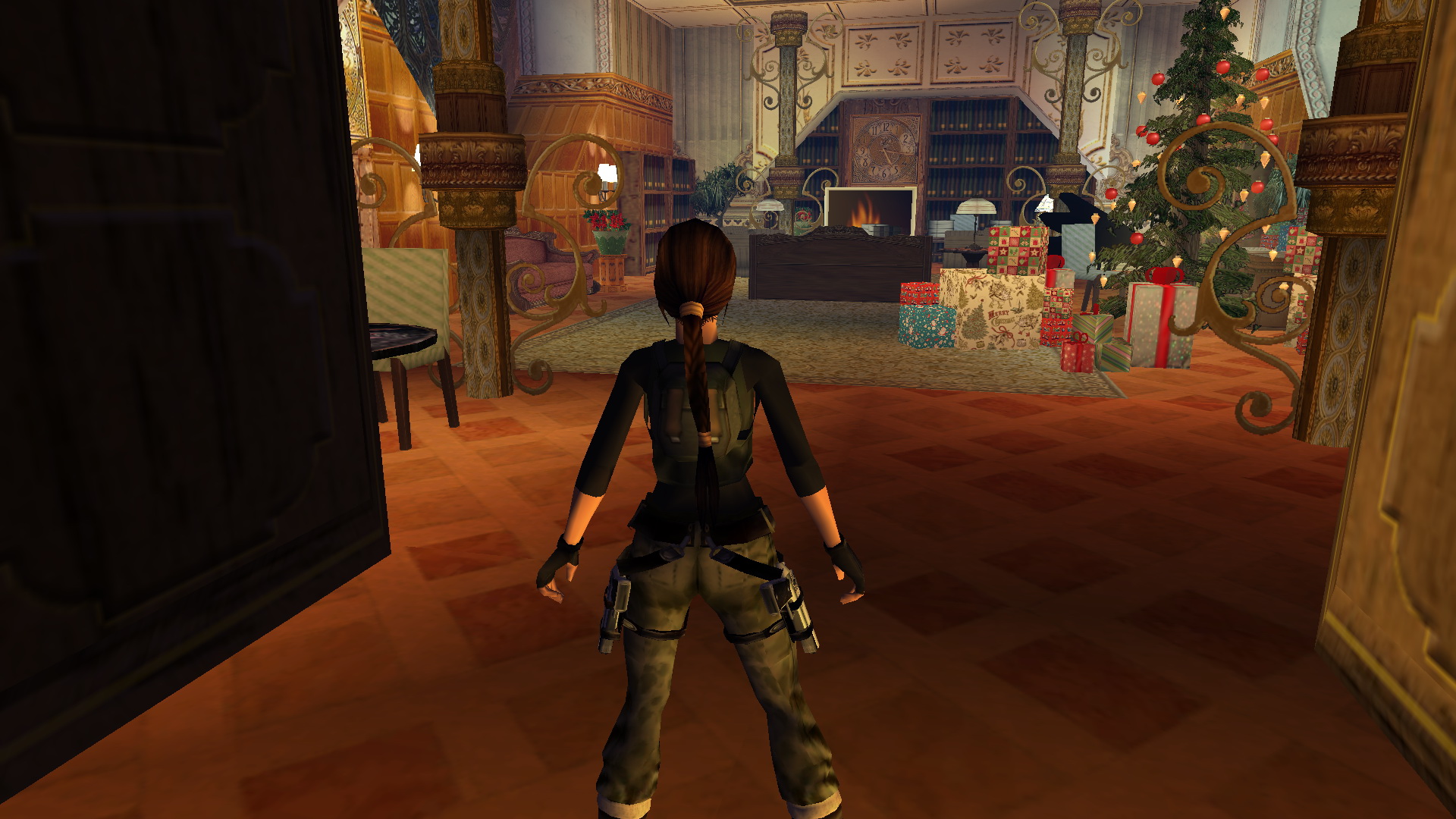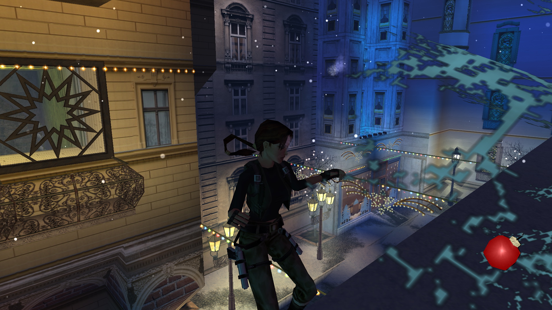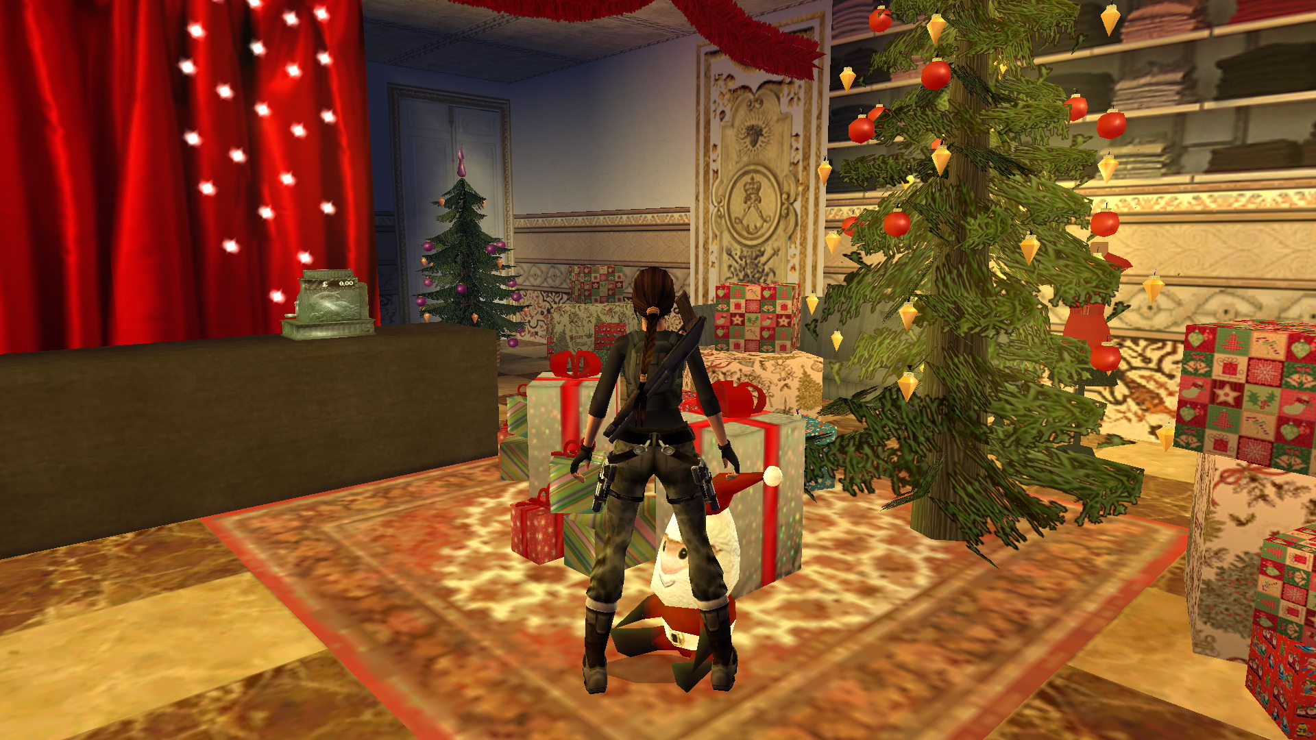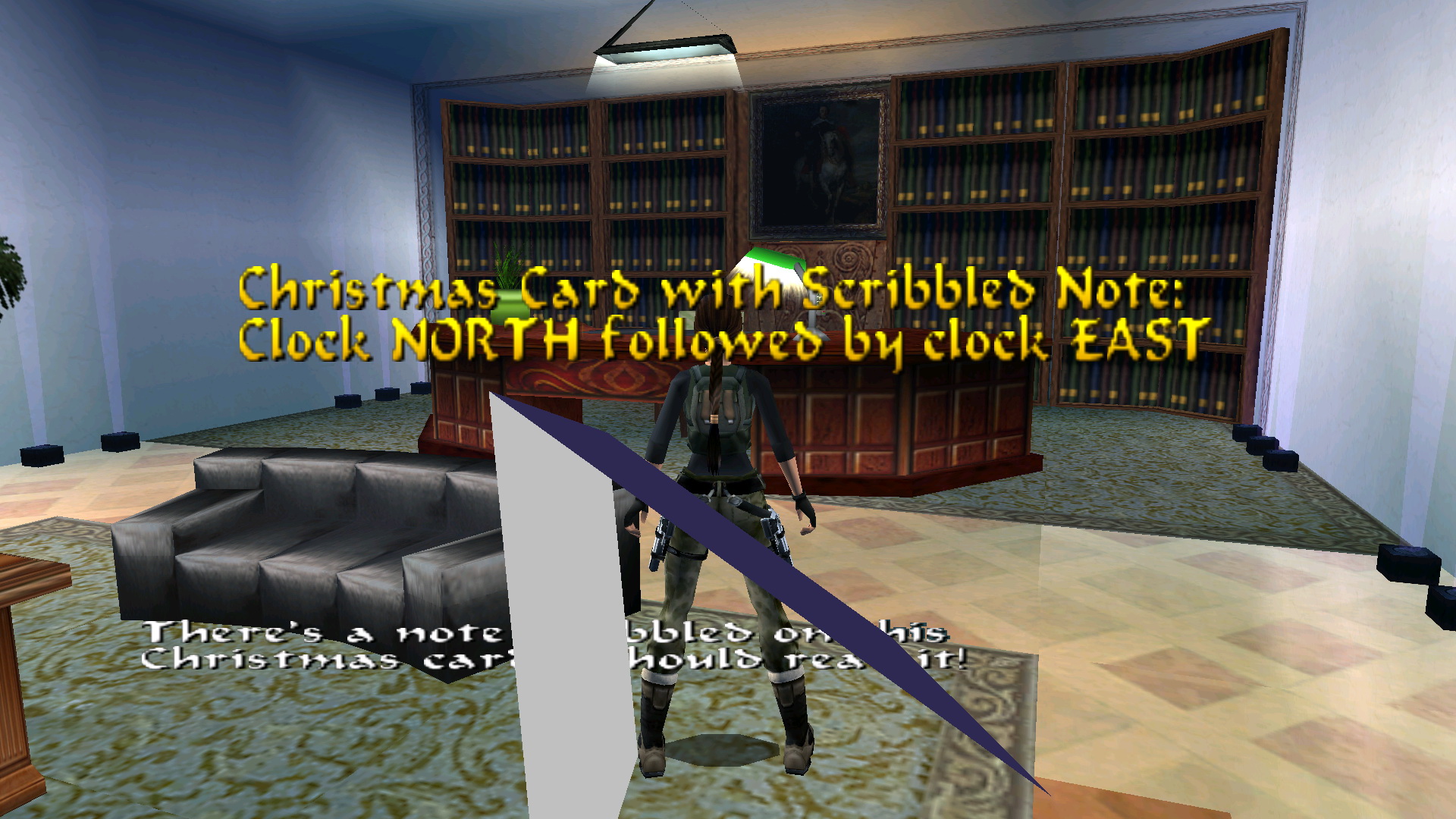 Menj a létrához, és mássz fel. Húzd meg a kötelet, így egy platform emelkedik fel az ablaknál. nekifutásból kapd el, juss át a túloldalra, és a ládán át feljutsz az állványra. ugrás a csillárokon át a túloldalra, és nekifutásból rántsd le a fali kart. Megnyílt a másik állványnál a fali rejtekajtó. Juss hát megint át oda, és húzd meg ott is a kötelet. Felemelkedett még három platform, viszont lement az első. Juss hát vissza megint az első kötélhez, és ismét húzd meg. Most már fent van mind a négy platform. Lent a fölszinten is megnyílt a rejtett lejárat egy kis szobába. Menj hát oda le, és a földről vedd fel a Cristmas Card + Note-t.