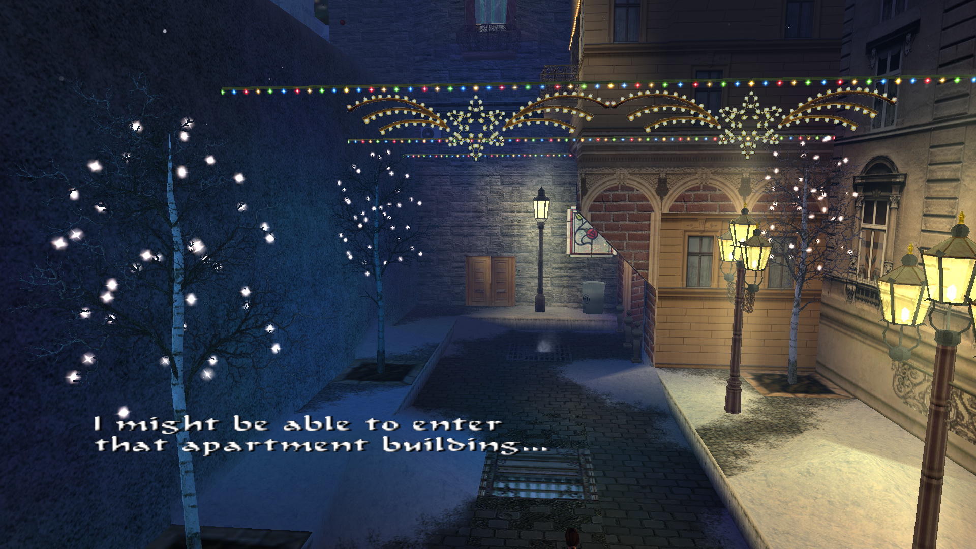 Kint az utcán menj jobbra, és a következő kis téren, balra a sarokban egy hajléktalannal találkozol. Kéreget, így szerezni kell neki valamit. :) Menj vissza a nagy térre, ott jobbra, vissza a kis sikátorba, ugord át a ládát, és balra, lemenve a lépcsőn nyisd ki a kulcsoddal az ajtót. A folyosón, jobbra, nyisd ki az ajtót a fali kapcsolóval.