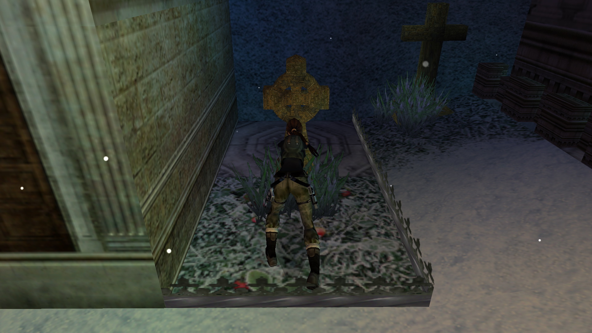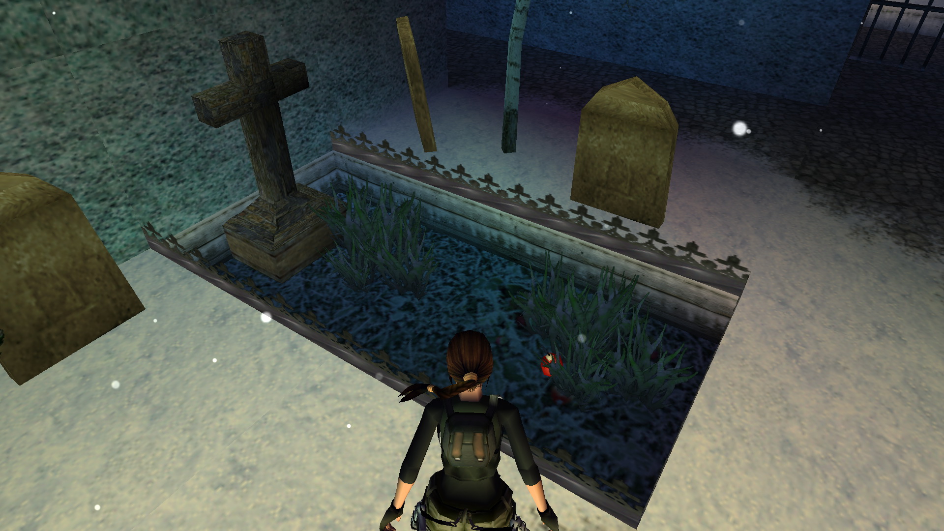 Egy kis temetőbe értél. Látod, valamit nagyon néz Lara jobbra, egy keresztet, de még hagyd. Balra egy másik síron, a növények között találod a 4. Decoration Secret-et, a 4. secret- ben.