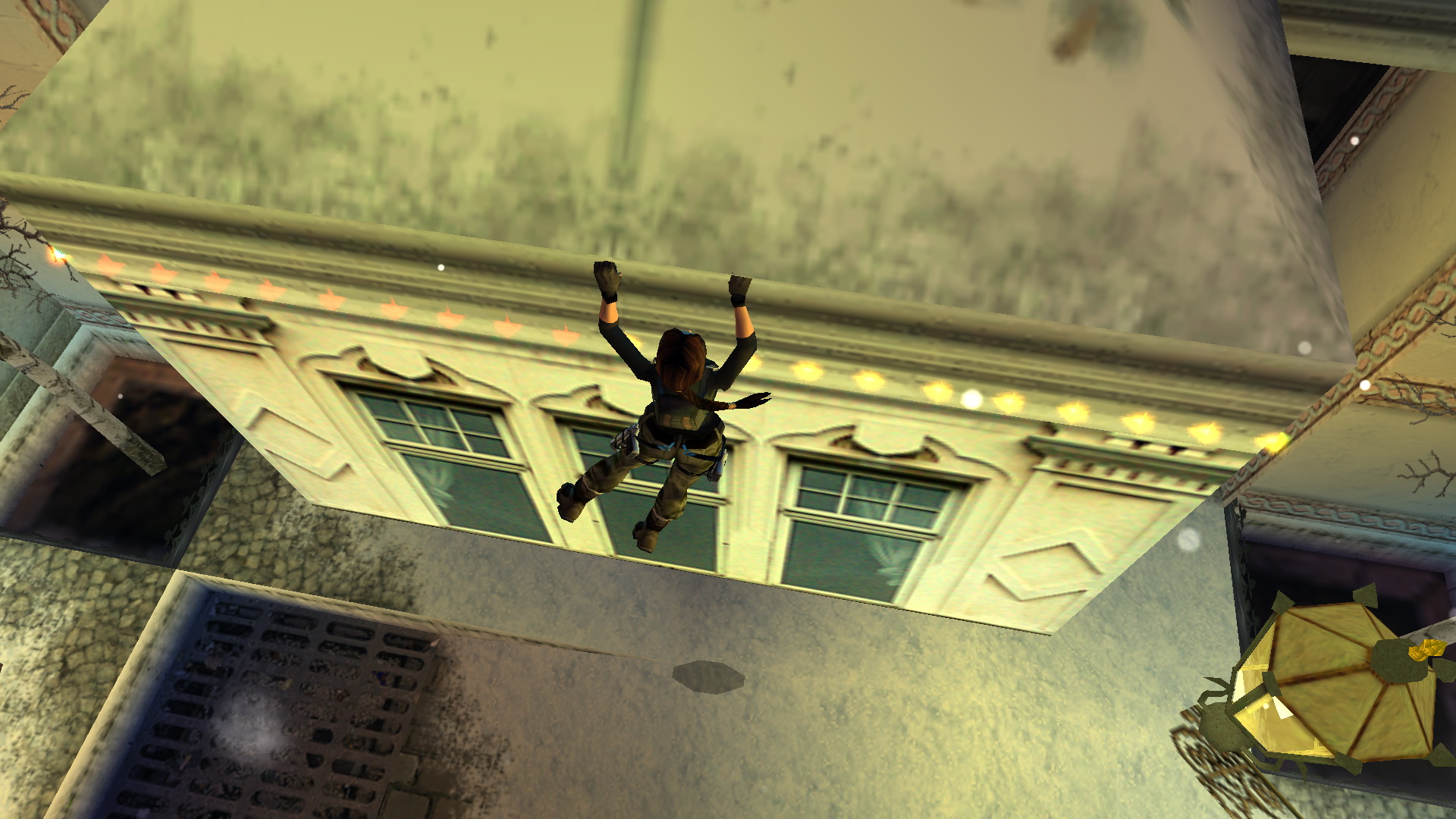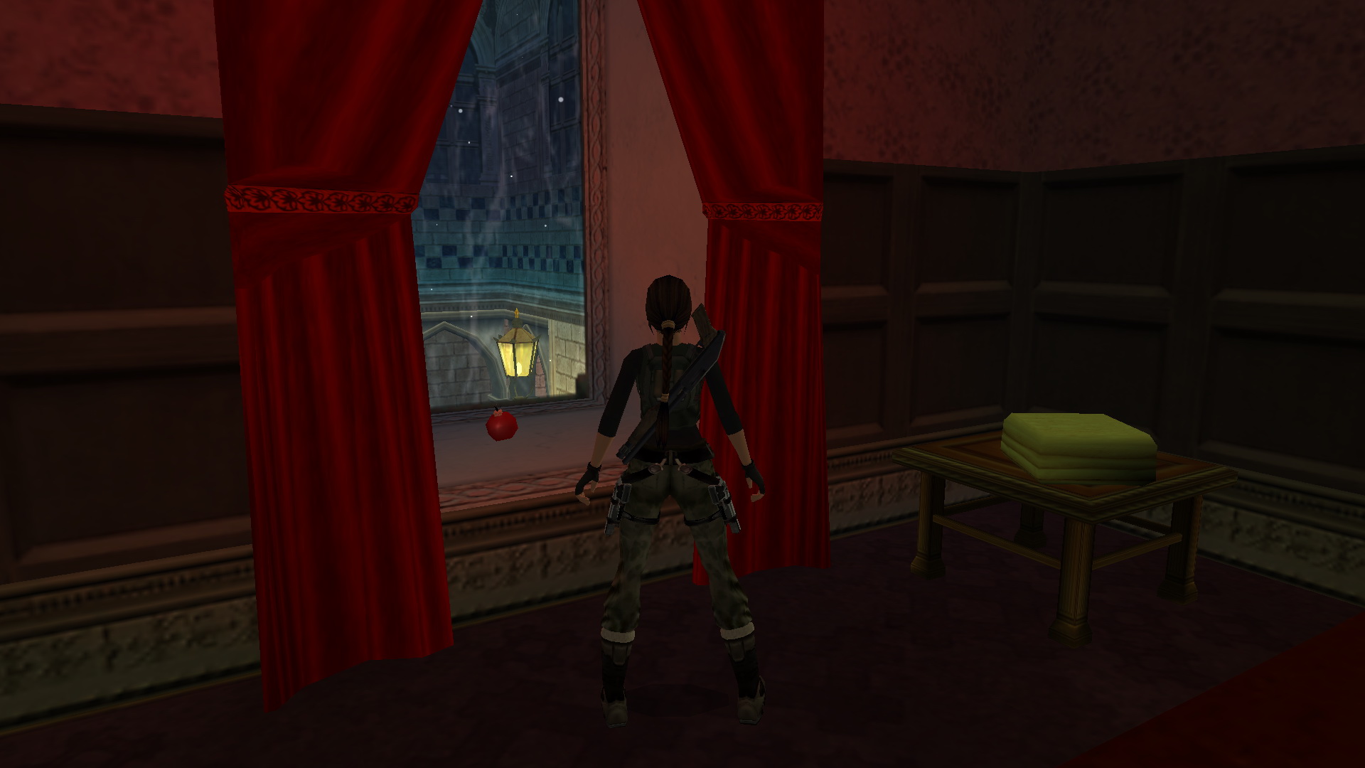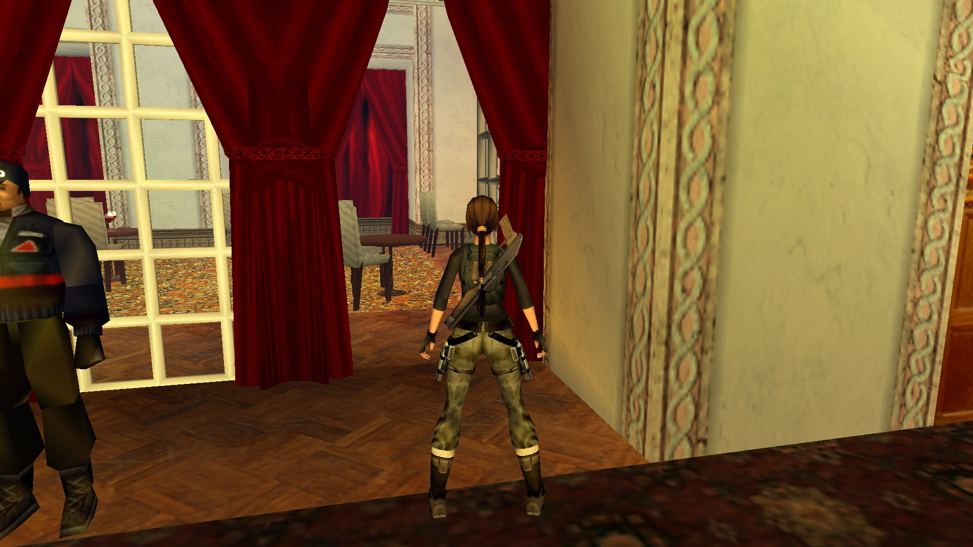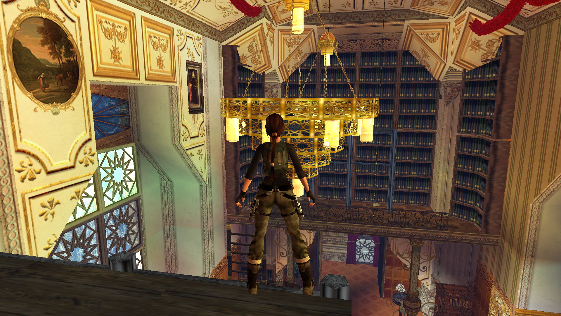 Jobbra mássz fel az ablakba, és nekifutásból kapd el a ferde tetőt. csimpizz balra, a túloldalán mássz fel, és egy fordulásos (+END) hátraugrással az erkélyen landolsz. Ugrás a másikra, majd a harmadikról balra, egy nekifutásos ugrással kapod el a szemközti részt. Mássz fel az ablakba, lődd ki, majd ereszkedj le a földszintre a nagyteremben. Nyomd meg a kapcsolót a falon.