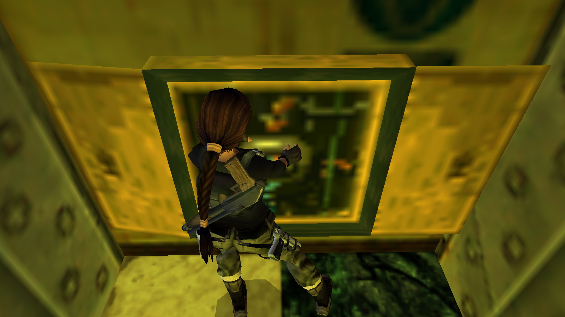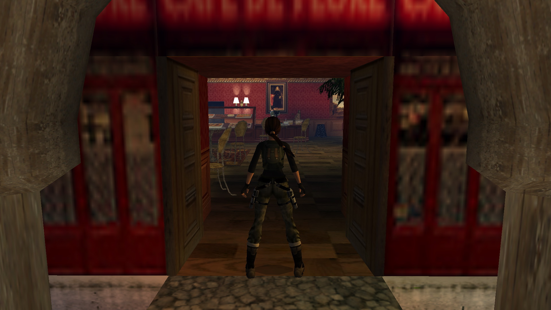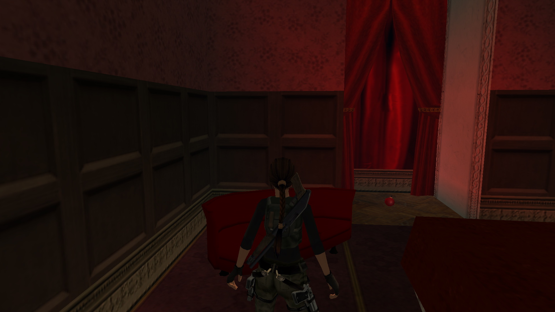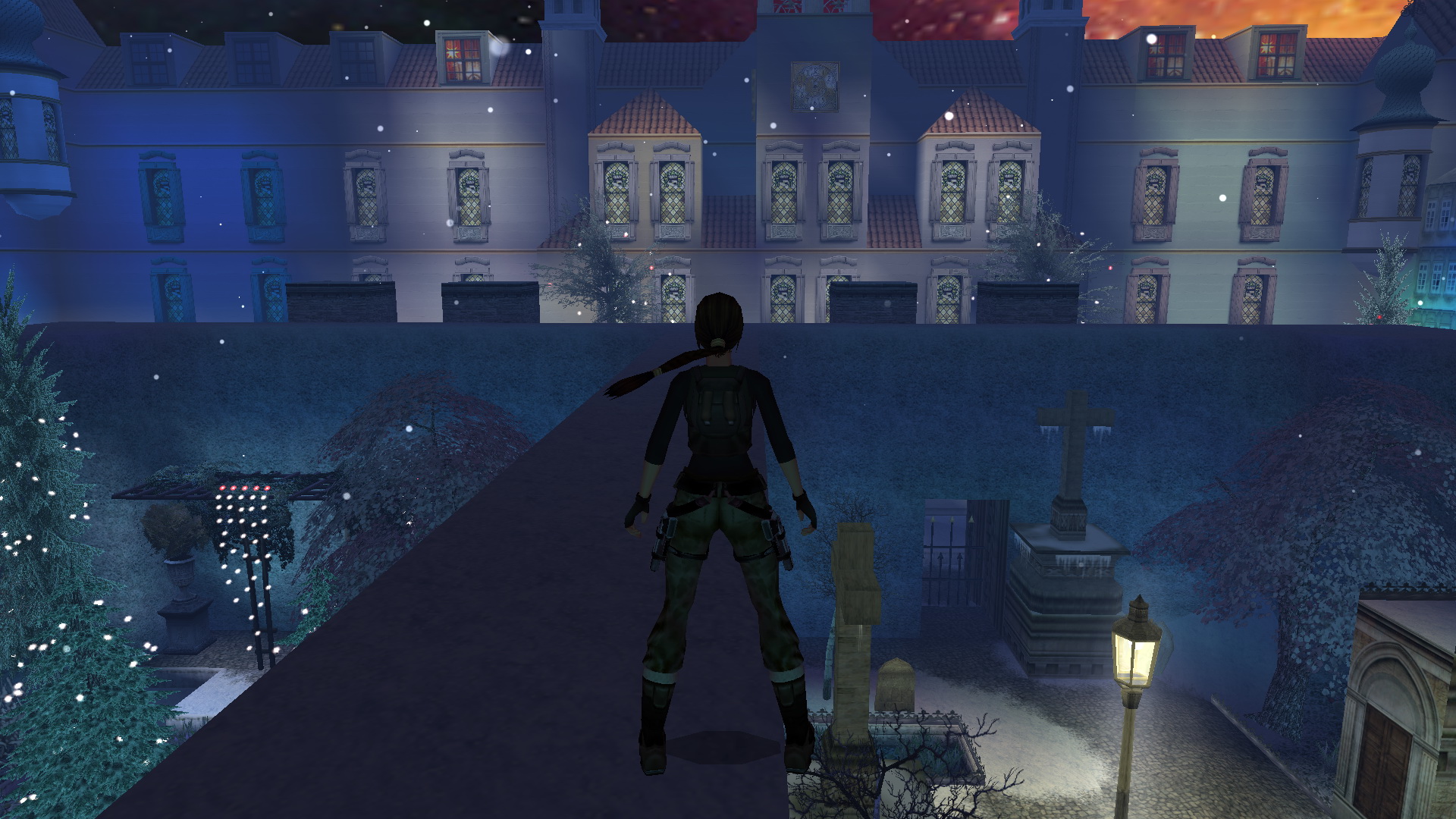 Jobbra mássz fel az ablakba, és nekifutásból kapd el a ferde tetőt. csimpizz balra, a túloldalán mássz fel, és egy fordulásos (+END) hátraugrással az erkélyen landolsz. Ugrás a másikra, majd a harmadikról balra, egy nekifutásos ugrással kapod el a szemközti részt. Mássz fel az ablakba, lődd ki, majd ereszkedj le a földszintre a nagyteremben. Nyomd meg a kapcsolót a falon.