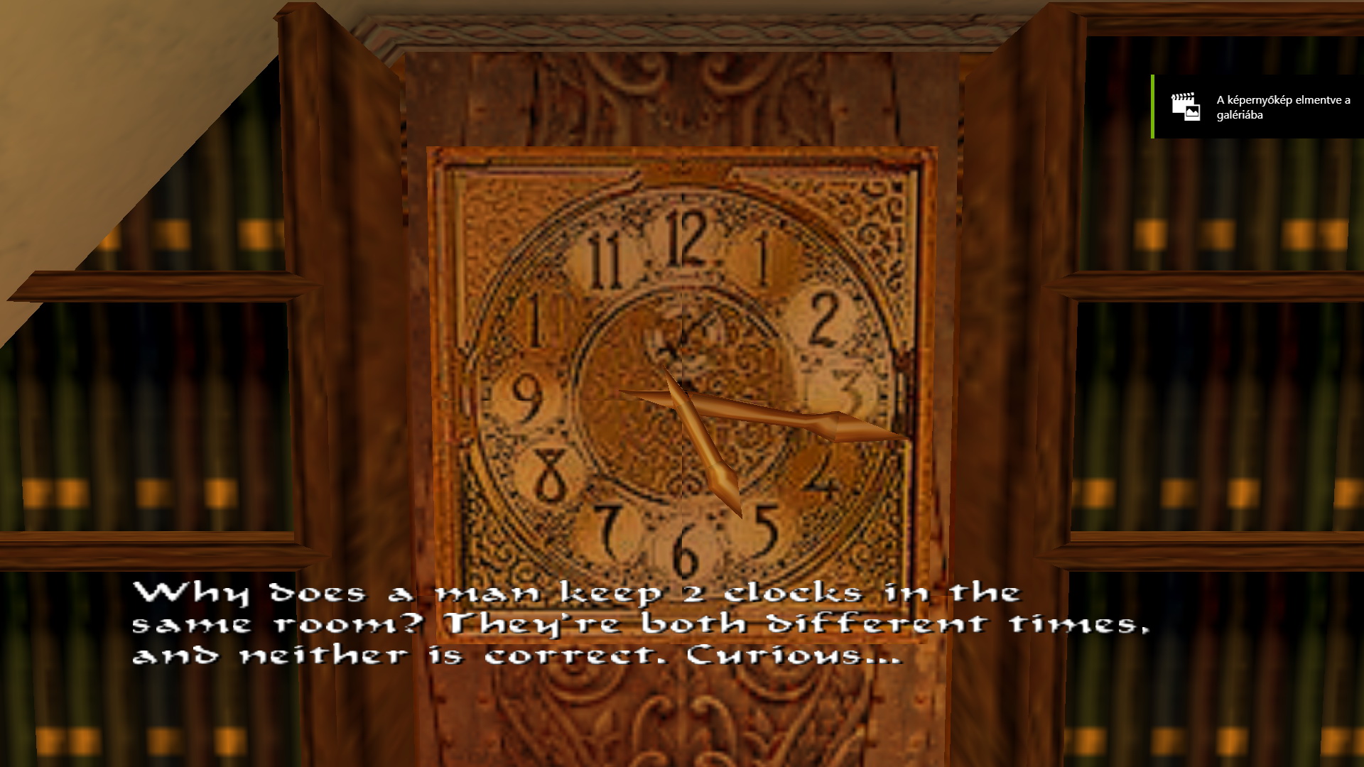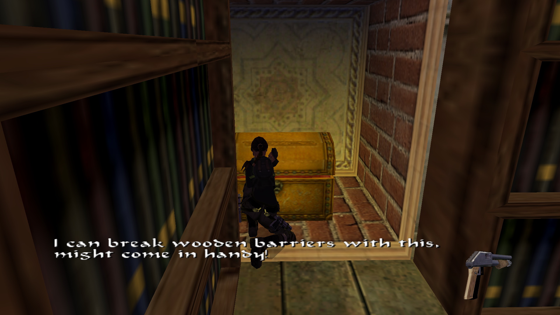 Menj a targonca mögött egyenesen a terem végébe, ott jobbra van egy kis könyvtár, ahol az egyik könyvespolcon megforgathatsz egy könyvet. Elmozdult egy másik könyvespolc, így a kis ládikából kiveheted a Shotgun-t.