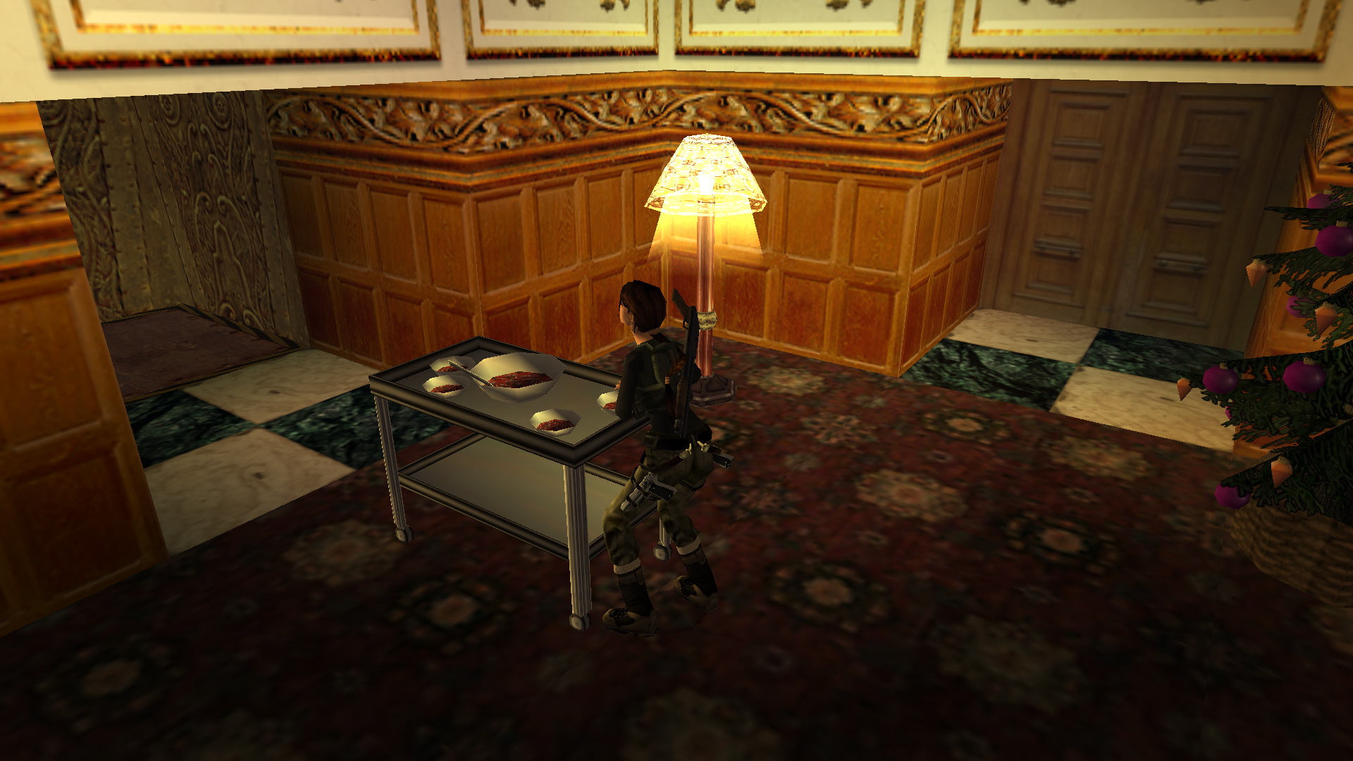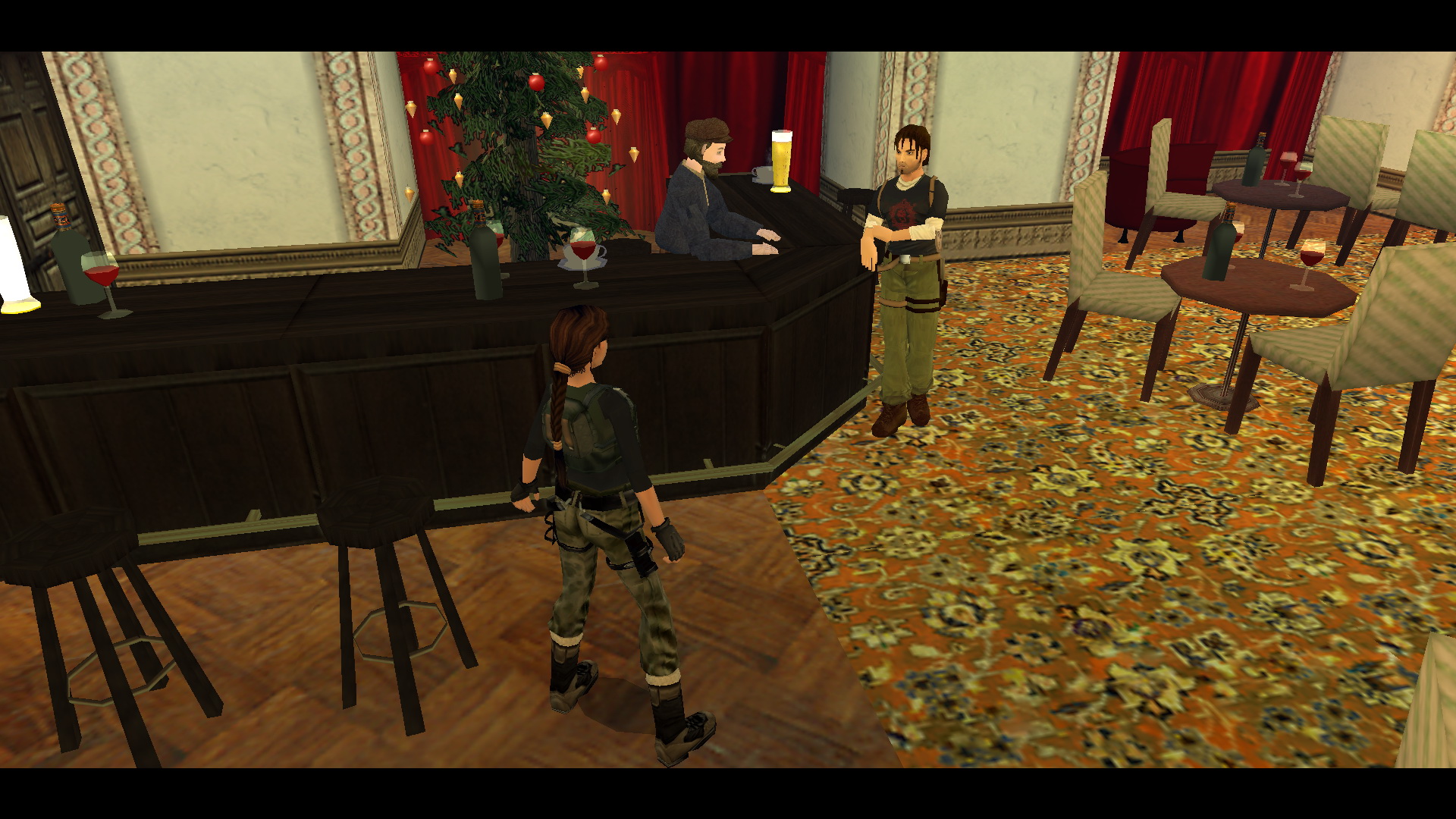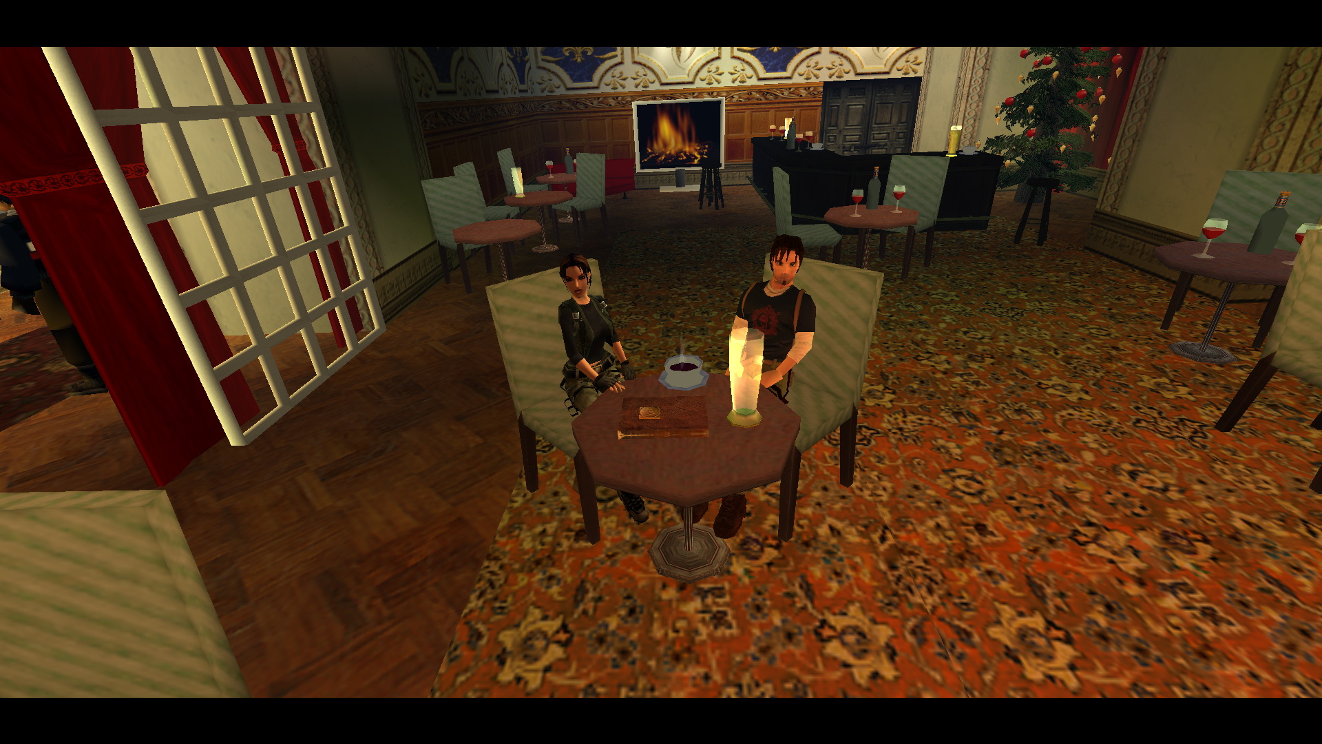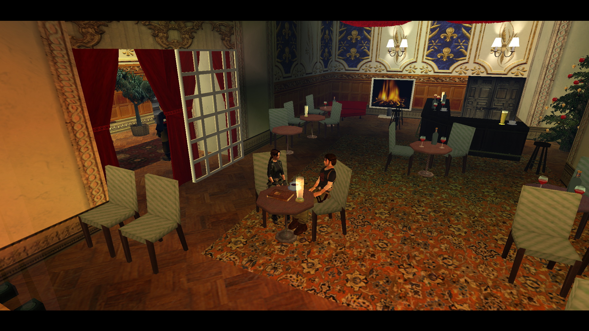 Menj a szemközti oldalra, és egy fegyveressel találkozol. Kurtis-t is látod a bárpultnál. Menj a folyosó végén balra, majd jobbra, megint balra, és megint jobbra és a kis teremben, a fenyőfával szemközti virágtartóból kiveheted a 23. Decoration Secret-et, a 23. secret-ben.