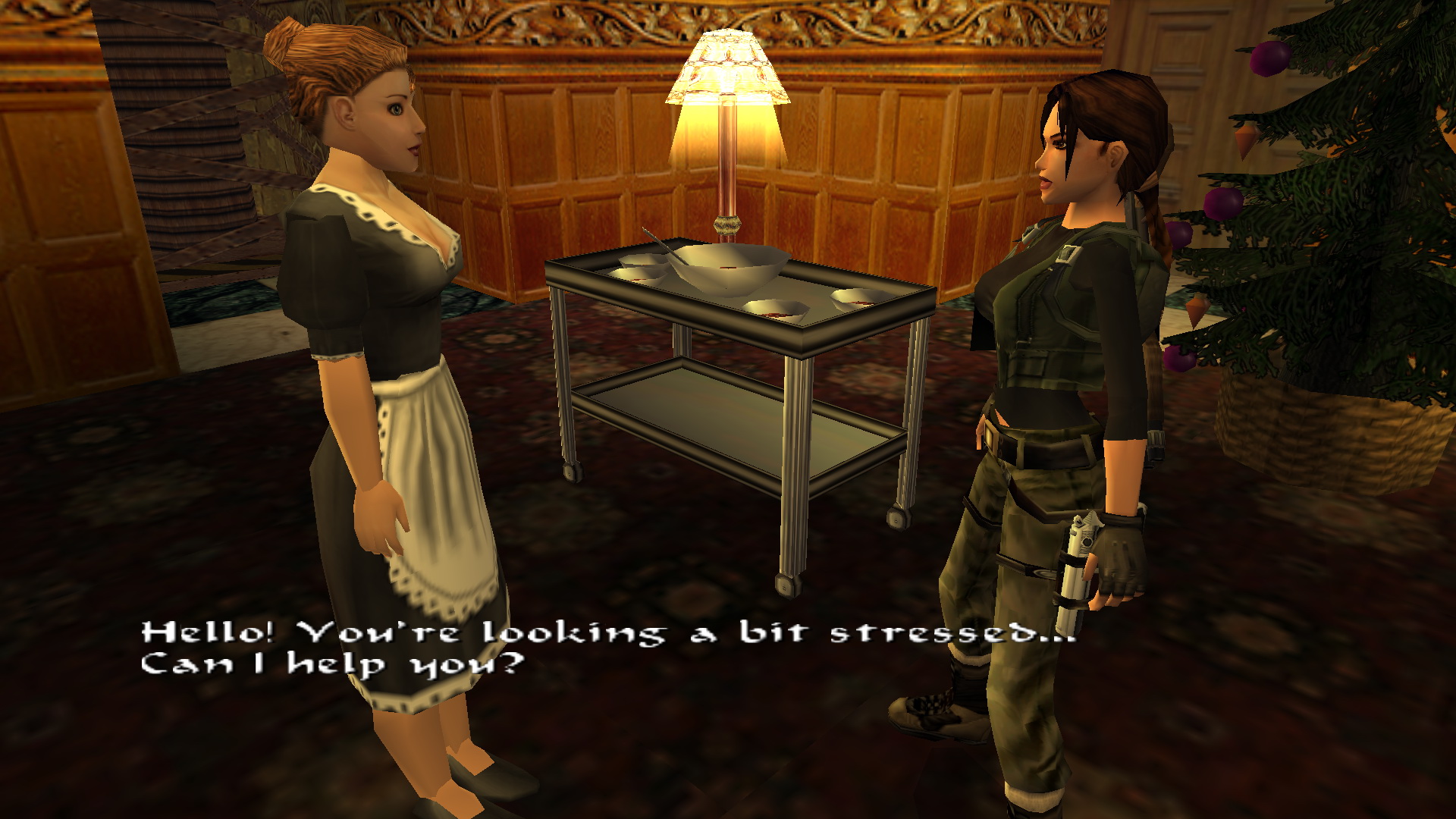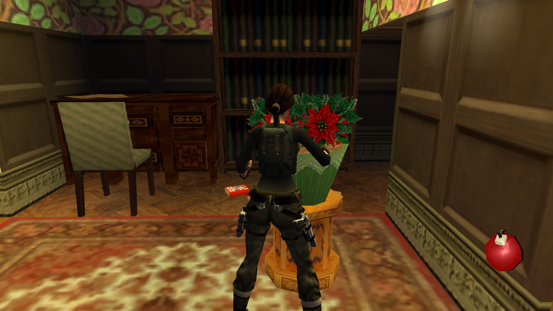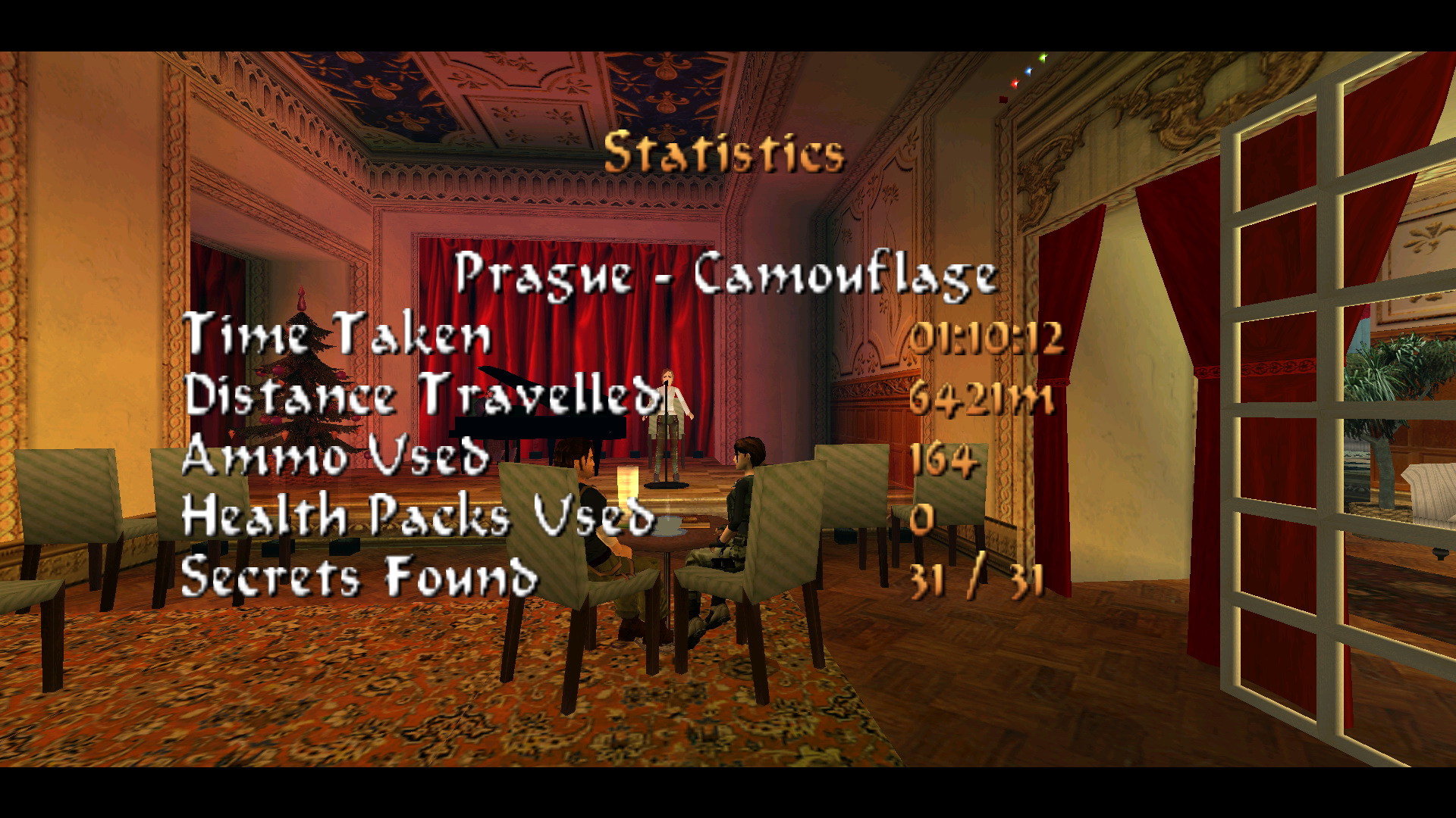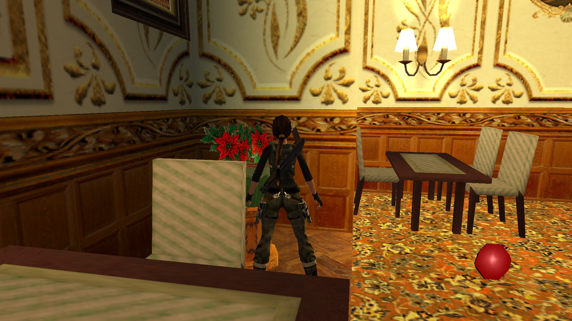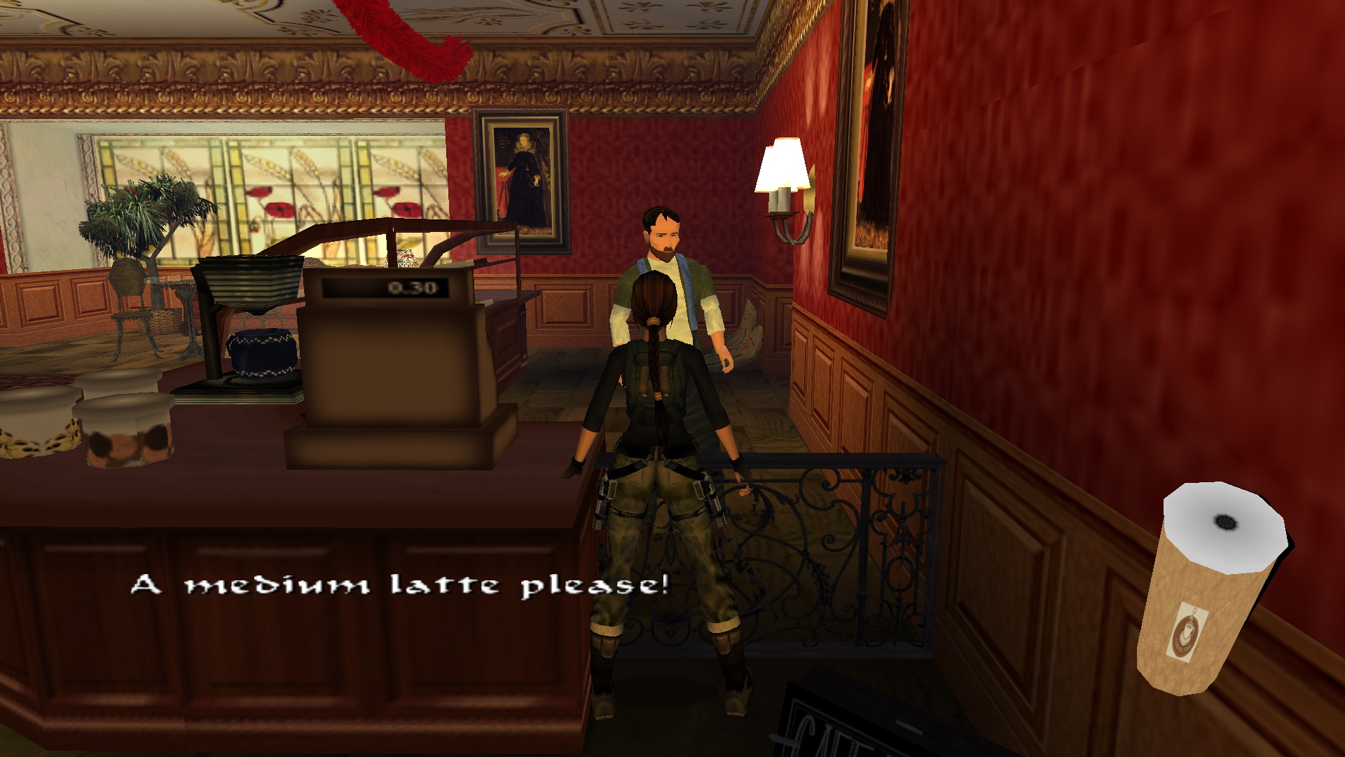 Menj a szemközti oldalra, és egy fegyveressel találkozol. Kurtis-t is látod a bárpultnál. Menj a folyosó végén balra, majd jobbra, megint balra, és megint jobbra és a kis teremben, a fenyőfával szemközti virágtartóból kiveheted a 23. Decoration Secret-et, a 23. secret-ben.