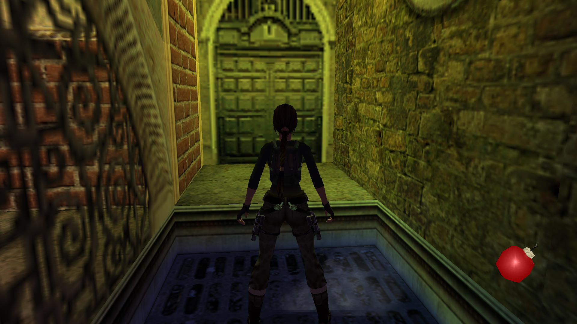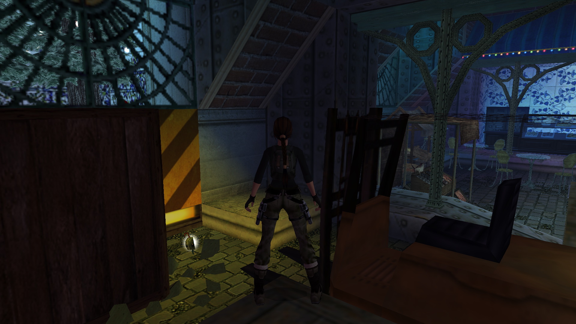 Ugrás vissza a lengő láncokhoz, majd tovább, a túloldalra, és rántsd fel ott a csapóajtót. Lent, a teremben nyomd meg a fali gombot. Megfordulva jobbra menj, átugorva a ládát, és vedd fel a kis asztalról a fáklyacsomagot. Menj le a lépcsőn, és az autóemelőnél balra menve vedd el az asztalról a csokit. Menj be a folyosón, le balra a lépcsőkön, és a raktárban, hátul a ládák mögött szétlőve a ládikát fáklyacsomagot vehetsz fel. Az alacsonyabb láda mögött leled meg a 15. Decoration Secret-et, a 15. secret- ben.