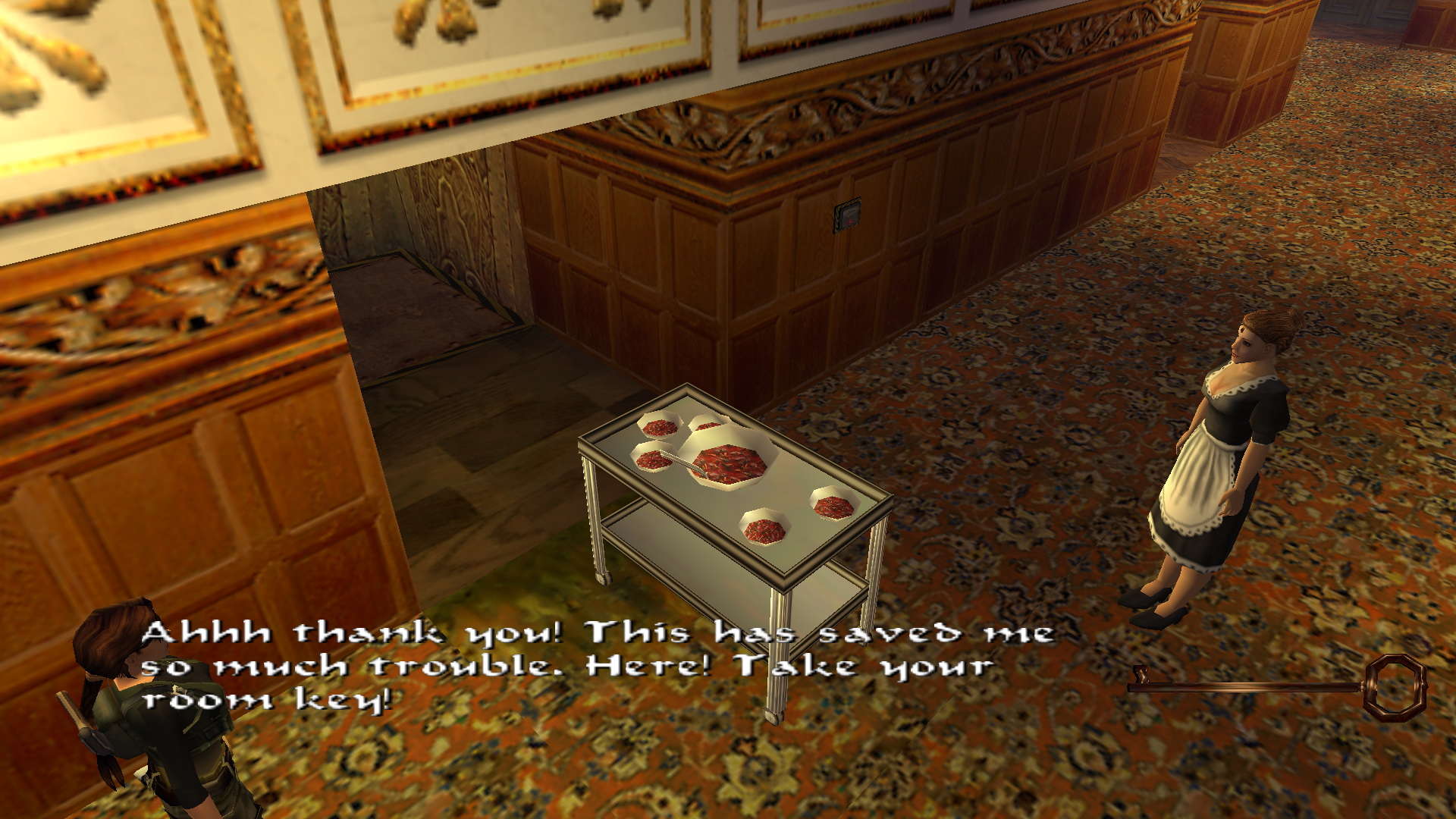 Kinyithatod az ajtót is a folyosón, ami visszavezet a ruhatárhoz. de ne menj ki. előtte rántsd le a sarokban a csapóajtót, felugorva kapd el a szellőzőt, mássz fel, kússz végig rajta, és lemászva tedd a foglalatába a biztosítékot. Menj vissza a szobalányhoz, ez leengedi a liftet, és betolhatod a zsúrkocsit. Menj ki az előtérbe, fel az emeletre, ott balra, és húzd ki a liftből a zsúrkocsit, már várja a szobalány. :) Hálából neked adja a Hotel Room Key-t.