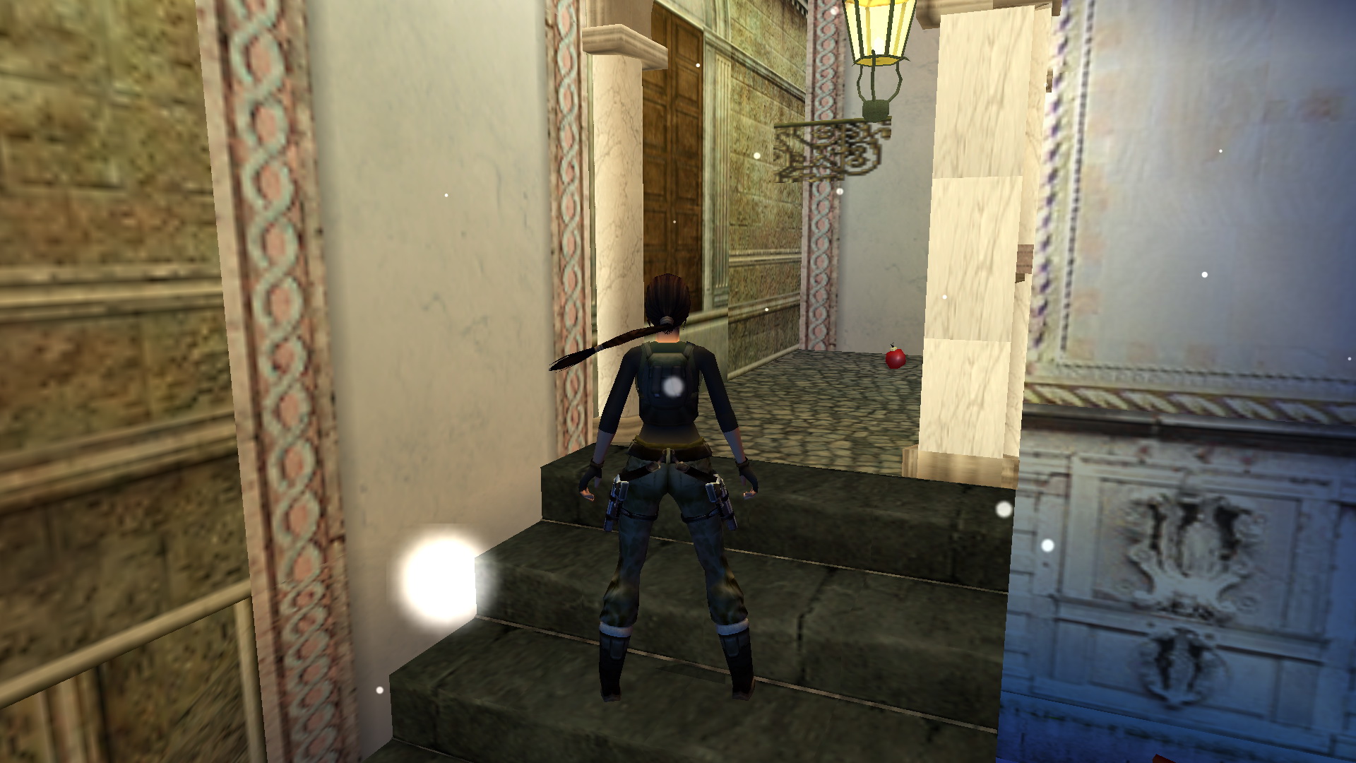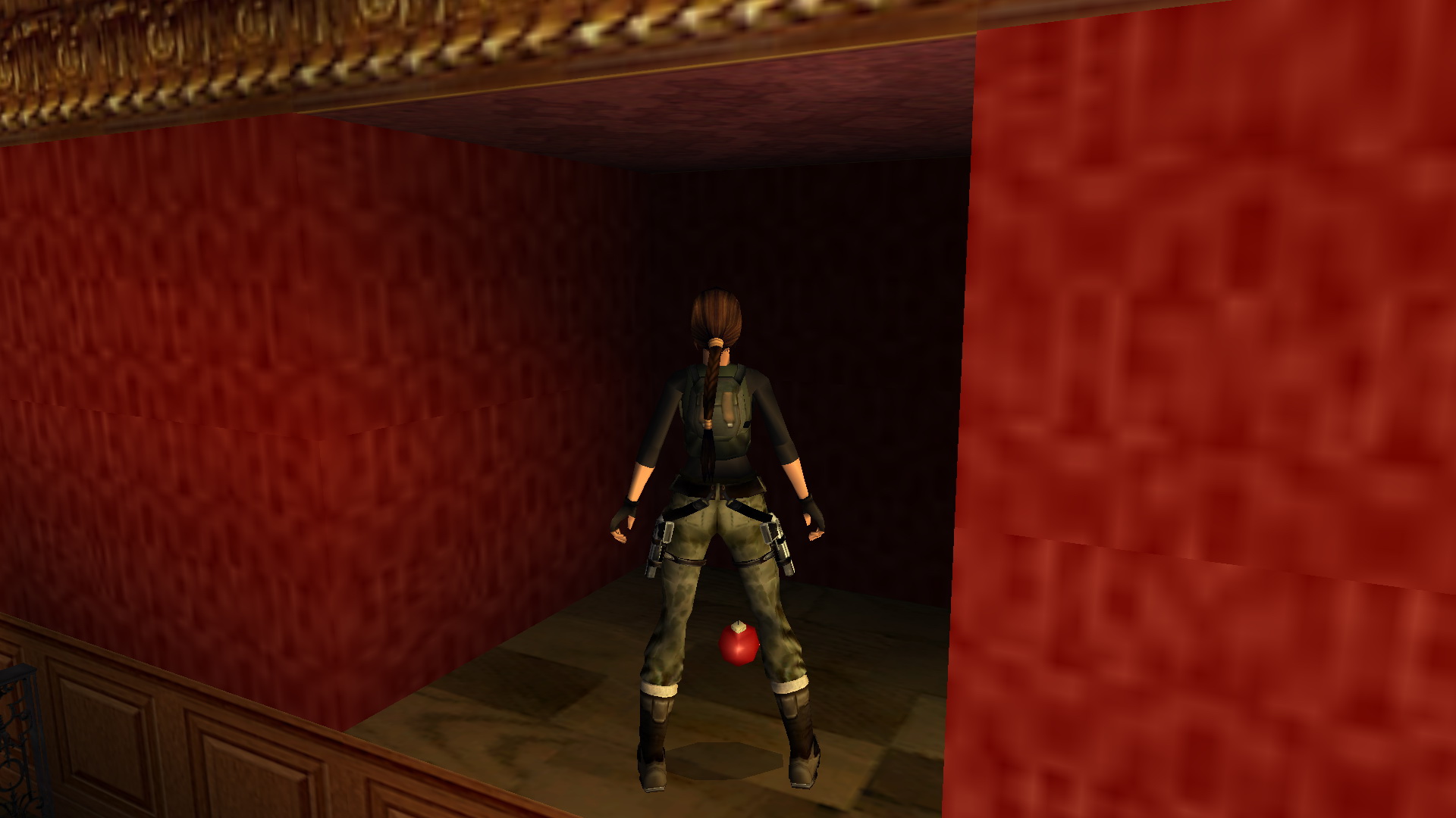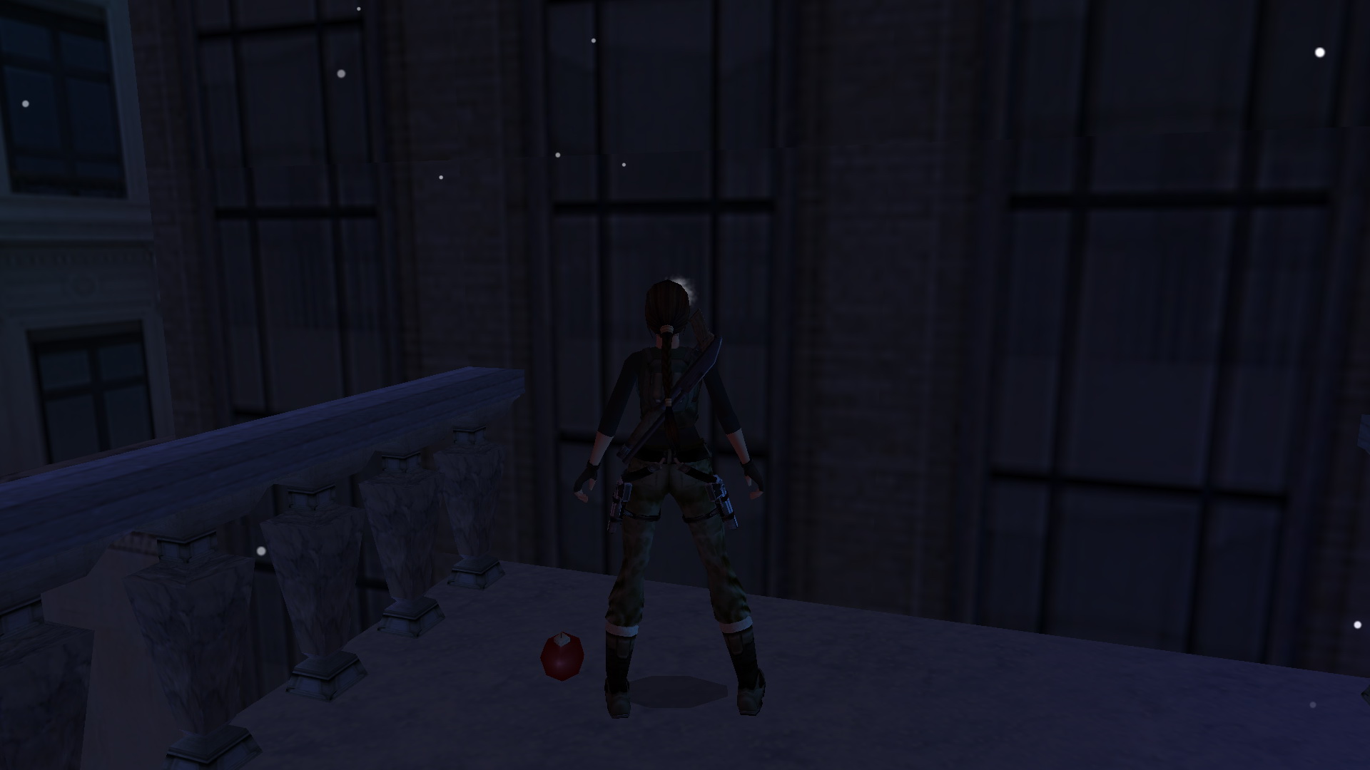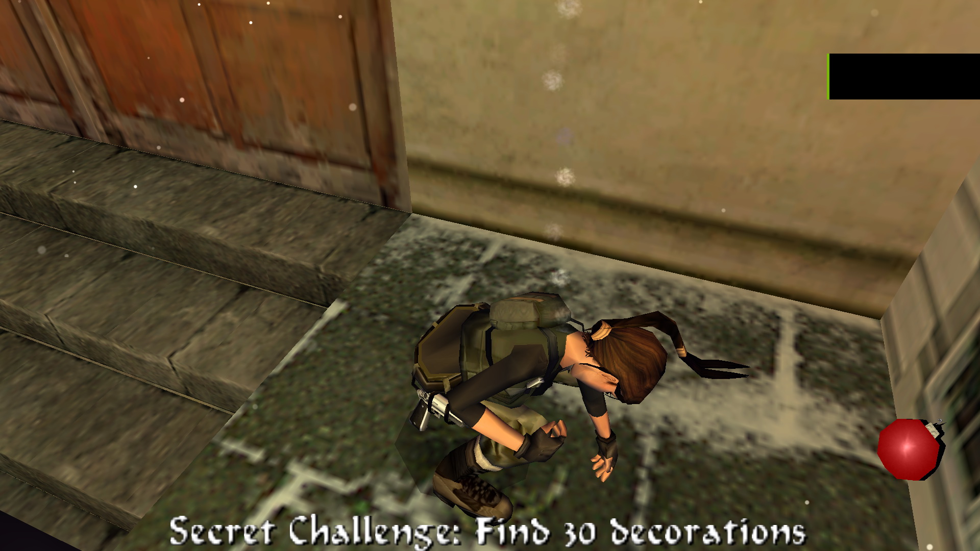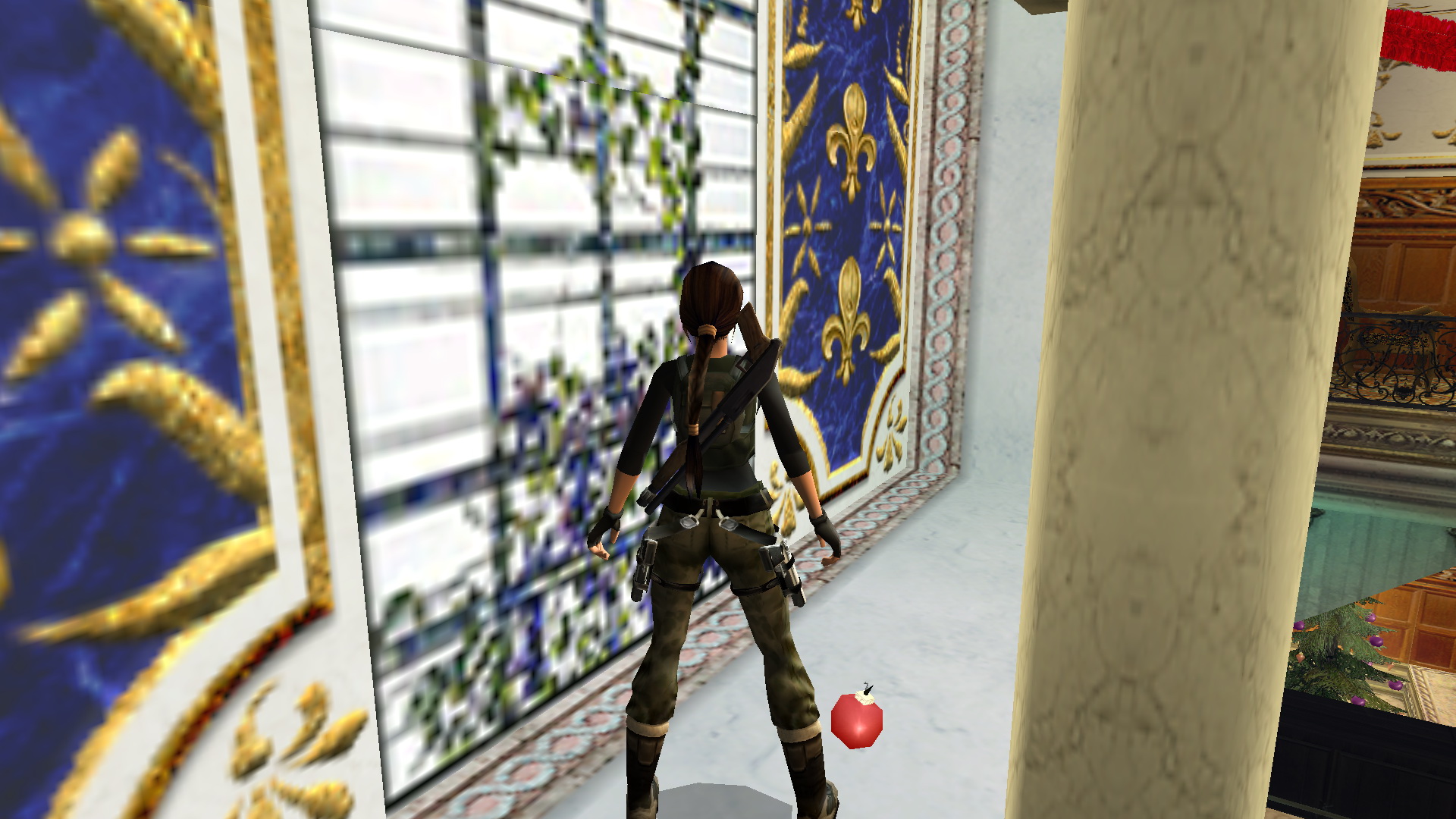 Ugrás le a lépcsőkre, menj fel ismét a felsőbb emeletre, és a kulcsoddal nyisd most már ki a nagyajtót. Lődd ki az ablakot, menj ki az erkélyre, és balra, egy helyből ugrással kapd el a fali rést. Csimpizz jobbra, ahol tudsz, mássz fel, majd nekifutásból ugrás a kis hídra, ott találod a 29. Decoration Secret-et, a 29. secret-ben.