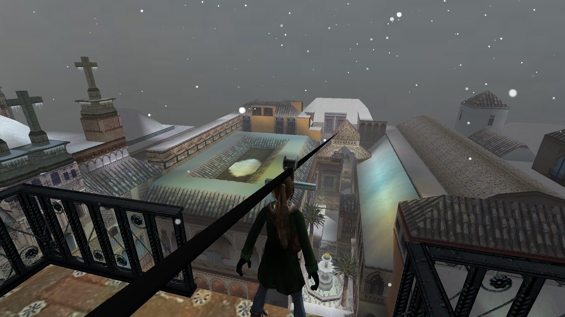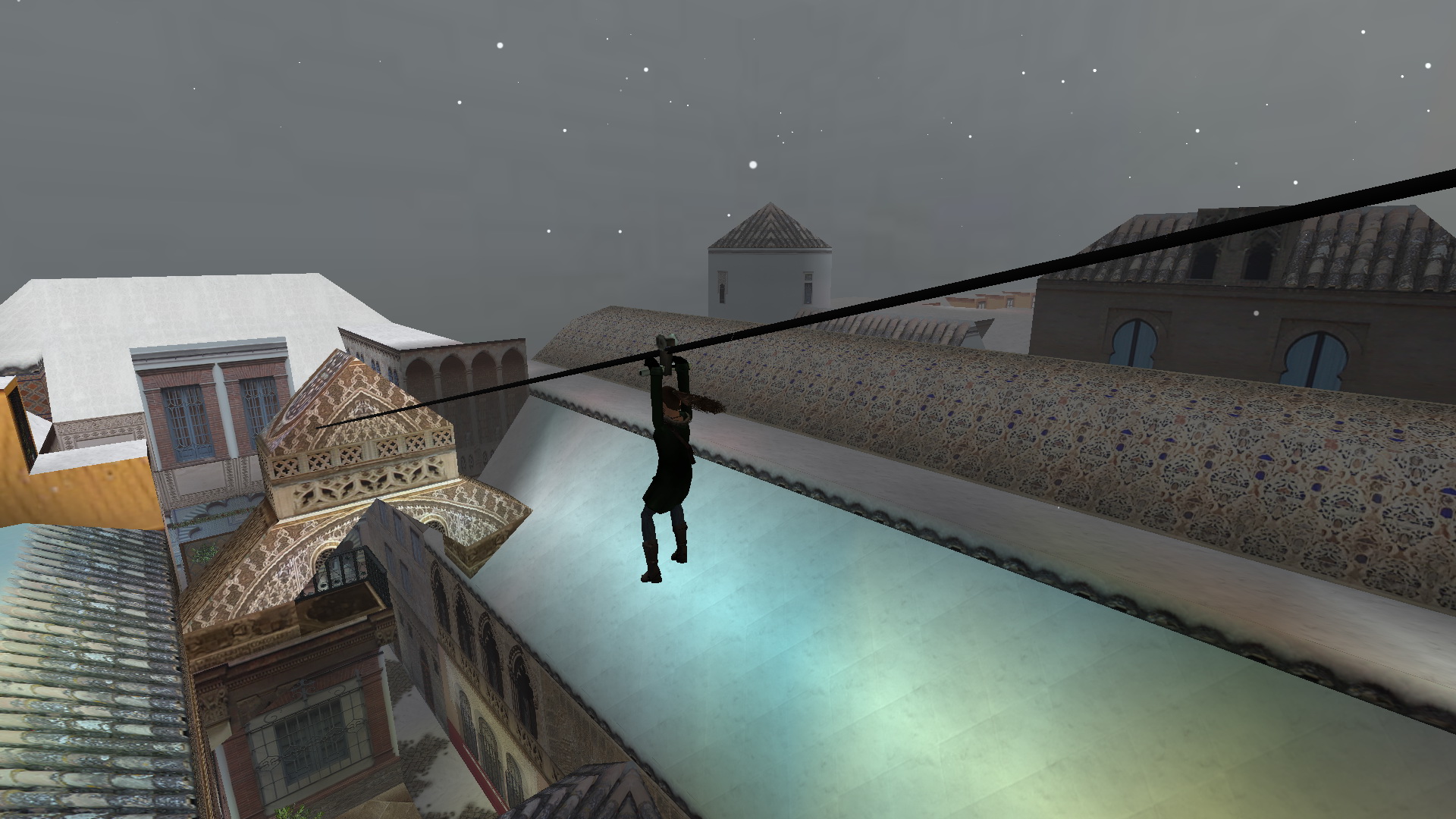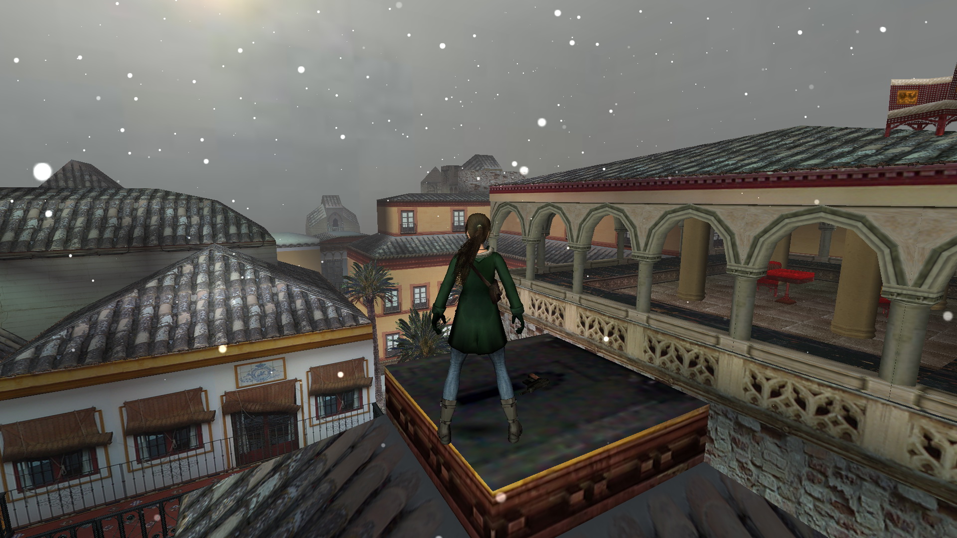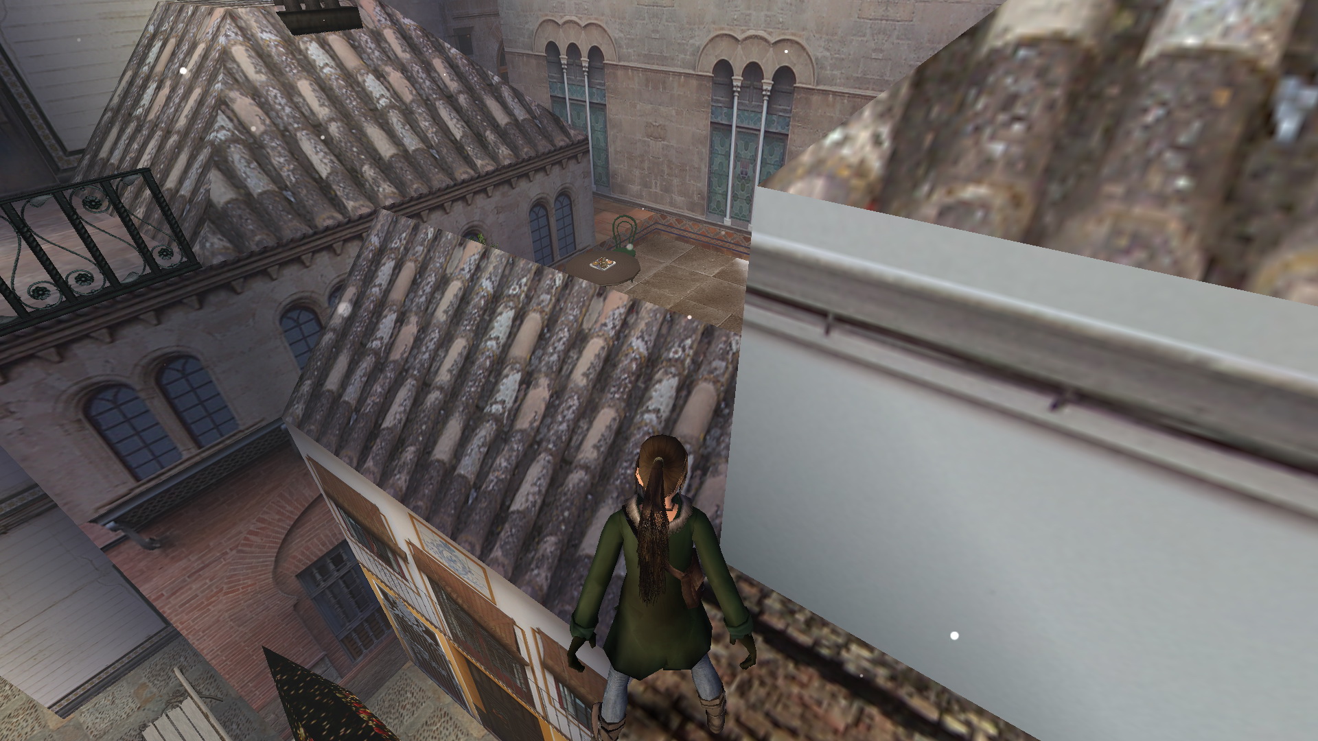 Fordulj meg, menj a szemközti kis utcába, és nyisd ki a fali gombbal a térre vezető ajtót. Menj ki a térre, menj balra, be abba a házba, ahol a pálya elején találtad a piros takarót. Most is menj fel az emeletre, be az álkulccsal kinyitott ajtón, fel a lépcsőn, mássz fel ismét a létrán a tetőre. Ismét ugrás fel a magasabb részre, onnan le az egyenes részre, ugrás át a következőre, de ott most balra fordulj, lődd ki, és ugrás át a torony ablakába. Balra kell ugranod, a ferde részre, de egy fordulásos ugrással, hogy elkaphasd a fali rést. Háttal ráugorva a lejtőre is megoldható. Csimpizz balra, mássz fel, és mássz fel a létrán is. Ha kigyönyörködted magadat a látványban, akkor csússz le a drótkötélen, majd ereszkedj le ott a földszintre, egy kis udvarba. Kinyithatod a fali gombbal a kaput, de ne menj ki, inkább menj a hátsó udvarba, ott nyisd ki az ajtót a kapcsolóval, és menj be a kinyílt ajtón. Menj fel az emeletre, és veddd fel a kis emelvényről a Cathedral Key-t.