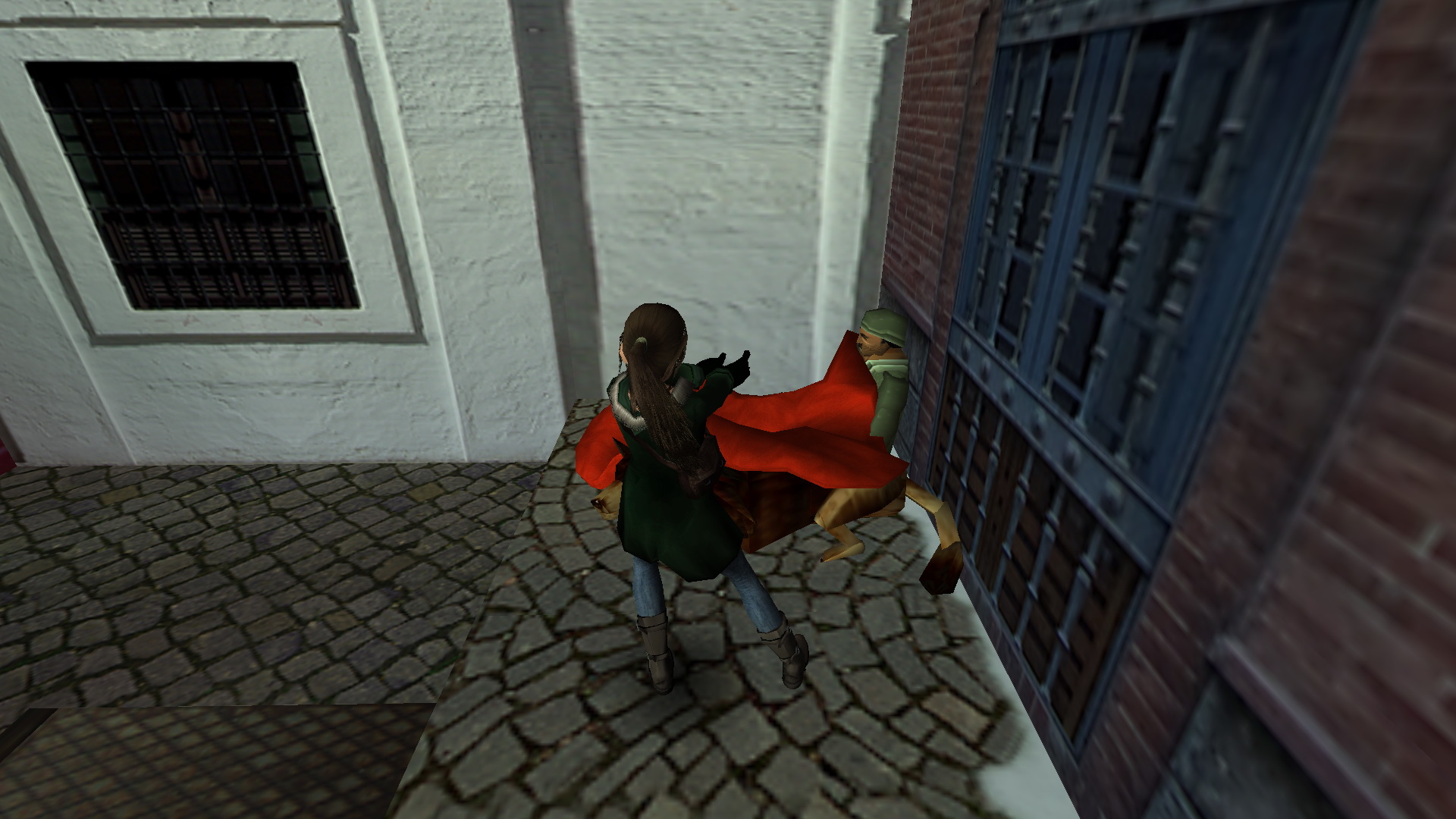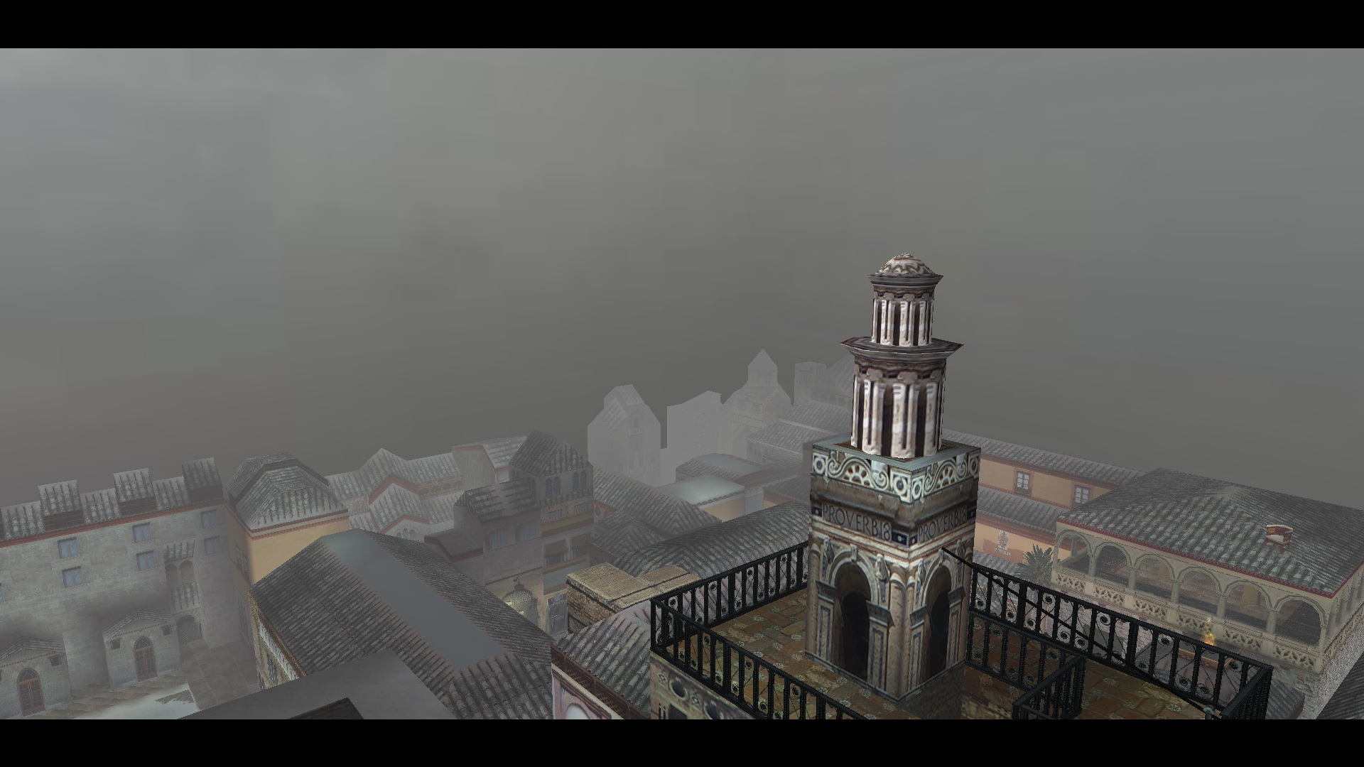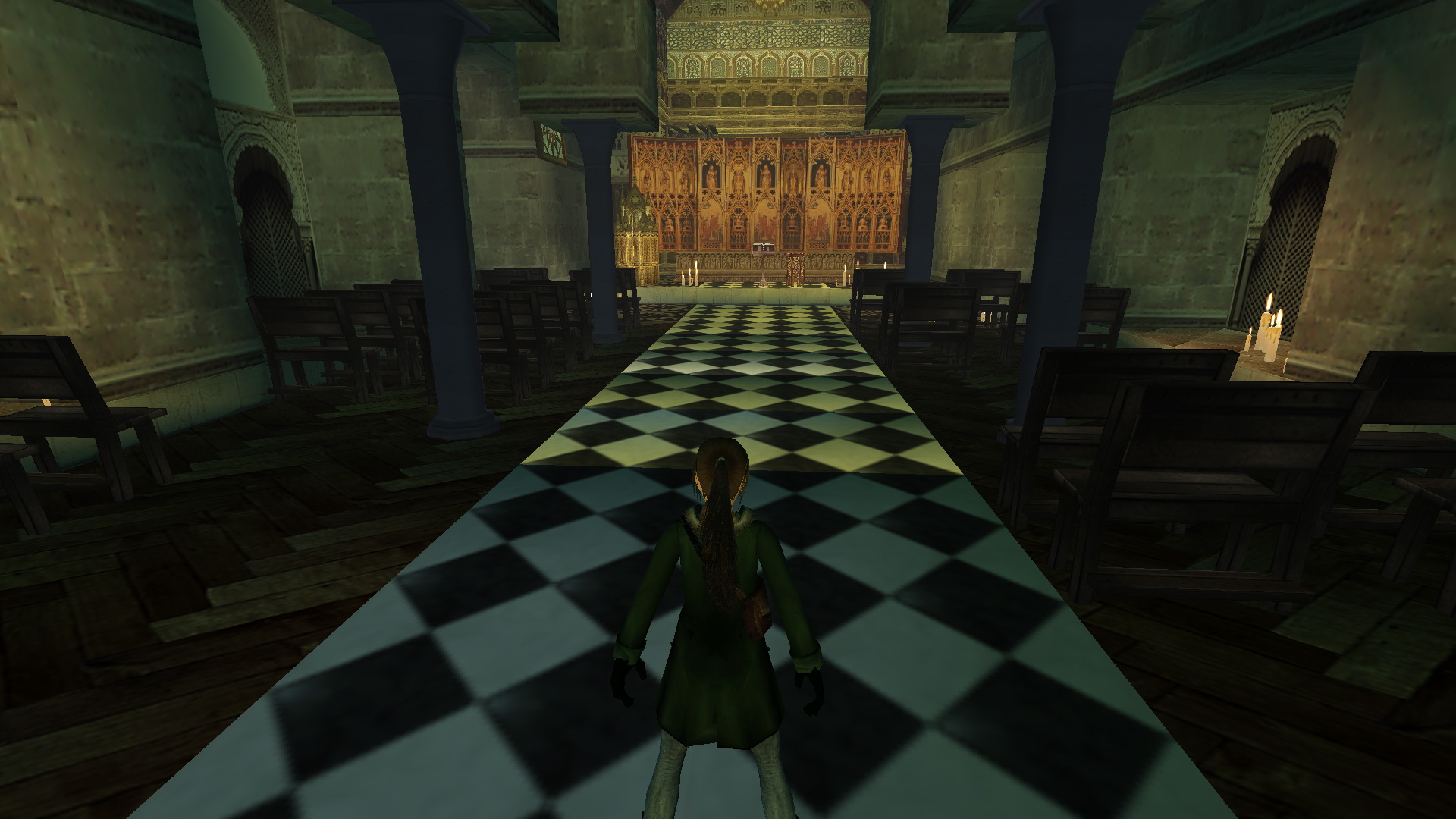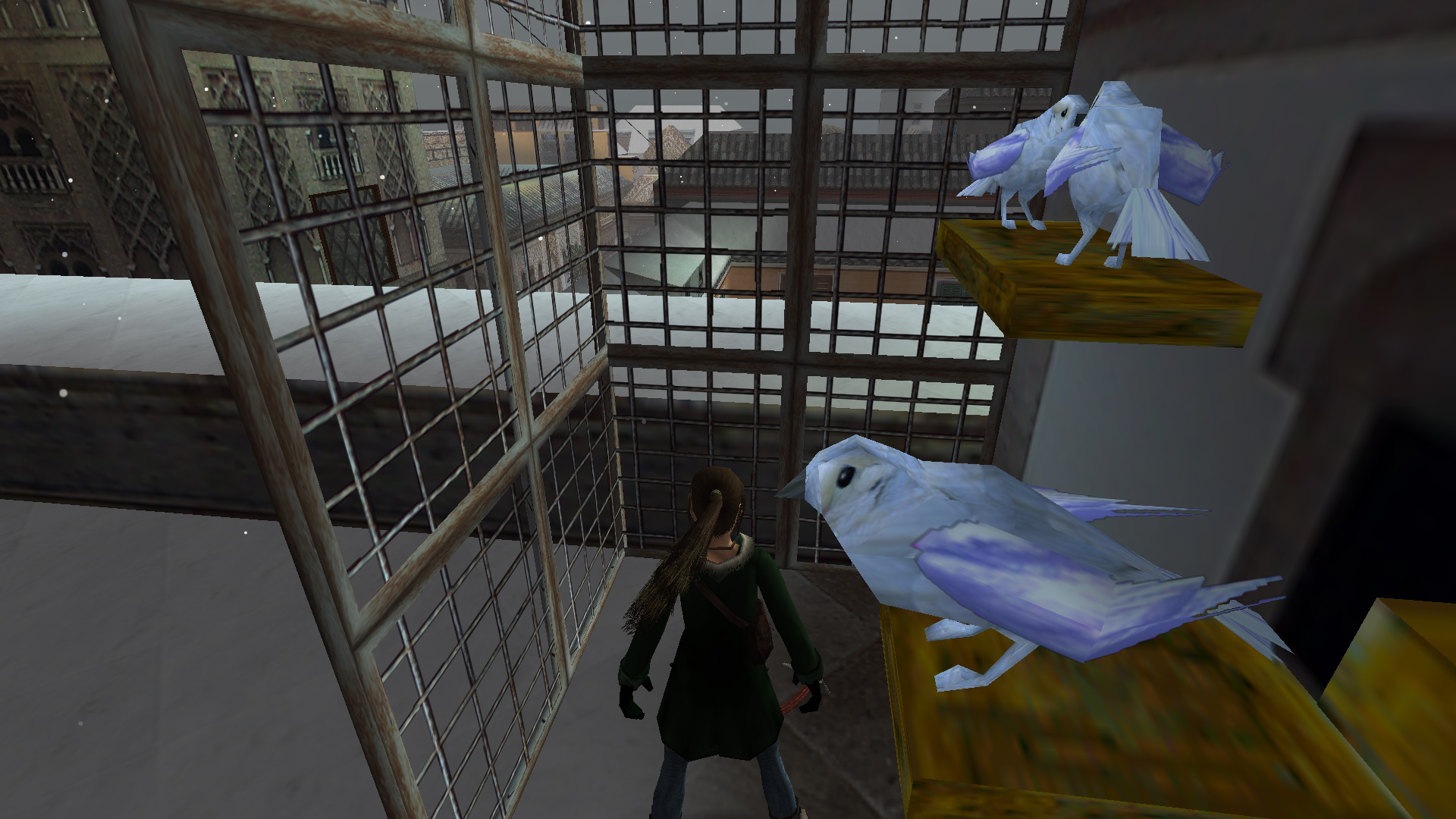 Fordulj meg, menj a szemközti kis utcába, és nyisd ki a fali gombbal a térre vezető ajtót. Menj ki a térre, menj balra, be abba a házba, ahol a pálya elején találtad a piros takarót. Most is menj fel az emeletre, be az álkulccsal kinyitott ajtón, fel a lépcsőn, mássz fel ismét a létrán a tetőre. Ismét ugrás fel a magasabb részre, onnan le az egyenes részre, ugrás át a következőre, de ott most balra fordulj, lődd ki, és ugrás át a torony ablakába. Balra kell ugranod, a ferde részre, de egy fordulásos ugrással, hogy elkaphasd a fali rést. Háttal ráugorva a lejtőre is megoldható. Csimpizz balra, mássz fel, és mássz fel a létrán is. Ha kigyönyörködted magadat a látványban, akkor csússz le a drótkötélen, majd ereszkedj le ott a földszintre, egy kis udvarba. Kinyithatod a fali gombbal a kaput, de ne menj ki, inkább menj a hátsó udvarba, ott nyisd ki az ajtót a kapcsolóval, és menj be a kinyílt ajtón. Menj fel az emeletre, és veddd fel a kis emelvényről a Cathedral Key-t.