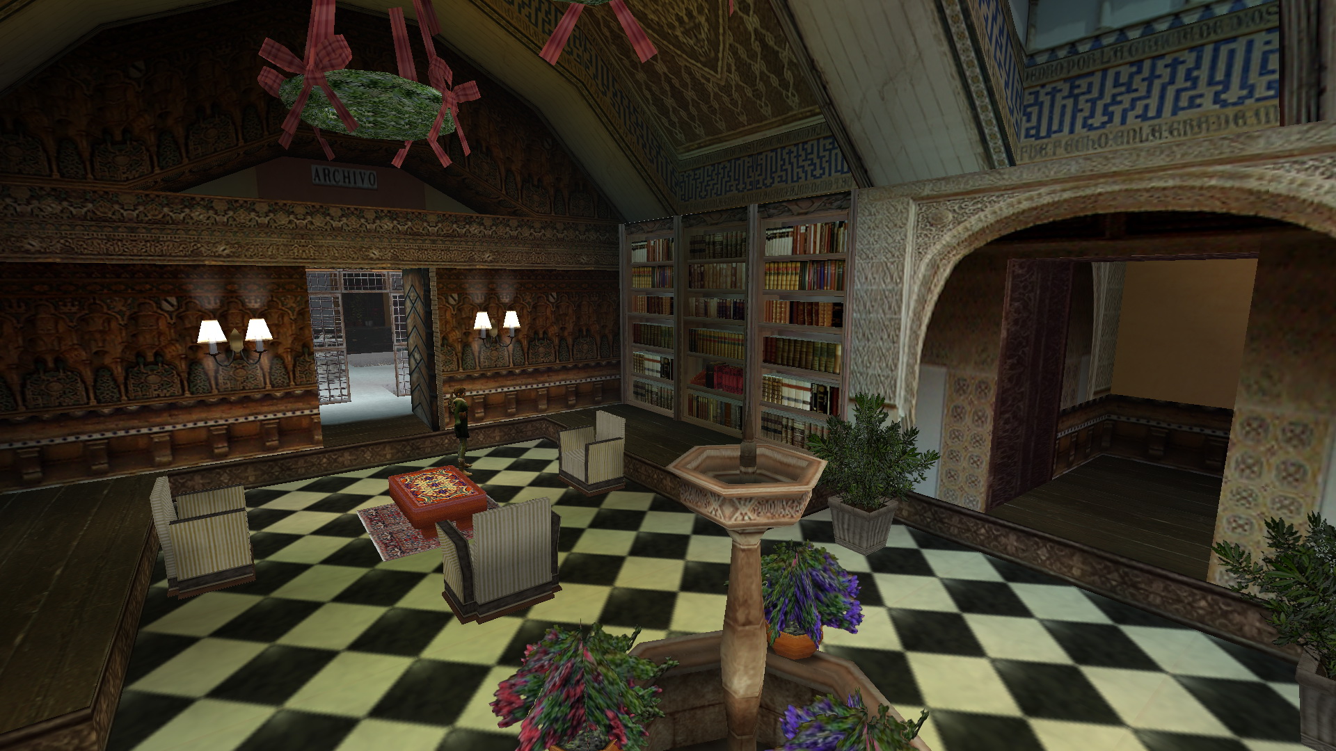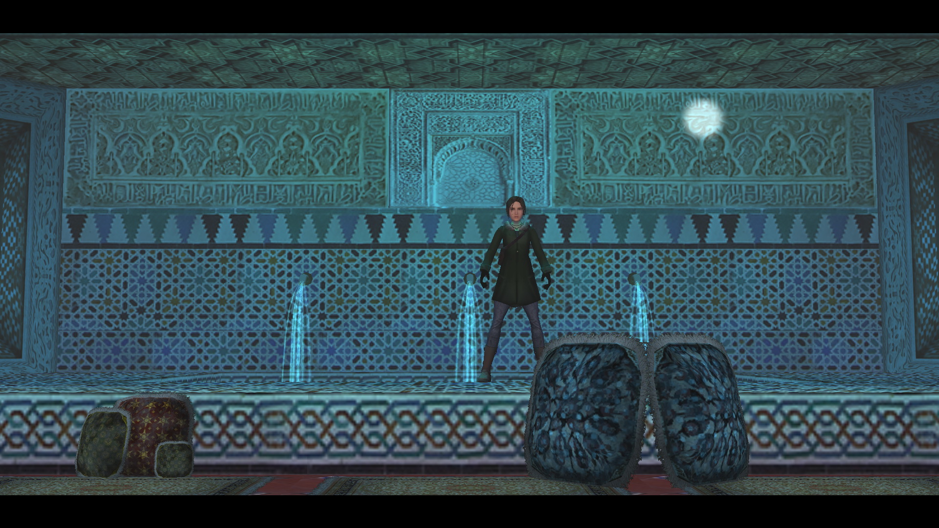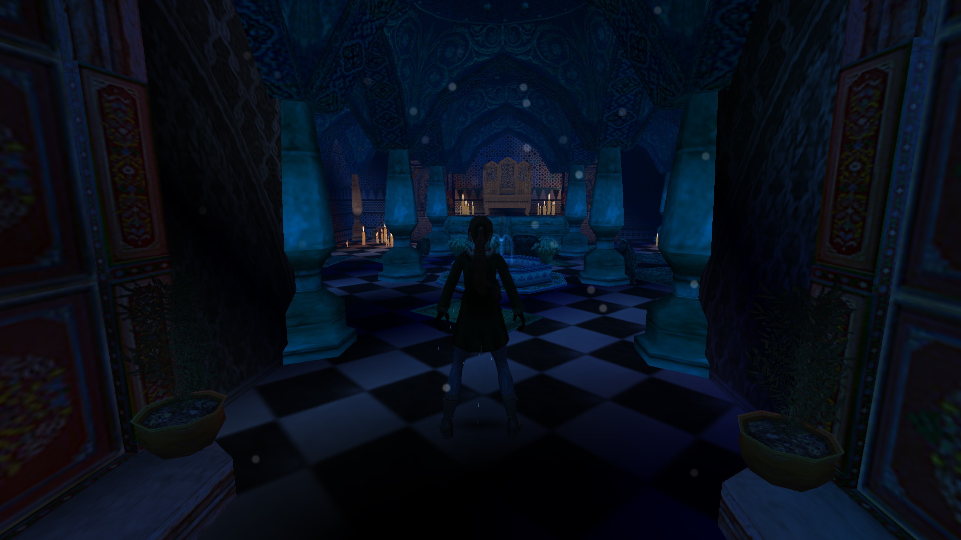 Menj ki az épületből, ki a kis térre, és jobbra menve nyisd ki a kulcsoddal a Katedrálist. Jobbra menj a kis medencébe, és töltsd meg vízzel a kis vizestömlődet. Húzd meg a fali kart is, és kint az előtérben mássz fel a felemelkedett állványra. Megfordulva juss fel a kis erkélyre, onnan balra, a platformra, és onnan a fali beugróba. a túloldalon juss le a kis udvarba, a fali karral engedd le az állványt, és a kútba ugorva a jég beszakad alattad, és egy narancsot vehetsz fel. Mássz vissza fel, amerről jöttél, de a fali beugró előtt kapaszkodj fel a plafonlétrára, és csimpizz át a túloldalra. kapd el a fali rést, mássz át rajta, a túloldalon ugrás az erkélyre, ahol sütemény vár. ugord át a korlátot, elkapva a kötelet, és belengetve, ugrás, és rántsd le a fali kart. Menj az előszobába, menj jobbra, és mivel leengedted ott az állványt, kiérsz a kis udvarba, és bemehetsz szemben a kinyitott ajtón a Templomba. Az oltár mögött balra húzd meg a kart.