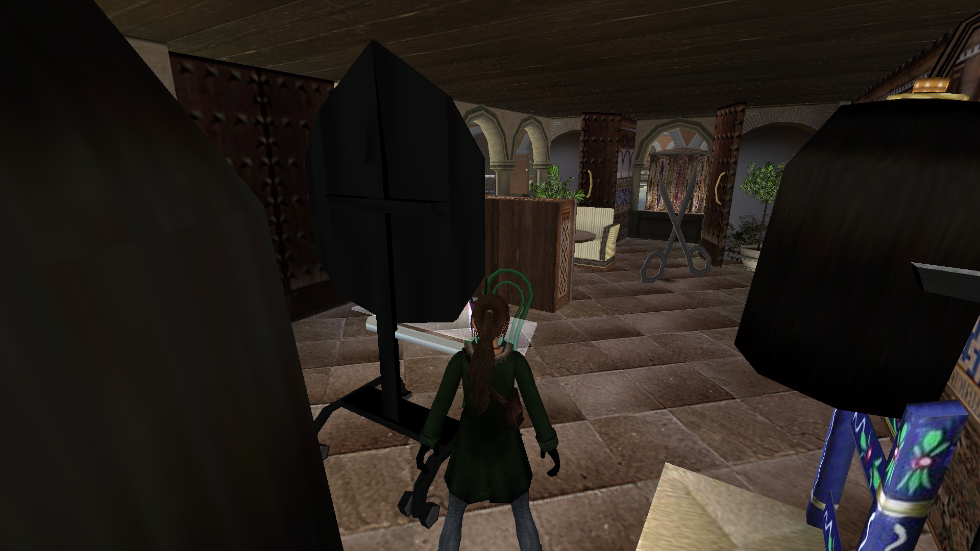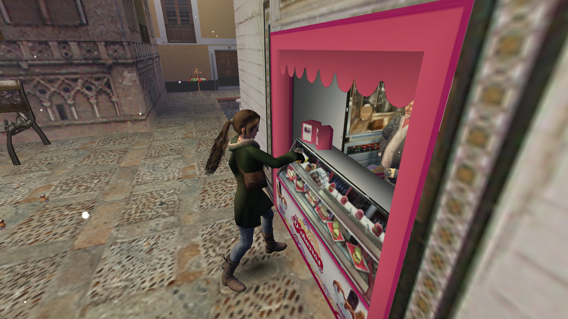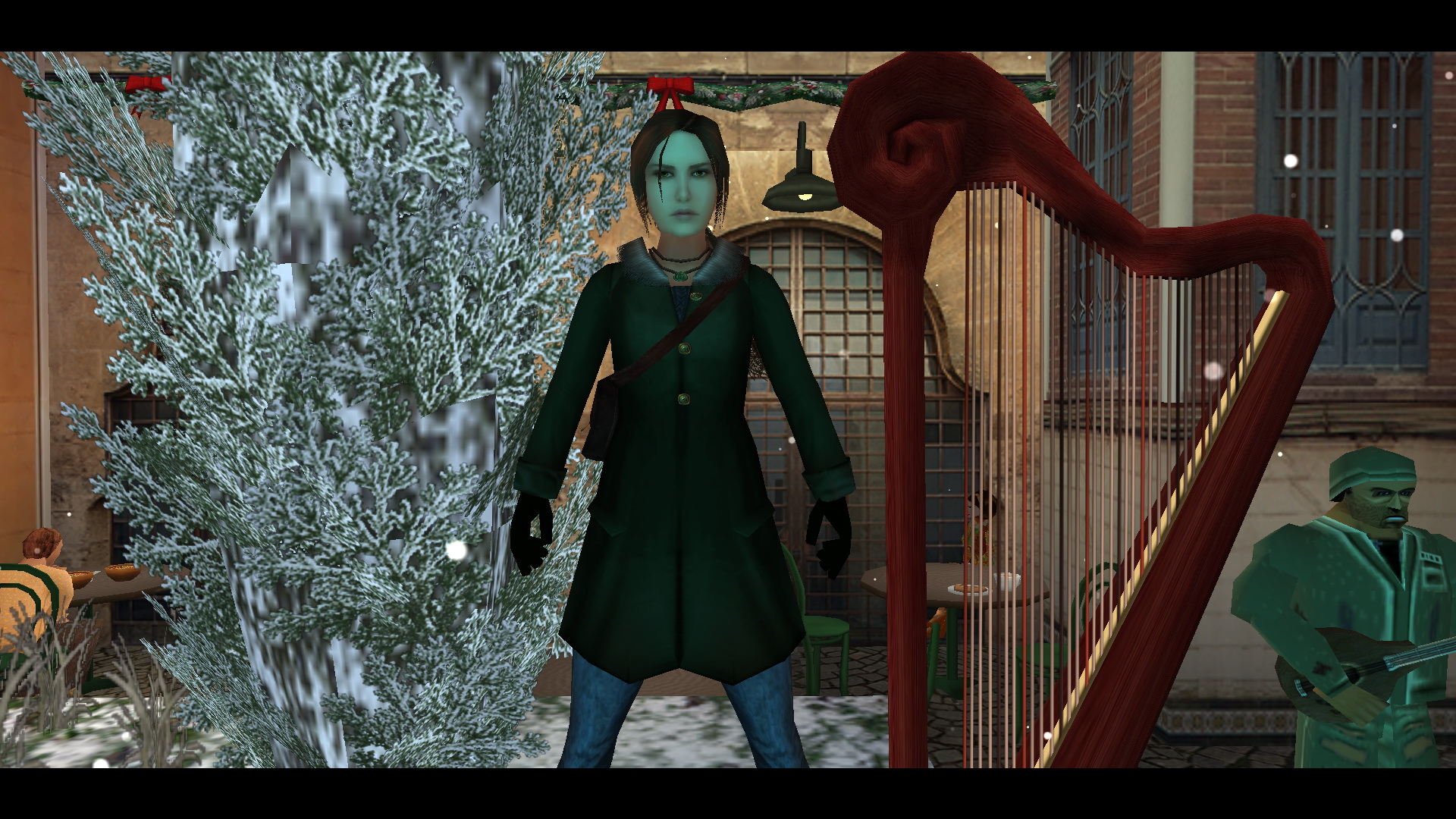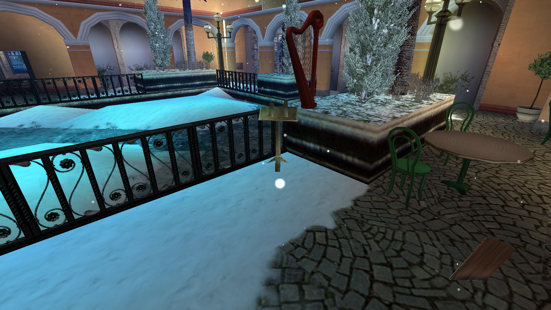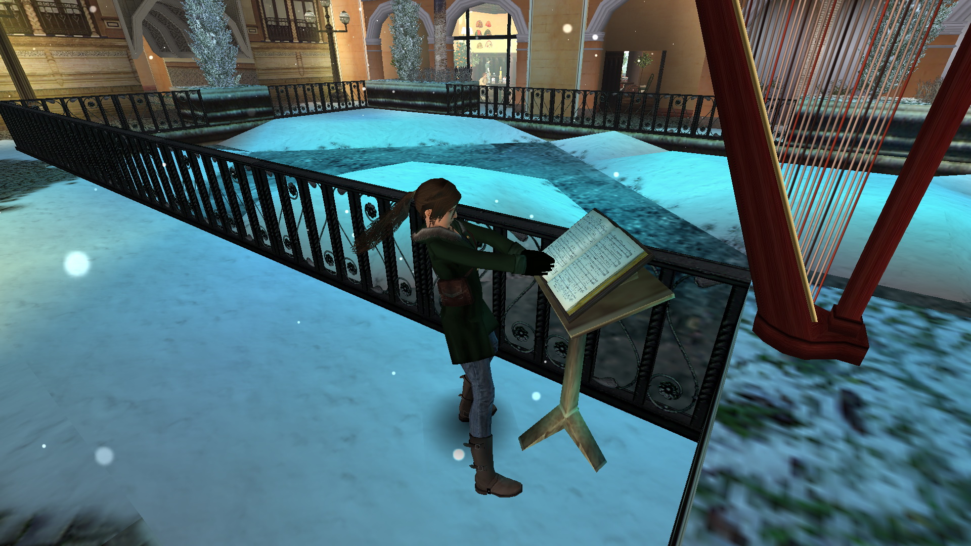 Menj végig az utcán, a végén jobbra, és ott is a végén balra, húzd meg a fali kart. Menj be a nem messze kinyílt ajtón, és a pult mögött is húzd meg a kart. Menj visszafelé az utcán, be jobbra a kinyílt festményboltba, és ott is húzd meg a kart a falon. A szemközti könyvesboltban is ugyanez a feladatod, majd a szép, kékcsempés boltban is. Menj vissza a legelső, és a második karhoz, és újra húzd meg őket. menj vissza a kékcsempés bolttal szemközti kávézóba, a kis emelvényről vedd fel a süteményt, menj át a szobán, ki a jégpályára, a túloldalán megnézheted a hárfa előtt a kottatartót, ide kell majd hozni a kottát, ha megszerezted. Most az asztalról vedd fel a Small Waterskin-t.