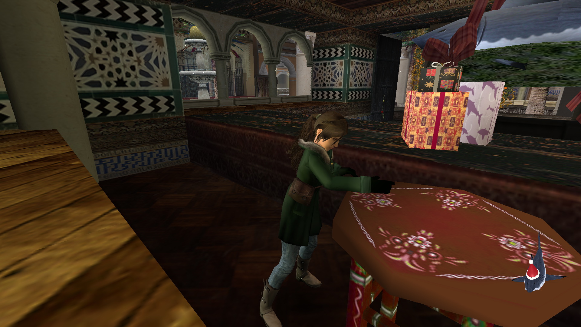 Menj előre, a túloldalon a nagyteremben fel az emeletre, balra el a lépcső mögött, végig a folyosón, és nyomd meg a fali gombot. menj be a kinyílt ajtón, és a télapó mellett jobbra feszítsd ki a faajtót. A földről vedd fel a Some Euros-t.
