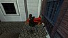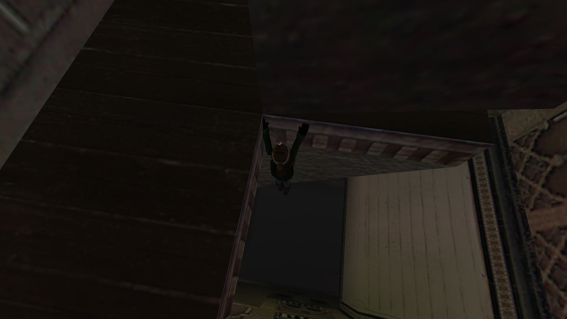 Ugrás a lezuhant ládára. Balra ugrás az emeletre, és nyomd meg a fali gombot. A ládáról most ugrás fel az erkélyre, onnan a másikra, majd balra a következőre. kapaszkodj fel a tetőre, onnan balra a kialudt tüz helyére, ott felveheted a fegyveredet, a Pisztoly-t.