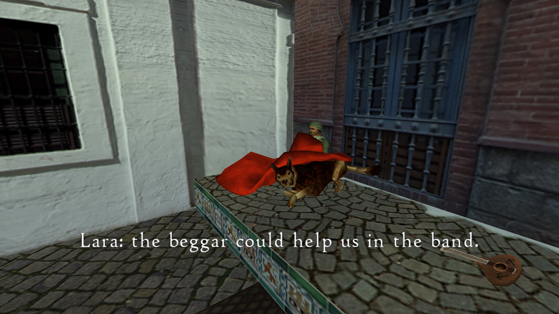 Gyorsan fordulj meg, mert időre megy a feladat, juss fel az állványra, onnan a magasabbra, onnan balra a felemelt fali platformra, és onnan fel az ablakba. Ugrás a törött oszlopra, onnan vissza a másik fali beugróba. Kapaszkodj le, és csimpizz balra, a mások beugróba. irány megint a következő törött oszlop, majd vissza az utolsó beugróba, ahol meghúzhatod a fali kart. Ugrás a megjelenő kötélen át a túloldalra, és ott is húzd meg a fali kart. Ess le a földszintre, és menj ki az oltár előtt jobbra, a szabadba. Menj be mindjárt jobbra a szobába, és ott balra, a sarokban kapaszkodj fel az emeletre. Az asztalról vedd fel a narancsot, menj tovább, és ugrás át a túloldalra, ahol egy újabb kart húzhatsz meg. Ereszkedj le a földszintre, menj vissza a templomba, de még ne menj le a mélybe a lement padlónál. Menj inkább balra, ki a templomból ki a Katedrálisból is, ki s kis térre, majd a nagy térre. Jobbra menj, el a hajléktalan előtt, be a számzárral védett épületbe. balra menj fel az emeletre, a lépcsőn kapaszkodj fel a plafonlétrára, csimpizz el a fali résig, és mássz be. Lődd ki a rácsot, jobbra bújj át a résen, húzd meg a fali kart, és a fali gombbal nyisd ki az ajtót. Add oda bent a fickónak a Dirhem-et, és kapsz cserébe, egy kis hangszert a Lute-t.