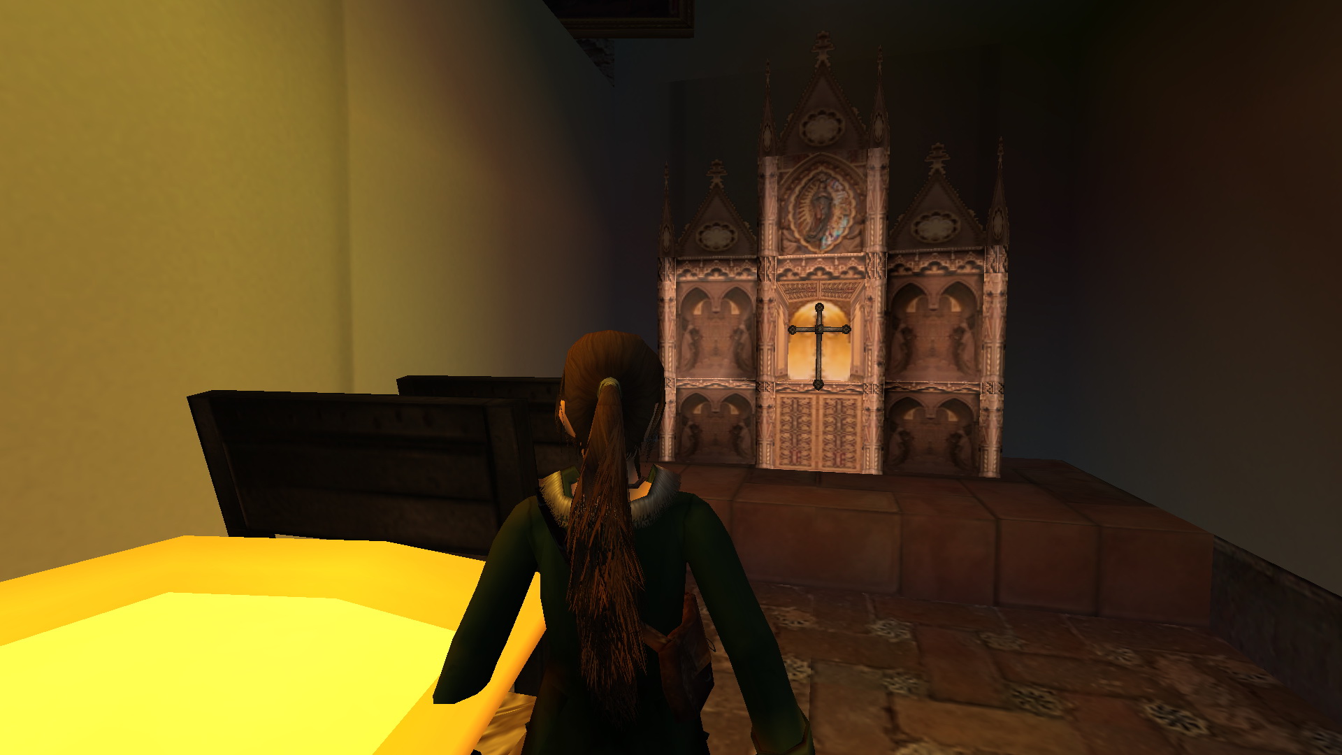 Továbbmenve mássz fel a létrán, és a kulcsoddal nyisd ki a rejtekajtót. Leereszkedve a kis terembe, öntsd a vizet a mérlegbe. Az oltárról vedd le a keresztet, a Holy Cross-t.