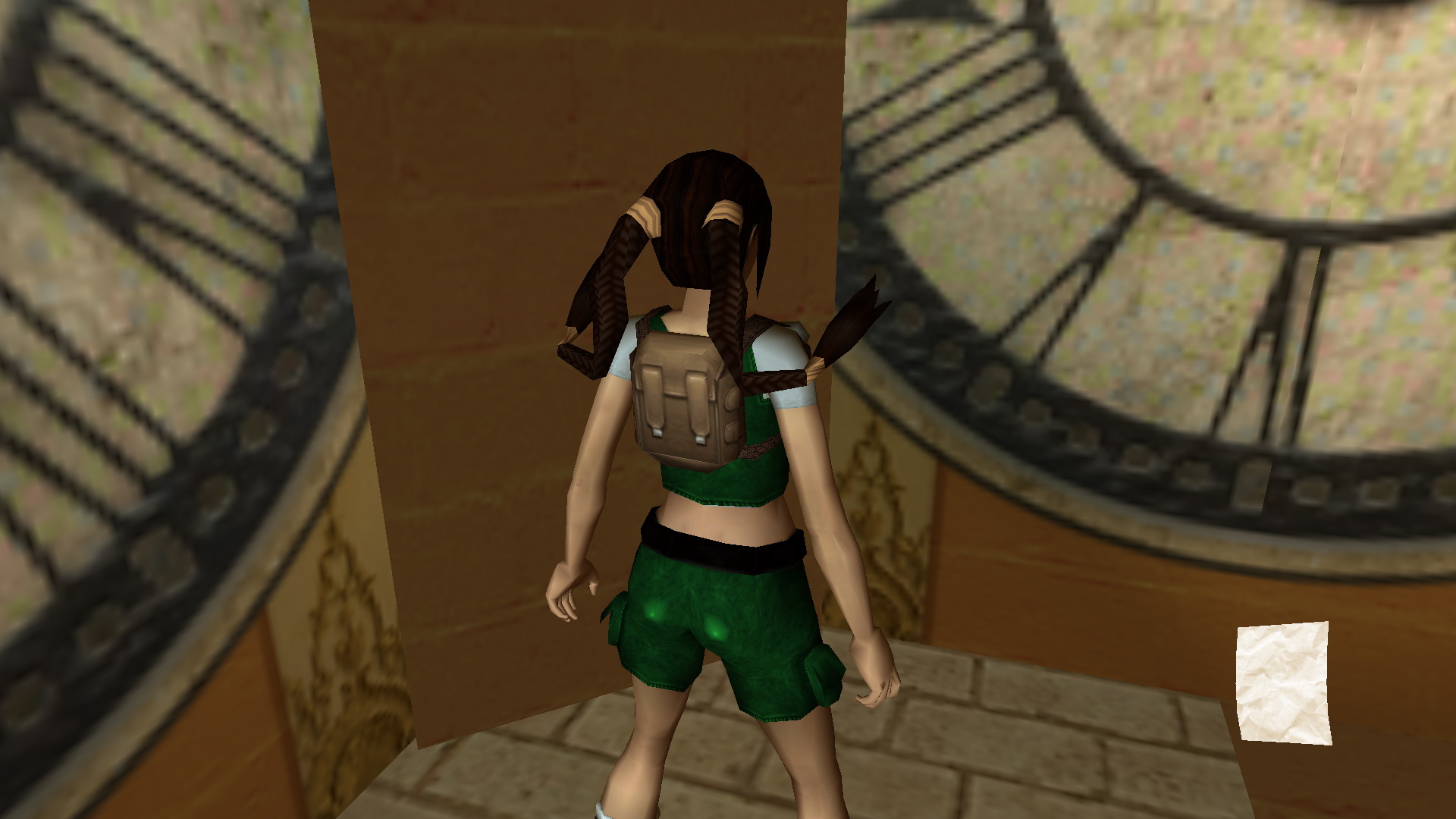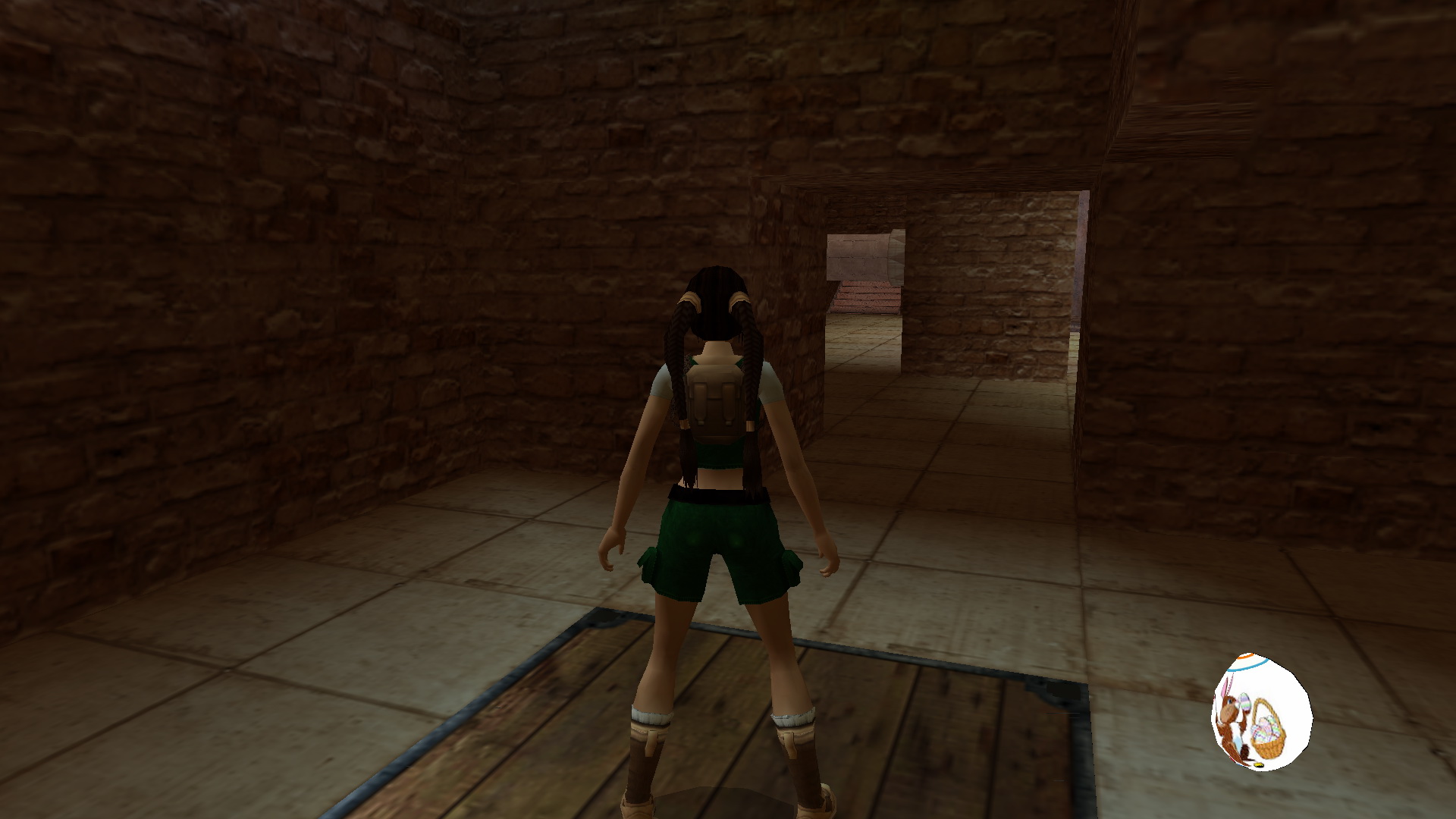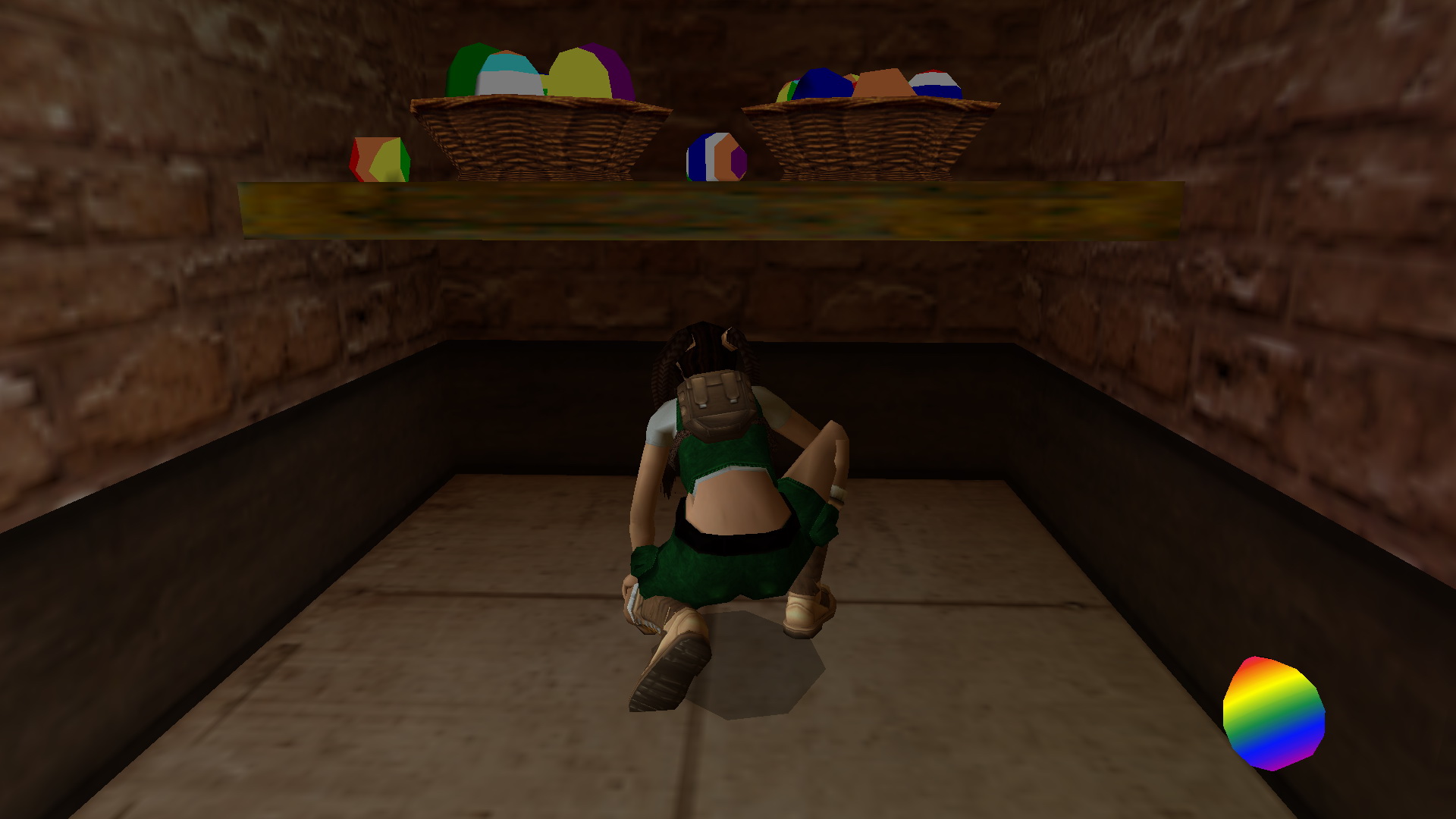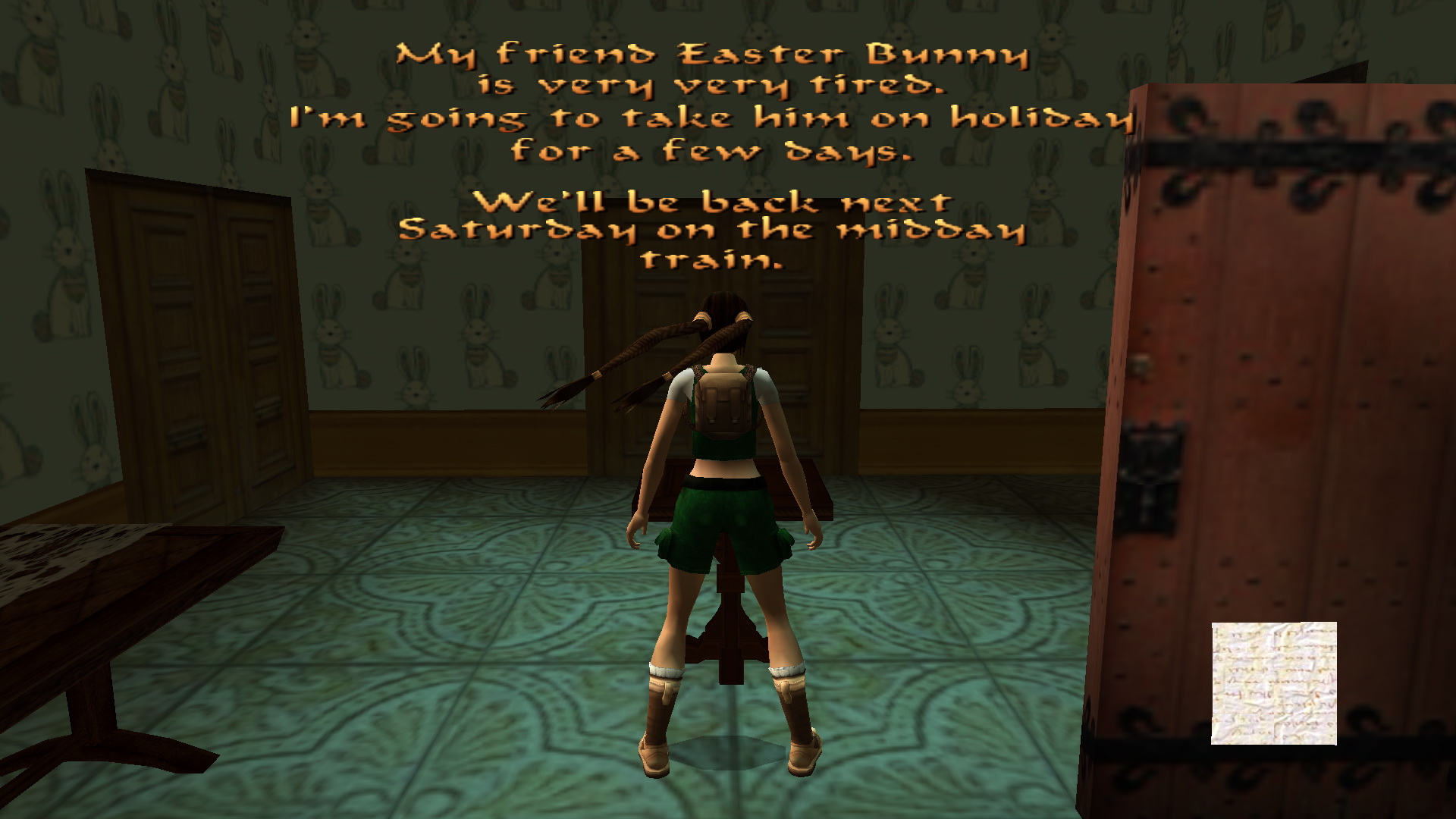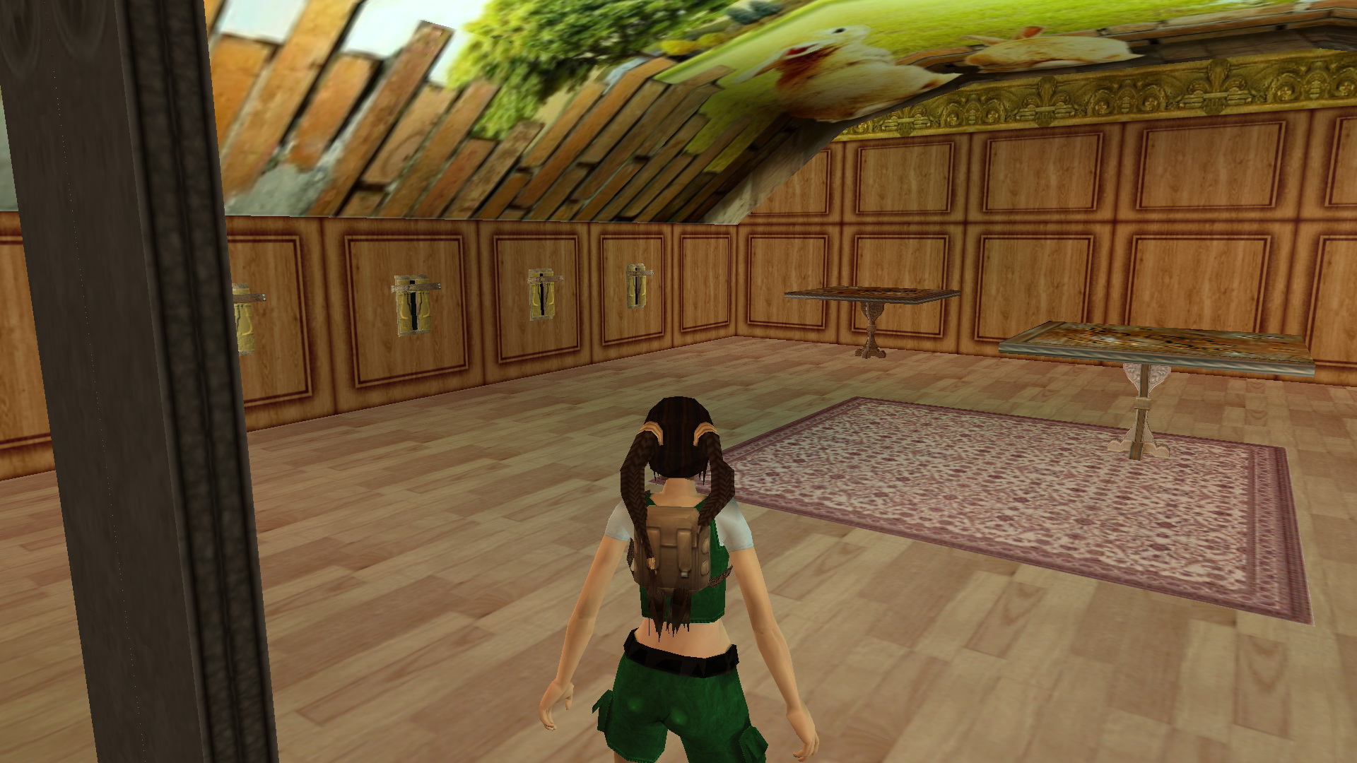 Menj vissza a térre, nyisd ki balra a nagyajtót, menj fel az emeletre, el a nyuszibácsi mellett, ki az erkélyre. menj jobbra, és most kapaszkodj fel a végén a fali résbe. A túloldalon kapaszkodj le, majd felugorva kapd el a tetőt. Csimpizz balra, és a saroknál egy fordulásos (+END) ugrással, vagy hátraugrással egy erkélyen landolsz. menj be a szobába.