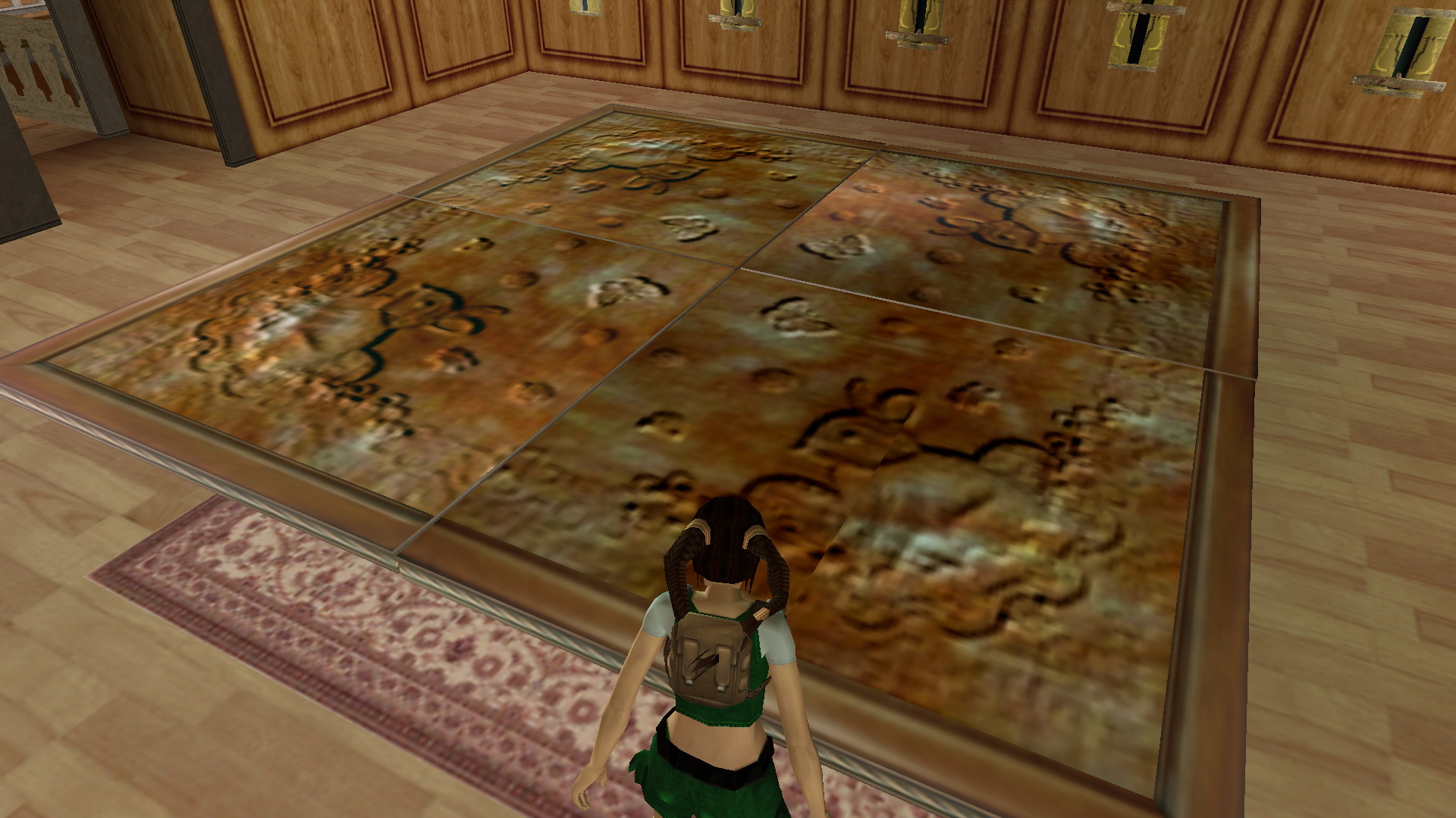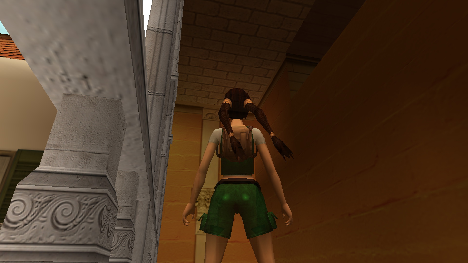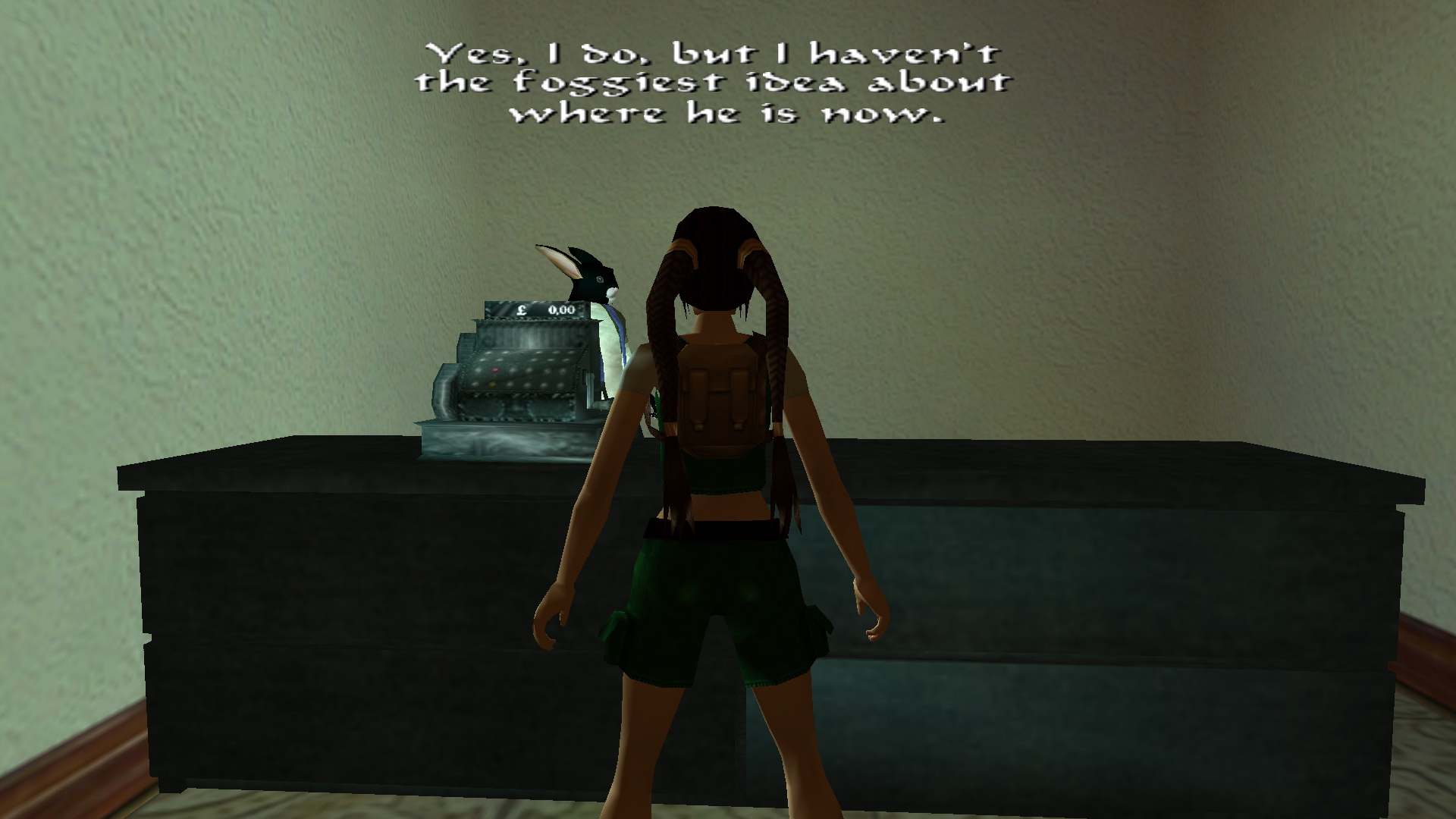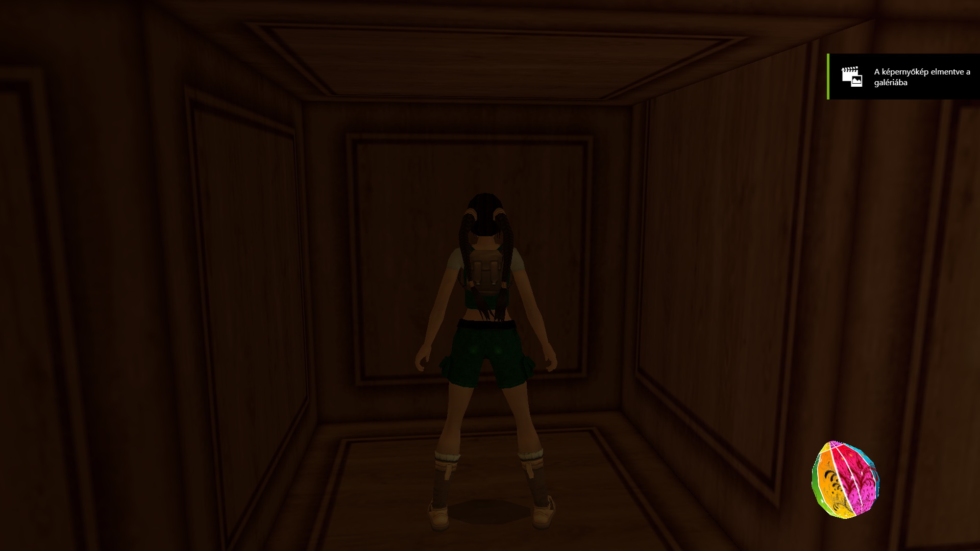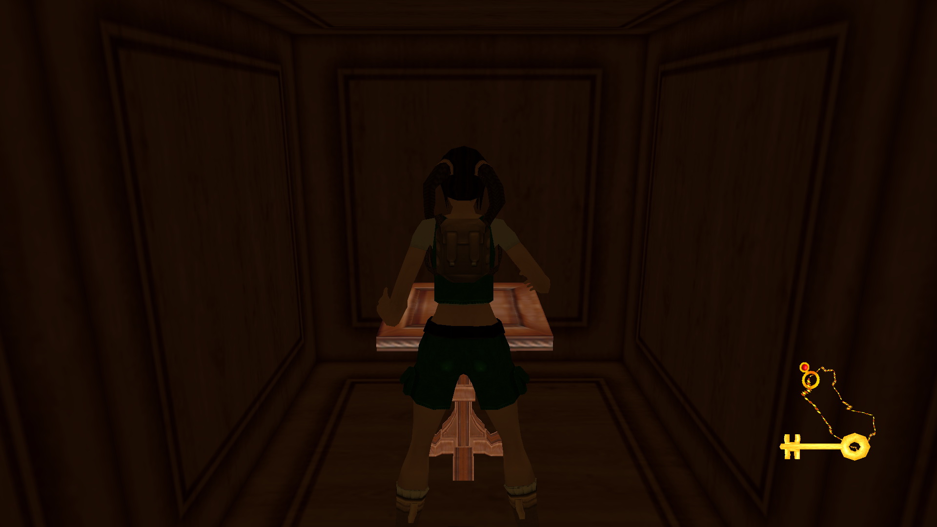 Menj vissza a térre, nyisd ki balra a nagyajtót, menj fel az emeletre, el a nyuszibácsi mellett, ki az erkélyre. menj jobbra, és most kapaszkodj fel a végén a fali résbe. A túloldalon kapaszkodj le, majd felugorva kapd el a tetőt. Csimpizz balra, és a saroknál egy fordulásos (+END) ugrással, vagy hátraugrással egy erkélyen landolsz. menj be a szobába.