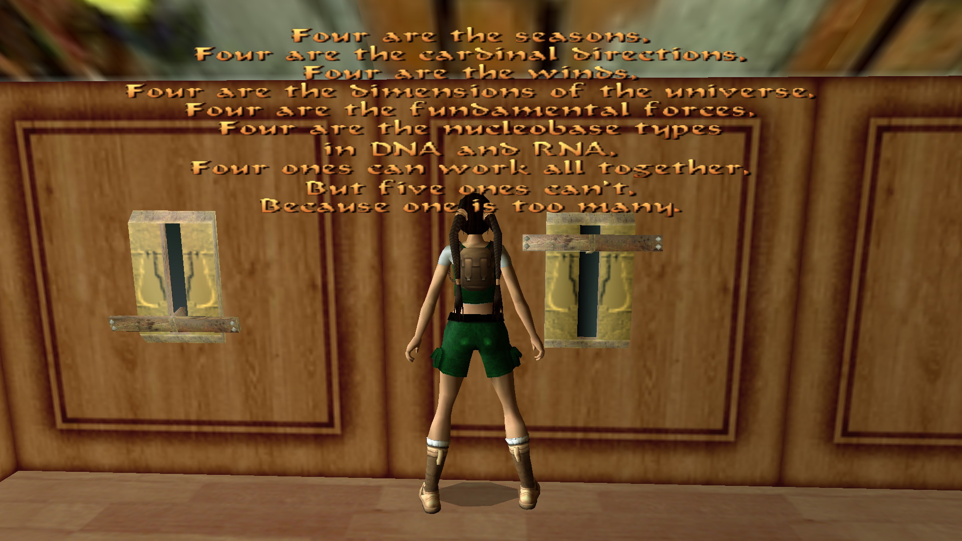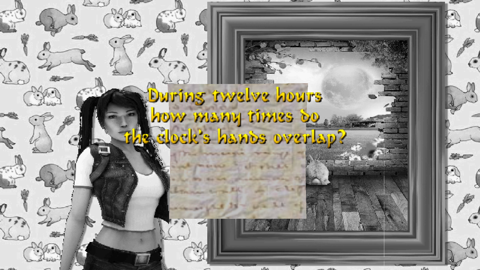Menj az épület mögé, és a sarokban, a fák mögött rántsd le a fali kart. Menj ki az utcára, jobbra, a téren be, és fel a nyuszipapához, ki az erkélyre, jobbra, kapaszkodj fel ismét a fali résbe, a túloldalon kapaszkodj le, csimpizz balra, ismét ugorj hátra az erkélyre, és menj be az asztaltologatós terembe. Menj a kis oldalszobába, ahol a tojásokat használtad, és jobbra mássz fel a létrán. Állj a számzárhoz, és a papírlap ad útbaigazítást, hogy mit kell beütnöd. 0-0-1-1-*