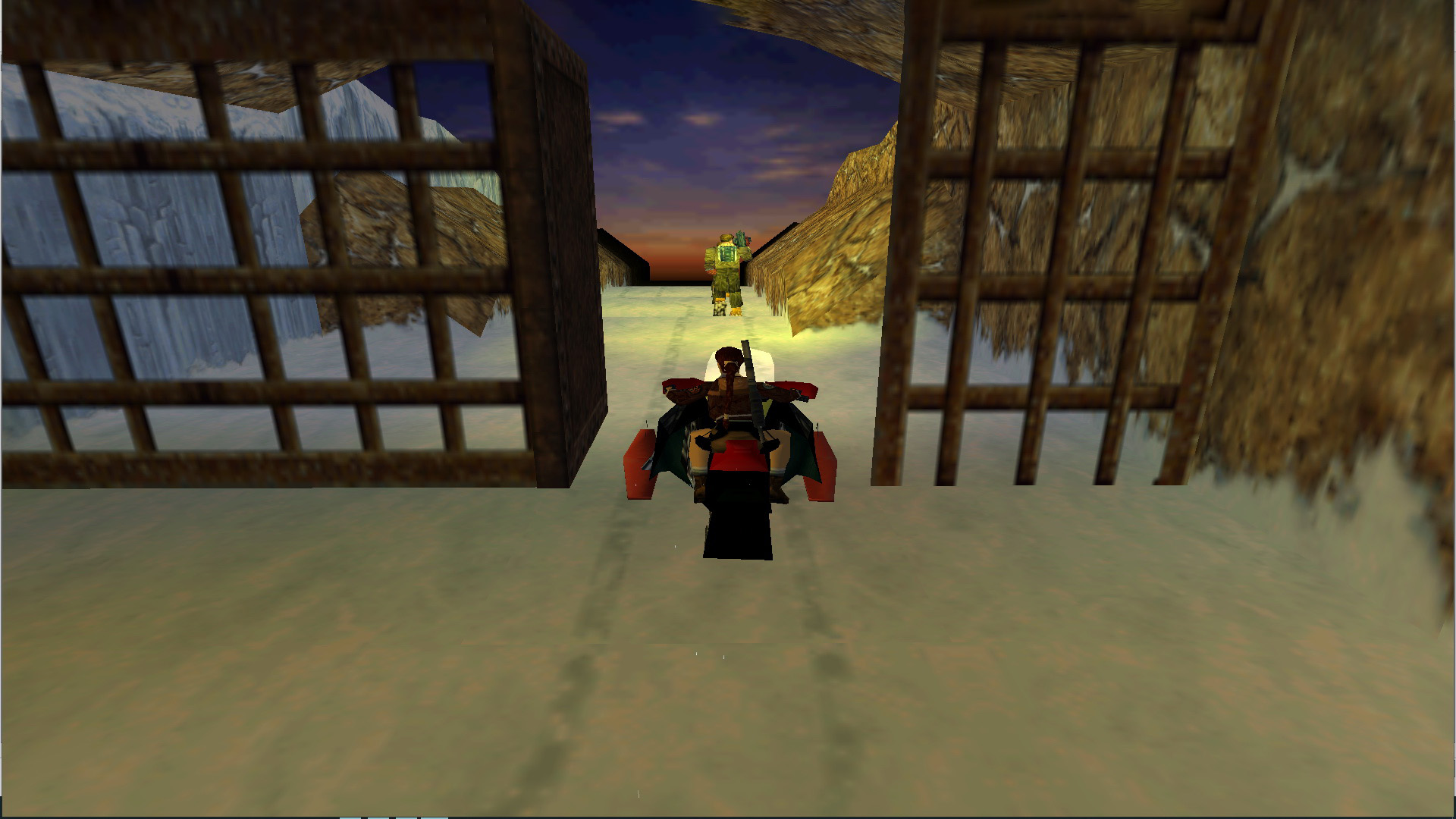 A végén felugorva kapaszkodj fel balra, Majd balra haladva, egy gödörben lőszereket találsz. Ugorj ki onnan, lődd le a fickót, és vedd fel a Snow Mobile Key-t.