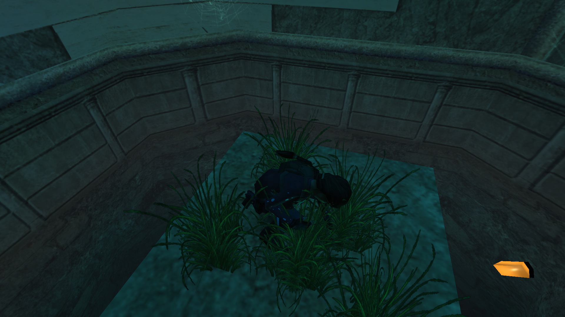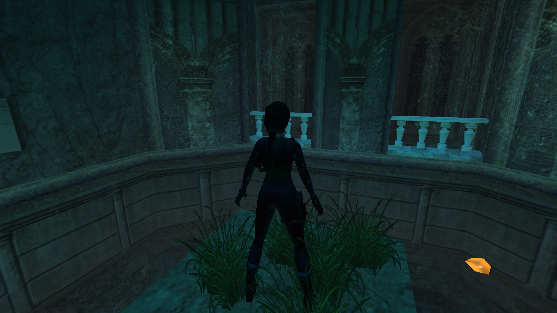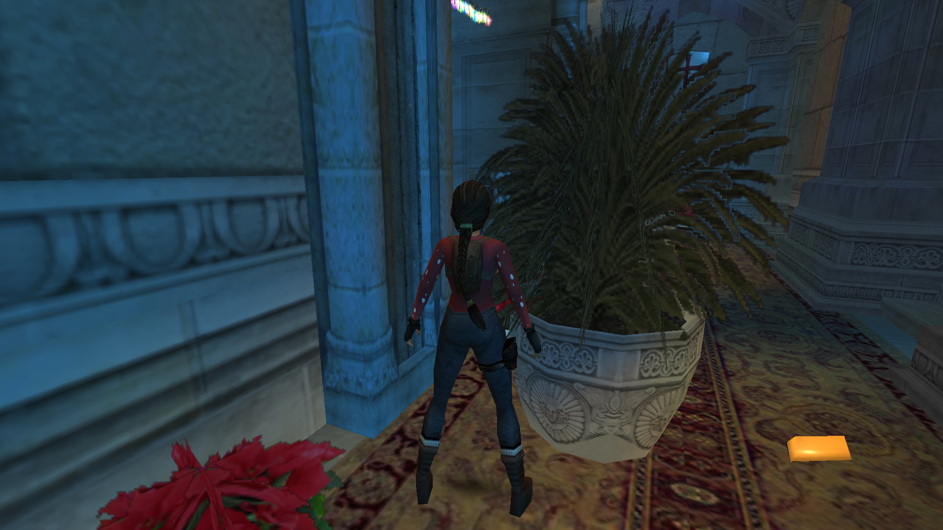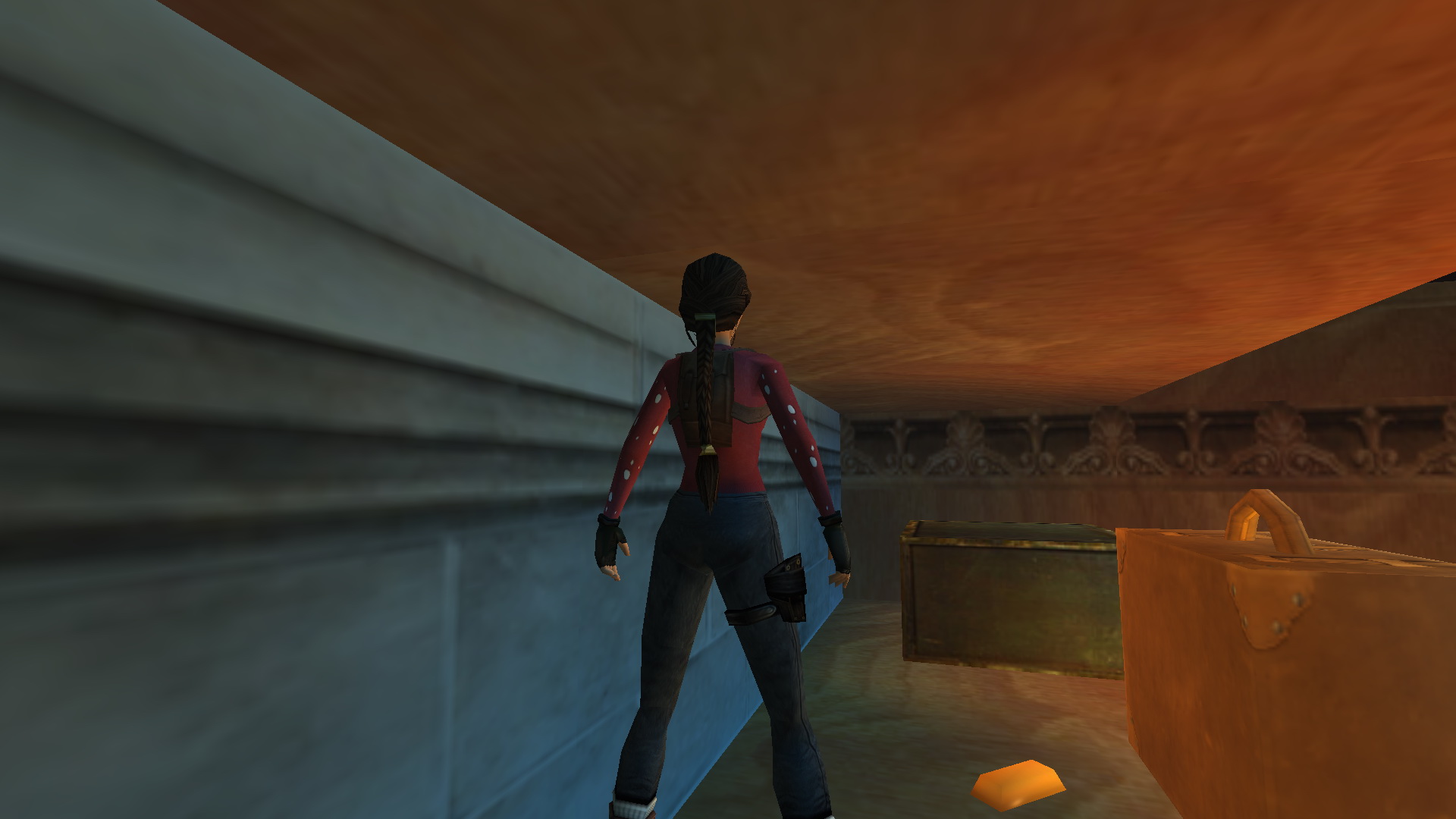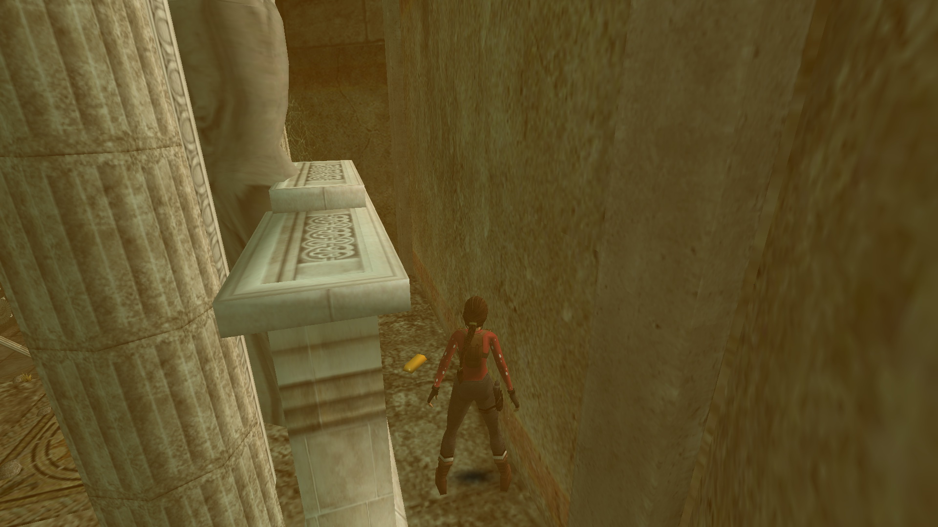 Menj át a kapun, jobbra juss el a rudakon keresztül a hídra, ott egy jobbra ugrással eljutsz még egy rúdon át a fal szélén levő párkányra. Fuss végig rajta, a túloldalon újra rúdugrás következik, a második után jobbra lődd szét a vázát, és medipack a jutalmad. Menj be középre, és lökd a mélybe a halszobrot. A fal mellett haladj tovább. Újabb rudakon ugrás után, egy kart tolhatsz meg, és beugorva jobbra a fali beugróba, megtaláltad a 13. Gold Bar-t, ez a 13. secret.