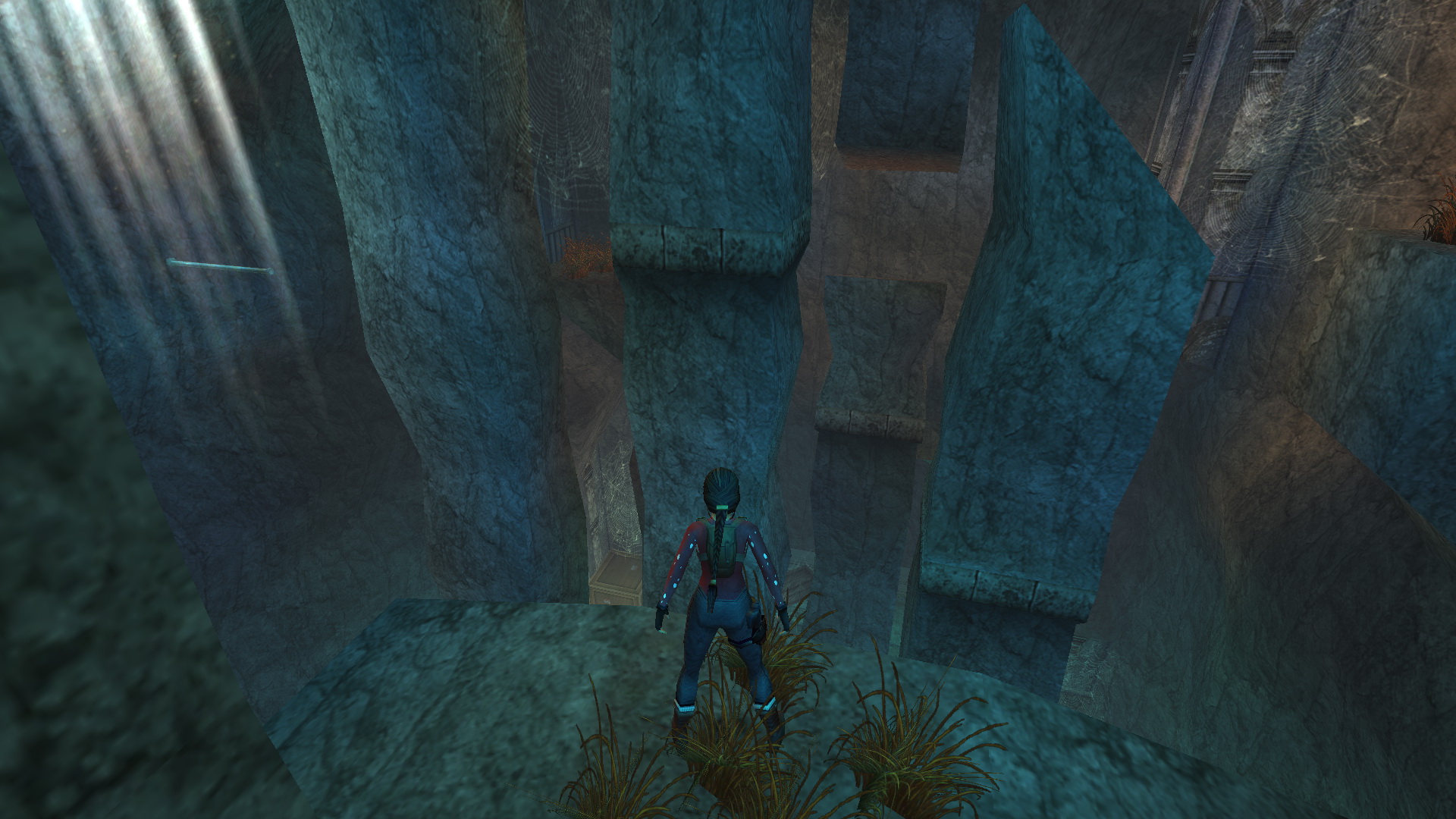 Továbbra is balra csimpizz, majd a végénél mássz le, ess le a sziklákra, fordulj meg, és felugorva kapd el a magasabban levő sziklát. Még feljebb jutva, menj át a nyitott nagykapun. Menj be, le a létrán az alsó szintre, és a fénylő tartályok flett lődd szét a rombusz jeleket, mindkét oldalon, és kinyílik a kapu. A fali beugrókba is juss fel, mert lőszert rejtenek.