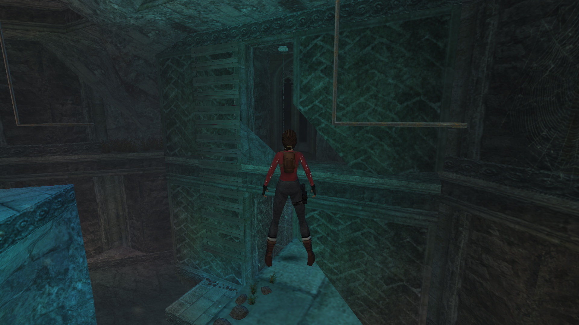 Menj ott tovább, kapaszkodj feljebb egy szintet, és jobbra a kar mögött szétlőve a ládát, lőszert vehetsz fel. Told meg a kart is, Juss vissza a létrához, mássz fel rajta. Itt nem tudsz feljebb kapaszkodni, tehát juss el a túloldalra, és ott már felugorva elkaphatod a felső szint peremét. Mássz fel, jobbra ugrás az oszlopra, a rést elkapva, kapaszkodj át a jobb oldalára, majd megnyomva a lefelé-t, elkapod megfordulva a mögötted levő oszlopot. Mássz fel, csúszás, ugrás, és bent vagy a kinyitott rács mögött. Juss egészen le, a túloldalon pedig fel. kapaszkodj fel a résbe, mássz át rajta, a túloldalon kapaszkodj le, Kicsit csimpizz jobbra, majd lefelé-t megnyomva, megfordulsz, és ráugrasz a rúdra, de közben nyomd a balrát is, akkor sikerülni fog. Onnan pedig tovább ugrás. Helyből ugorva kapd el a következő rudat, majd ugrás a fali beugróba. Lökd a sziklát a lyukba, és mögötte egy másik hatalmas terembe értél. Ugrás a rúdra, onnan az oszlopra, majd a másik rúdon át eljutsz a túloldalra. Mássz fel a létrán, de csak a világos csíkig, ott kapaszkodj balra, a sarkon befordulva pedig egy fordulásos hátraugrással a párkányra értél. Onnan a rúdon át eljutsz az oszlopra, onnan balra a másikra, onnan pedig egy nekifutásos ugrással juss el balra, a párkányra, beugróba, ahol egy láncot húzhatsz meg.
