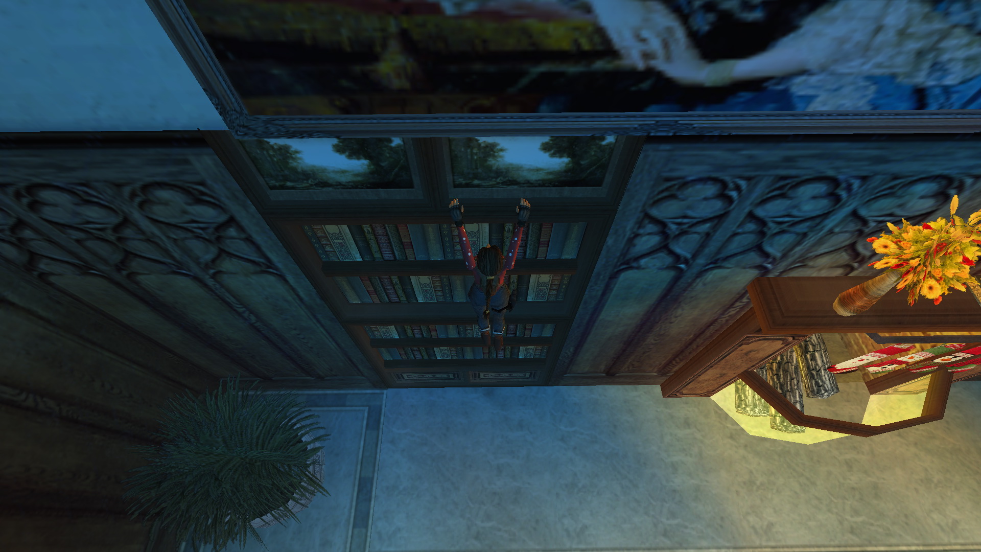 A terem túloldalán, balra a kandalló mellett, kapaszkodj fel a könyvespolcra, majd feljebb ugorva kapd el a képkeretet. csimpizz balra, körbe a termen, a sarokban ugrás feljebb, és amikor a fali kar fölé érsz, ess le, és rántsd le. Újra kapaszkodj fel a könyvespolcra, majd a képre, de most jobbra indulj el. Még feljebb kapaszkodva is csimpizz jobbra tovább, a második fali platform után ess le egy szintet, ott folytasd az utadat továbbra is jobbra, az üvegablak fölött ismét feljebb ugorva mehetsz tovább, és amikor elérsz a fali kar fölé, ess le, és rántsd le azt is. Oldalt kinyílt egy ajtó. menj végig a folyosón, és a következő ajtót nyisd ki. Az ebédlőbe értél. Jobbra a fal melletti kis szekrénykén medipackot találsz, a másik oldalon pedig lőszert. A két asztalsor között, tedd a projektorba a videókazettát. Jól figyeld meg a vetítő képet, mert ott a kód ami kell neked.