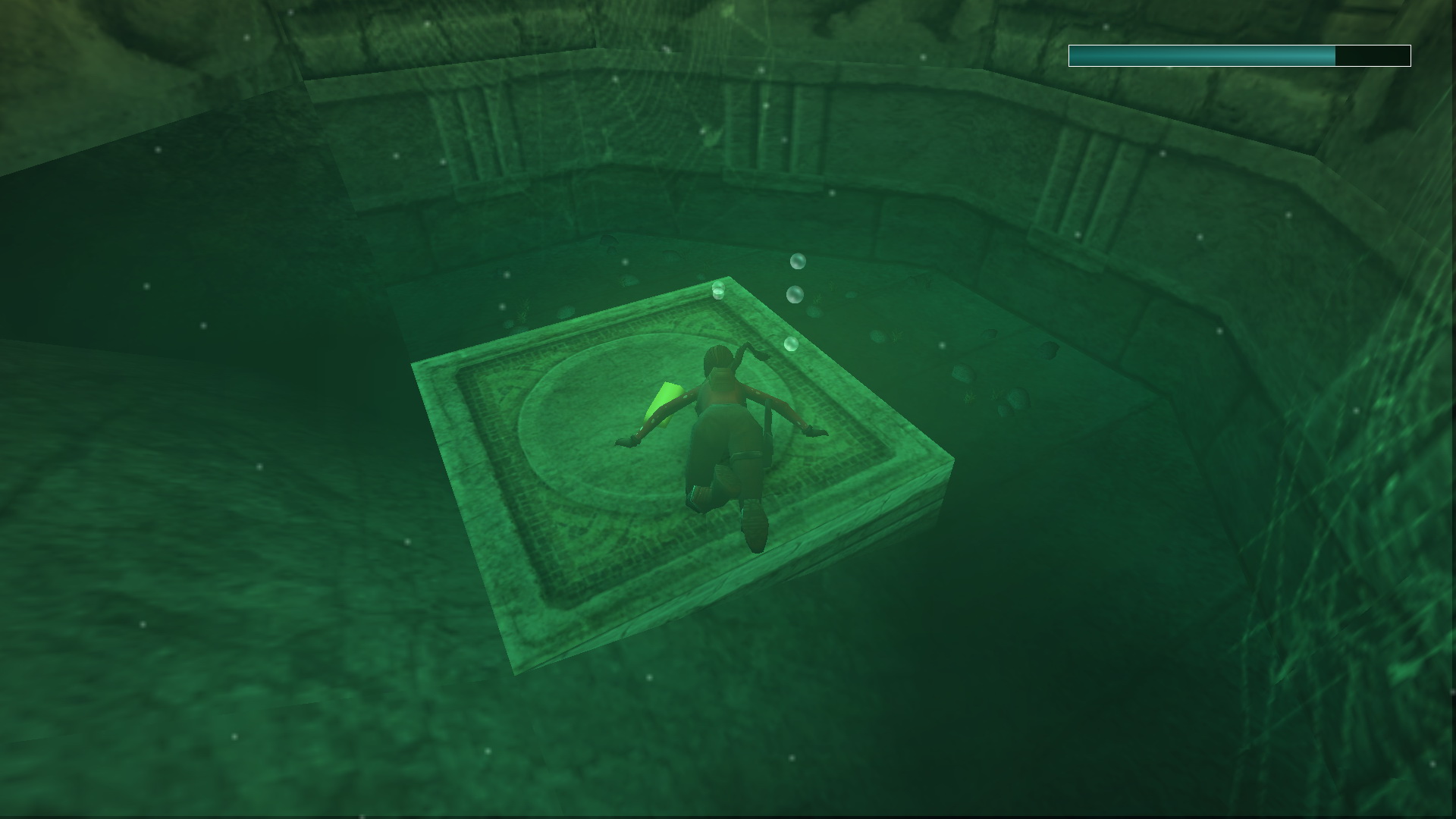 Told meg a szobor előtt a kart. Lent kinyílt a nagy zsilip, most lett igazán vihar, szél a teremben. Menj ki a karzatra, és nekifutásból ugorj a lentről feláramló viharos szélbe. Az felrepít, és a felső szintre érsz. Menj a folyosón végig, kiérve a nagyterembe, ne told még meg a kart. Ugorj a vízbe, ússz jobbra, a falmentén, és hátul beúszva egy beugróba megtalálod a 15. Gold Bar-t, ez a 15. secret.