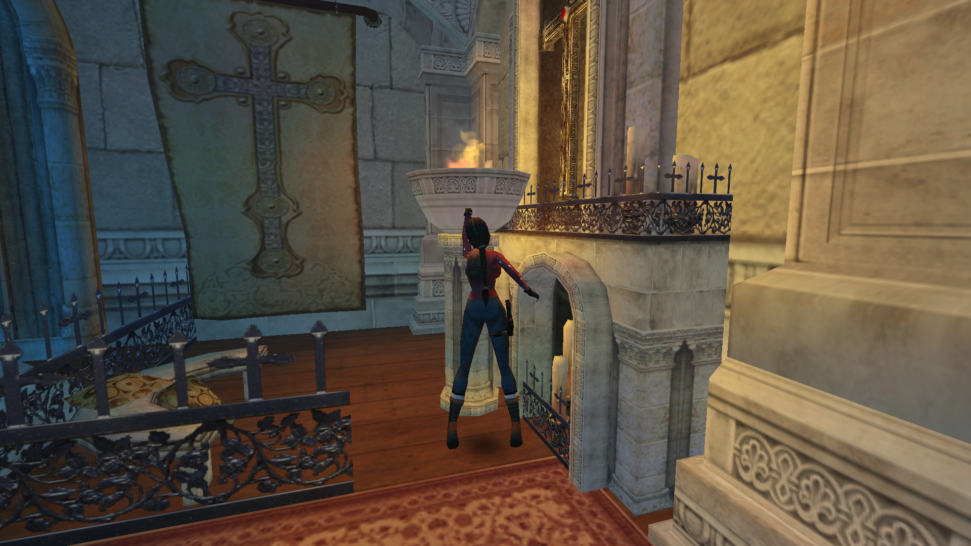 Ússz vissza, mássz a partra, és most told meg mindkettő kart. Jobbra menj le a lépcsőn, ugrás az első oszlophoz, a mellette levő tömbre, onnan fel oldalt a platformra, fel a tetejére, onnan pedig balra a nyitott ajtóhoz. Bent lődd szét a vázákat, az egyik medipackot rejt, majd húzd meg a láncot is. Ugrás vissza az oszlopra, juss le róla, ugrás át a másikhoz, és ott is juss fel a tetejére. A forgó tűzre vigyázz. Itt is ugorj át a nyitott ajtóhoz, de ne akard elkapni a peremet, csak ugorj nekifutásból. Jobbra húzd meg a láncot, majd vissza az oszlopra, és juss le róla. A harmadik oszlopon is fel kell jutnod, ez a legnehezebb a sok forgó tűz miatt. Az oszlop alatt, a vízben medipackokat találsz egyébként. Ha sikerült, ugrás át itt is az erkélyre, de még ne menj be az ajtón. Menj balra, az erkély végén ugrás balra a tetőre, de a fehér részre érj, így lecsúszva elkapod a peremét. csimpizz balra, a tetőnél mássz fel, és megtaláltad a 16. Gold Bar-t, ez a 16. secret.