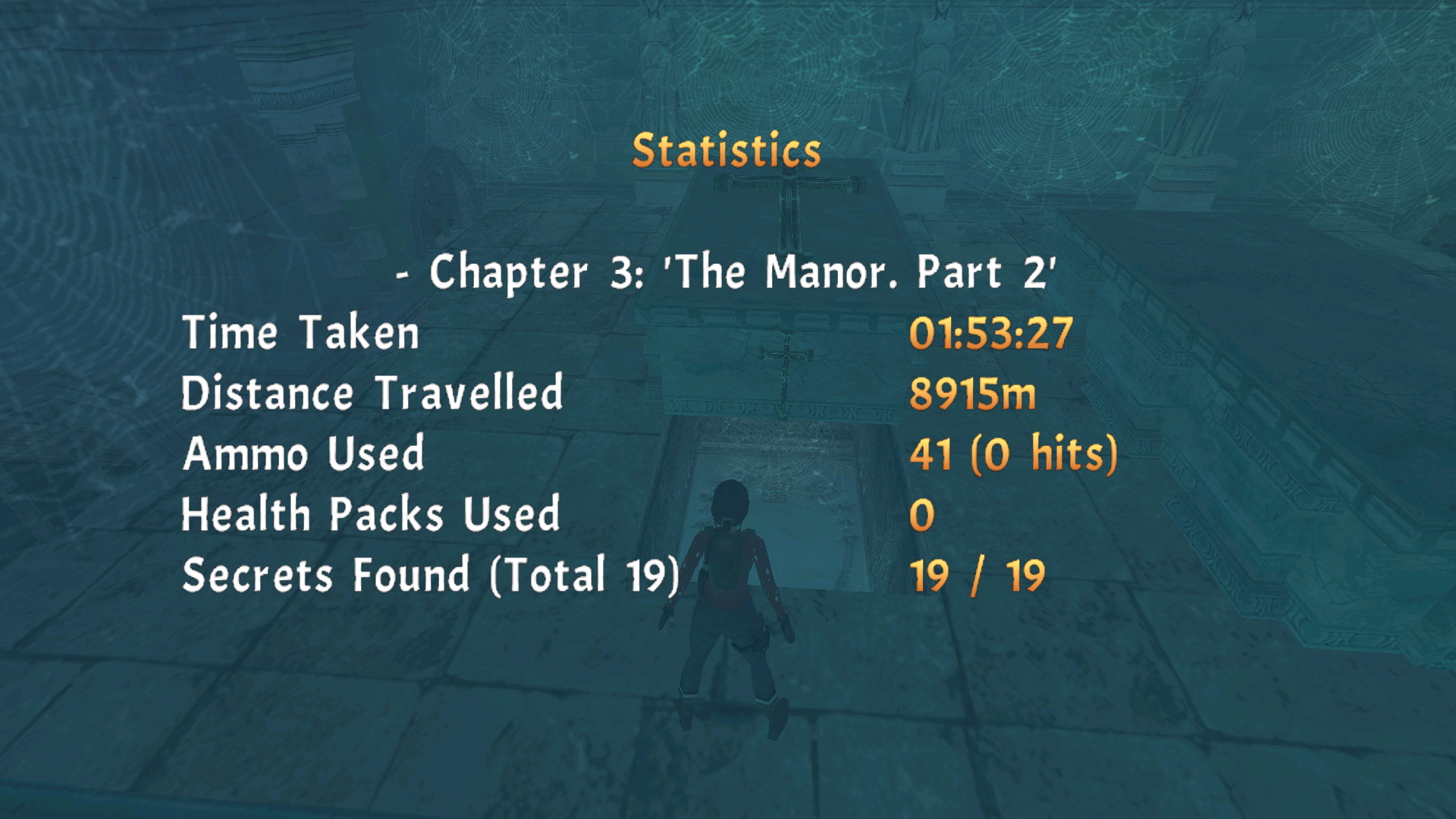 Lődd szét a vázákat, az egyik alatt lőszert találsz, és kettő váza egy-egy gyertyát. az egyiket vedd fel, és menj ki innen, egészen vissza a lépcsőházba. Menj balra, és a karácsonyfa mögött át a nyitott ajtón. Menj balra, fel a lépcsőkön, és a teremben, az ajtók felett, balra, és szemben egy-egy szétlőhető gombot látsz. Lődd szét őket, a kandallónál gyújtsd meg a gyertyádat, majd menj vissza a lépcsőházba. Ismét a lépcsők mellett jobbra, le amerre a gyertyát találtad, és a szétlőtt vázáknál gyújtsd meg mind a négy álló edényt. Menj át a kinyílt nagykapun. Le a lépcsőn, és a jobb oldali kripta mögött, a földön megtalálod a 19. Gold Bar-t, ez a 19. secret.